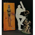 An Iron sheet pub or club sign as a Cricketer Batsman at full Stroke, 63.5cm high; a cast iron Cherub door porter , 41cm high; P Vacca , a modern Brutalist figure as a stylised Warrior with shield and fork, pine wall plaque mount, 60cm high overall (3)