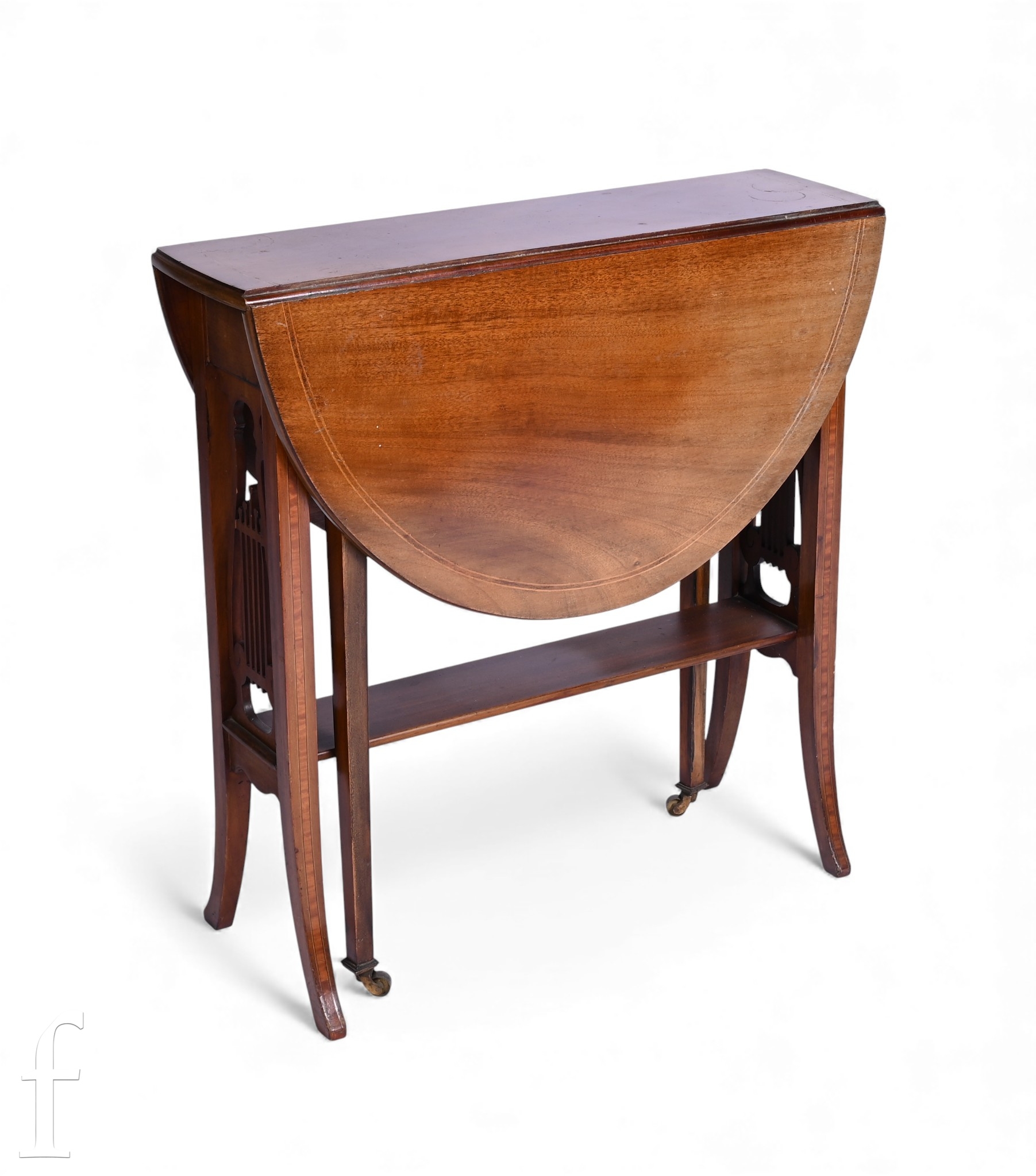 An Edwardian line inlaid oval drop flap mahogany Sutherland table on splayed legs united by an undertier, width 60cm.