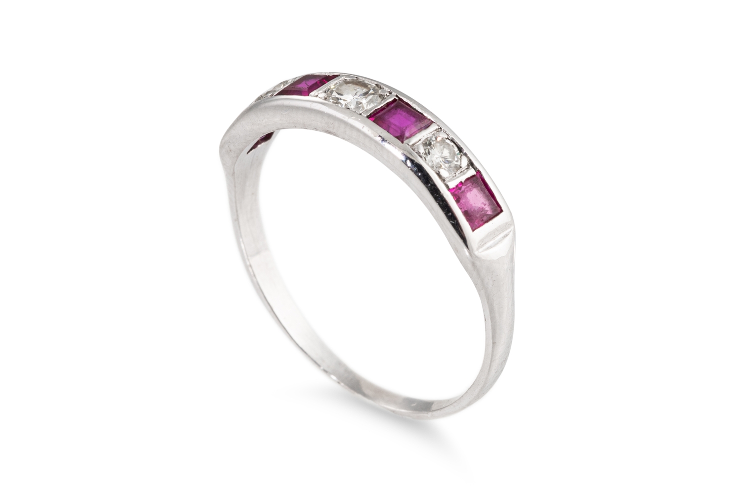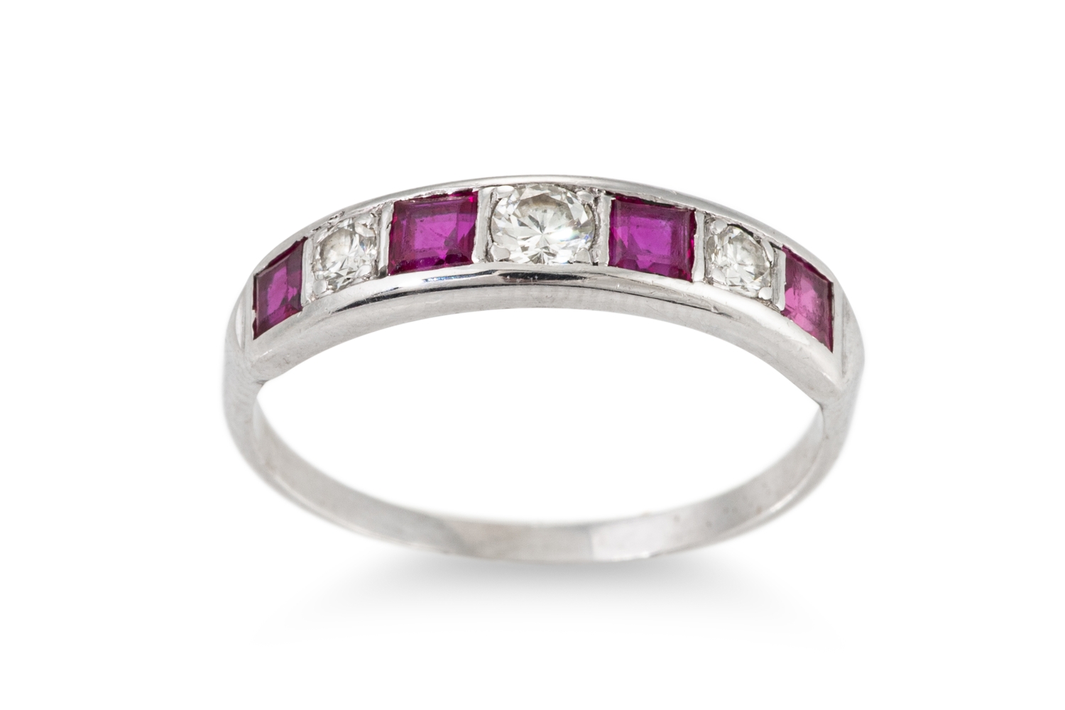 A DIAMOND AND RUBY SEVEN STONE RING, mounted in 18ct white gold, size S-T
