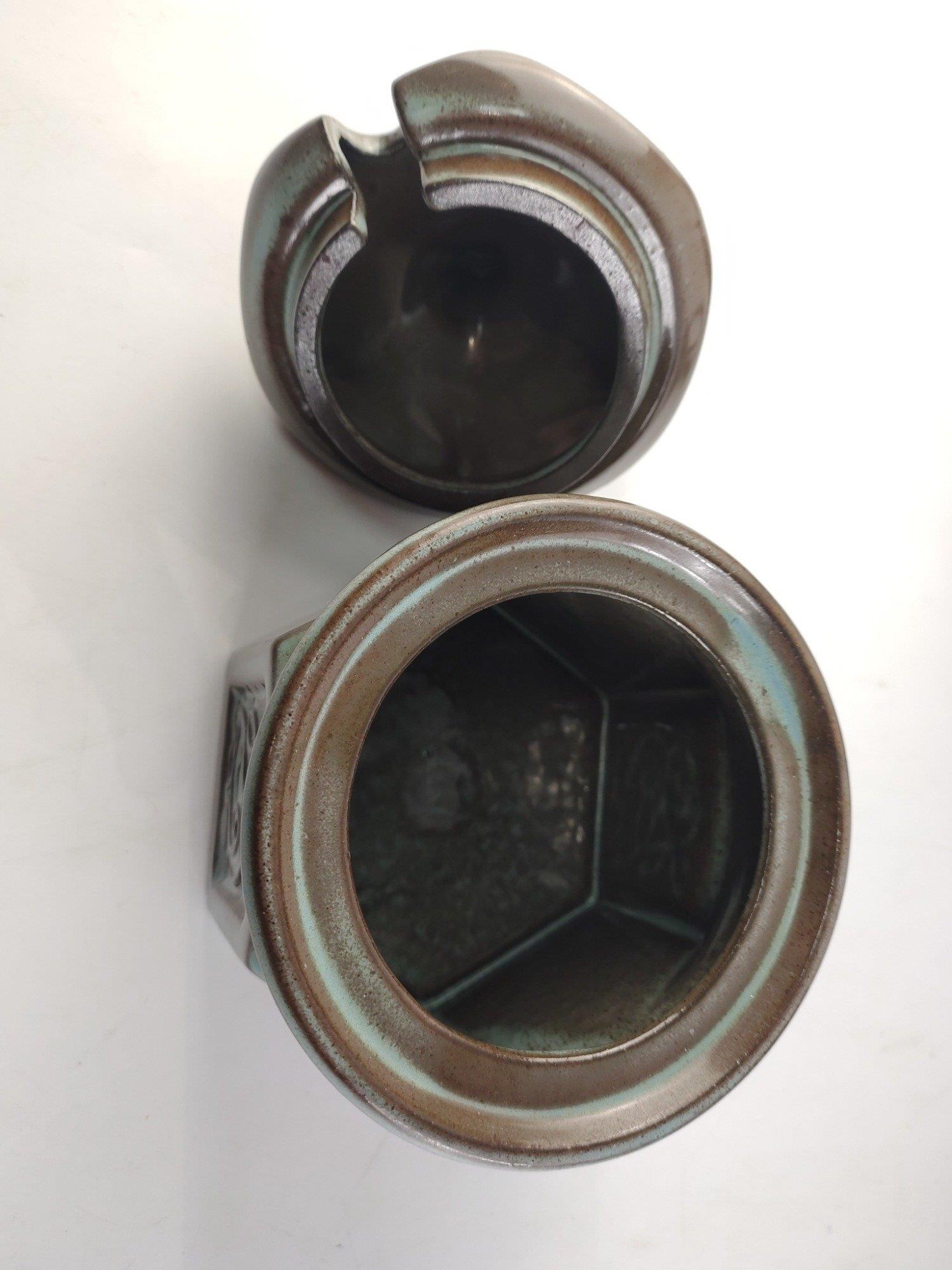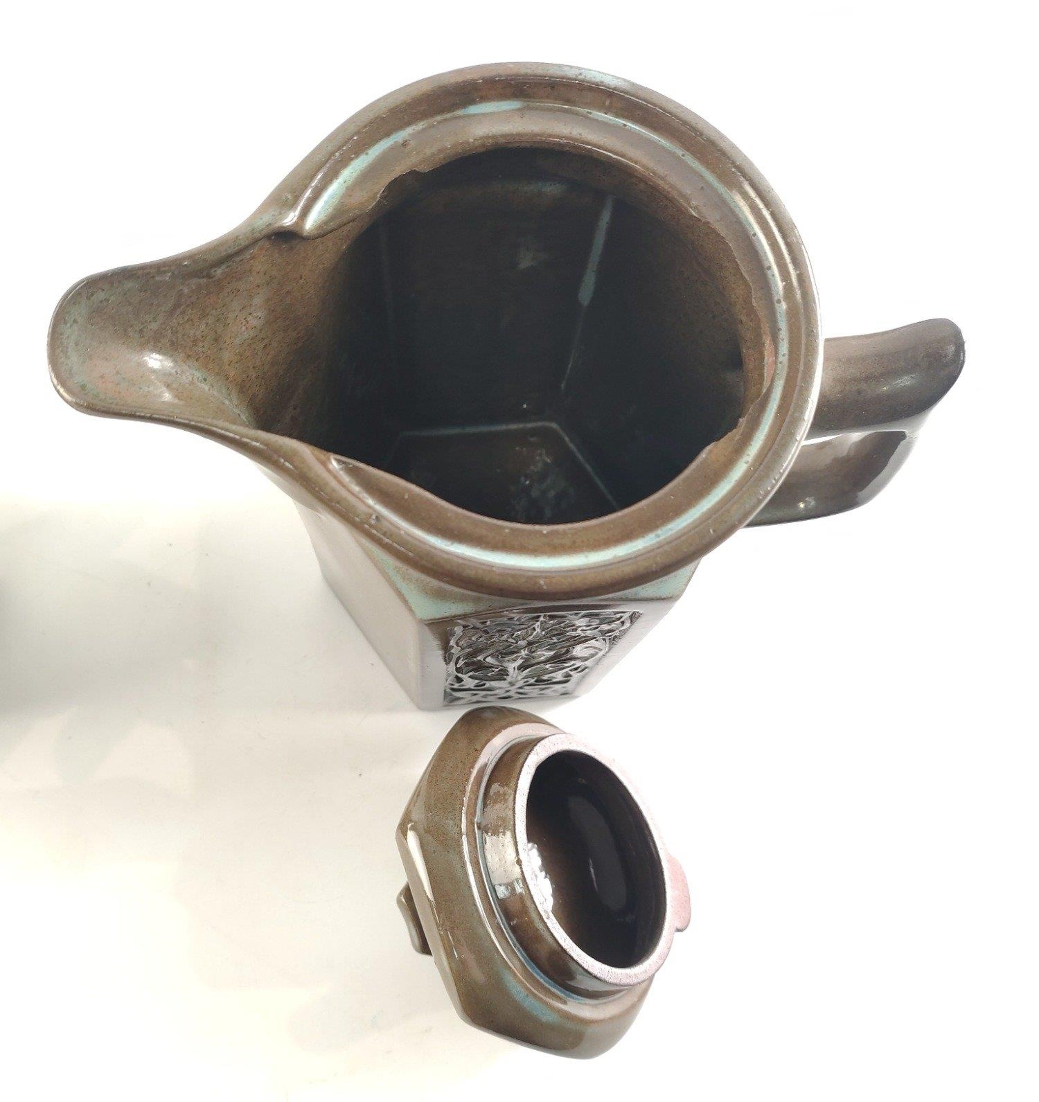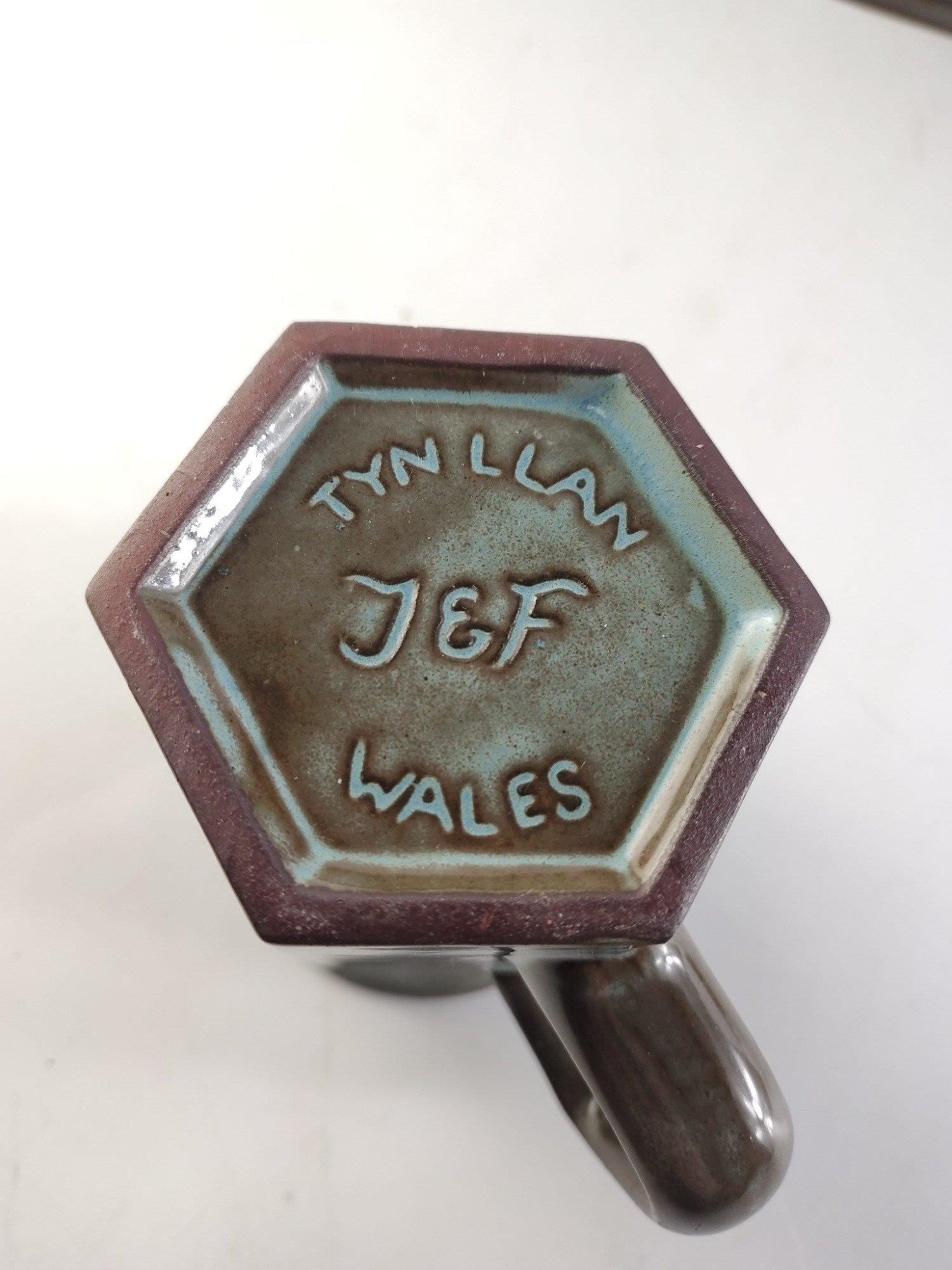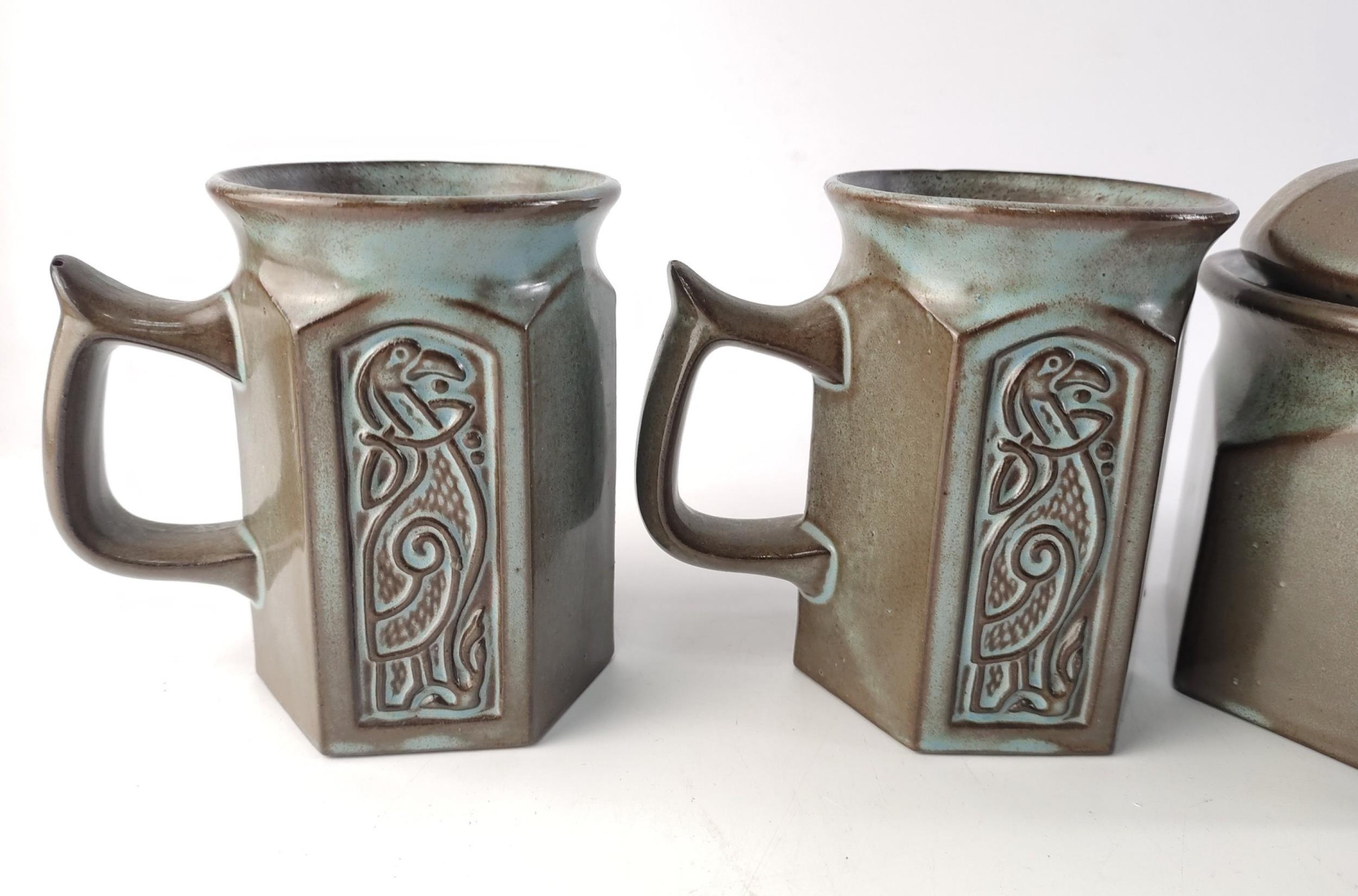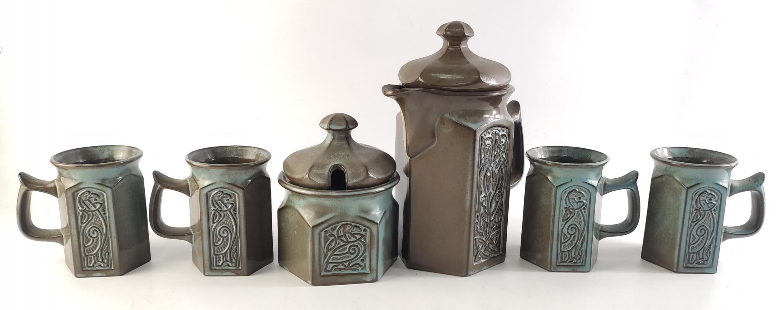 A vintage TYN LLAN Welsh pottery griffin design set comprising 4 mugs, coffee pot and sugar bowl. Slight damage to inner rim of coffee pot.