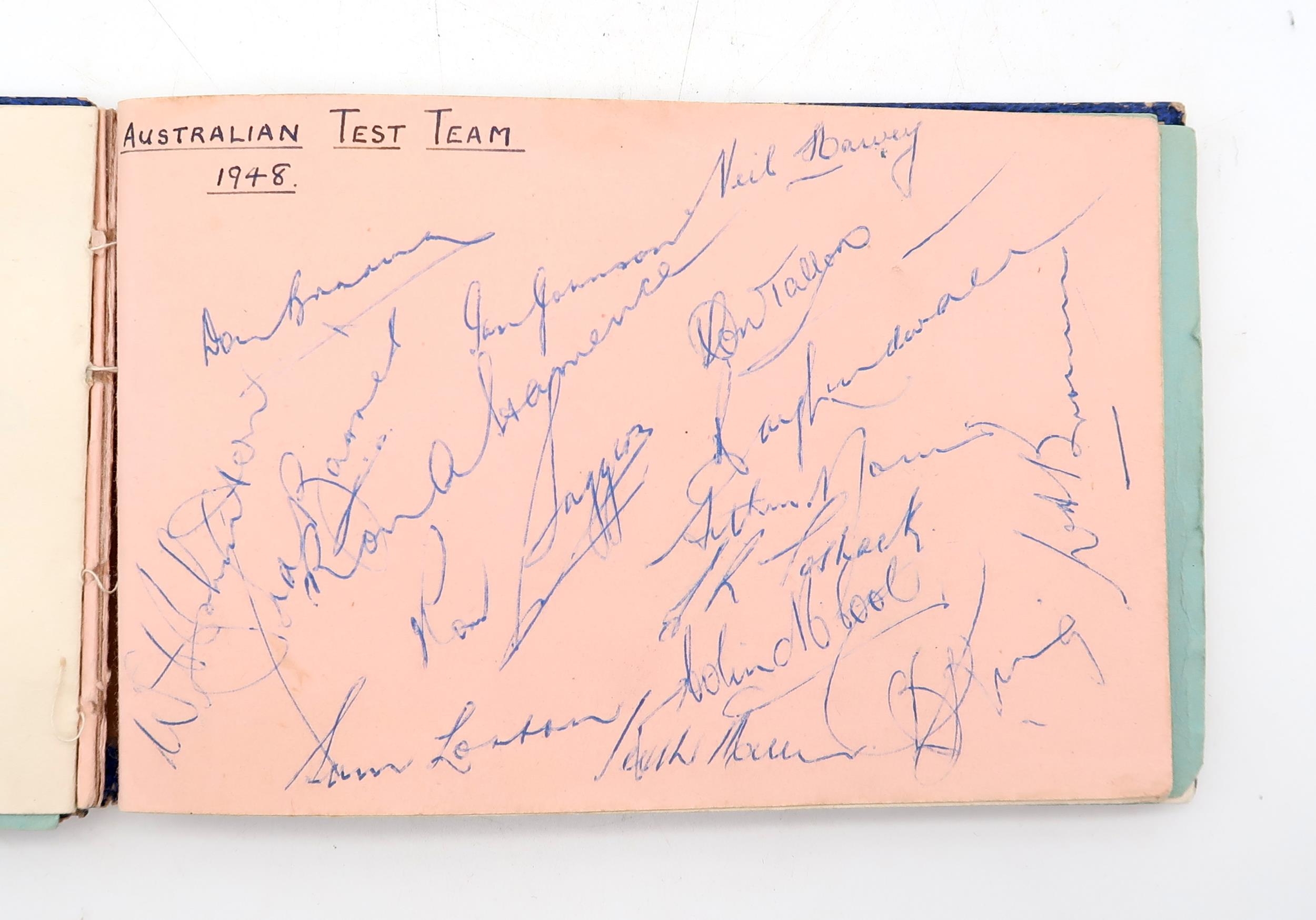 A mid-20th century autograph book, containing signatures of the 1948 Australian test cricket team on a single page (including Sir Don Bradman), another single page bearing signatures of players for Rangers F.C. (Jimmy Duncanson, Willie Waddell, Joe Johnson, Eddie Rutherford and others) etc.