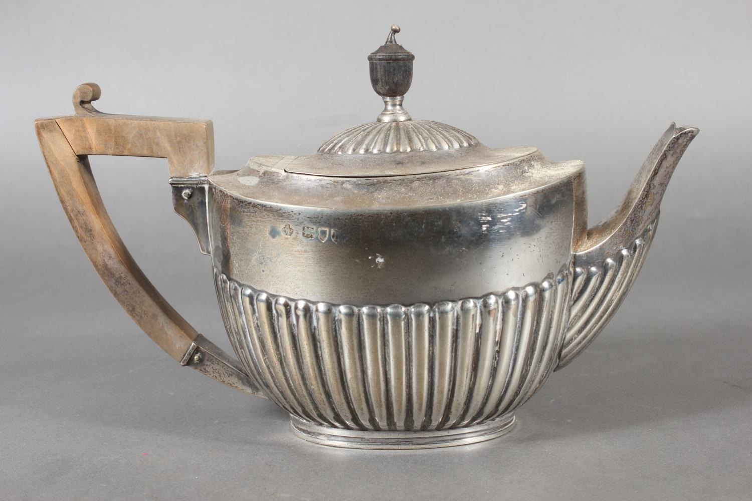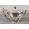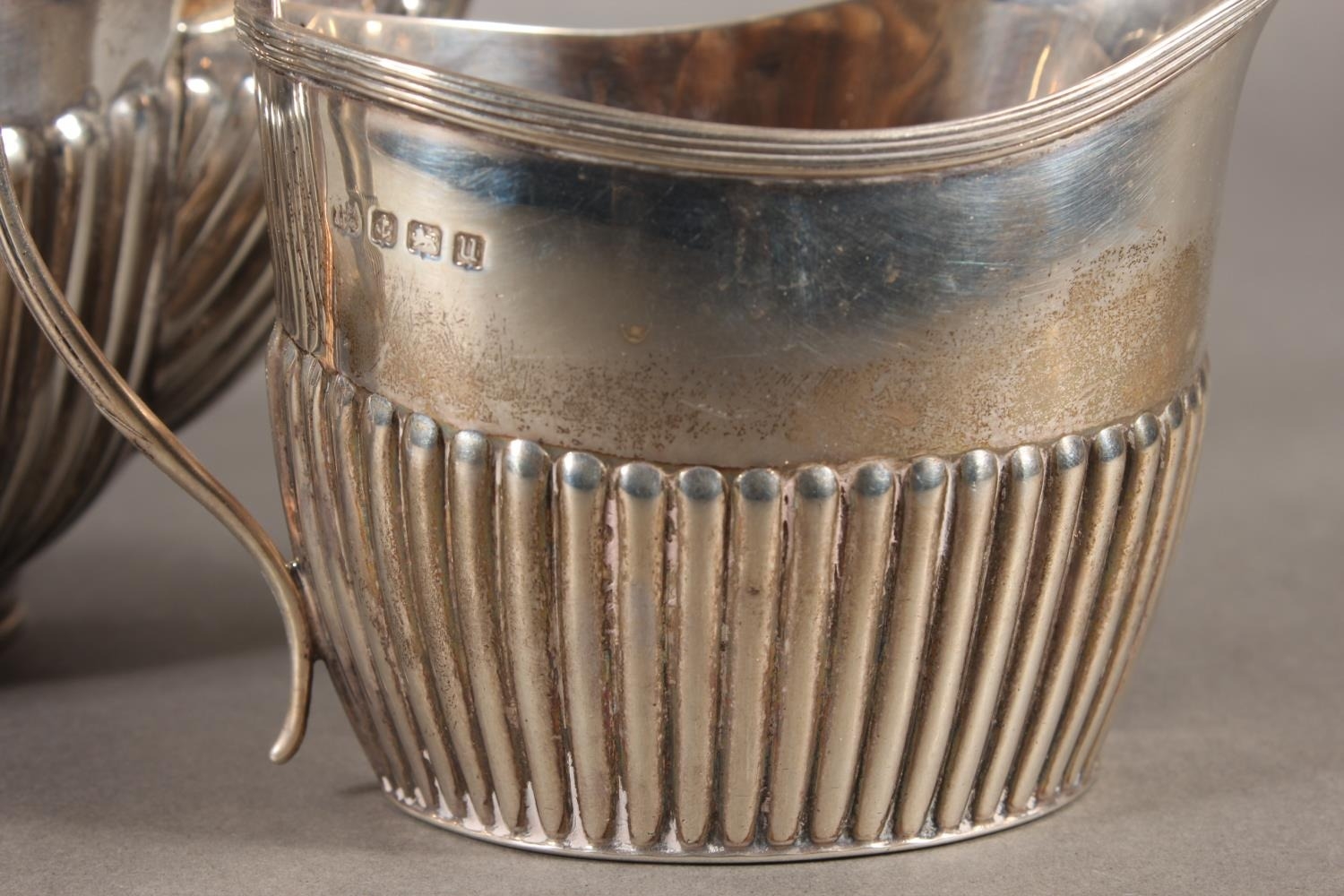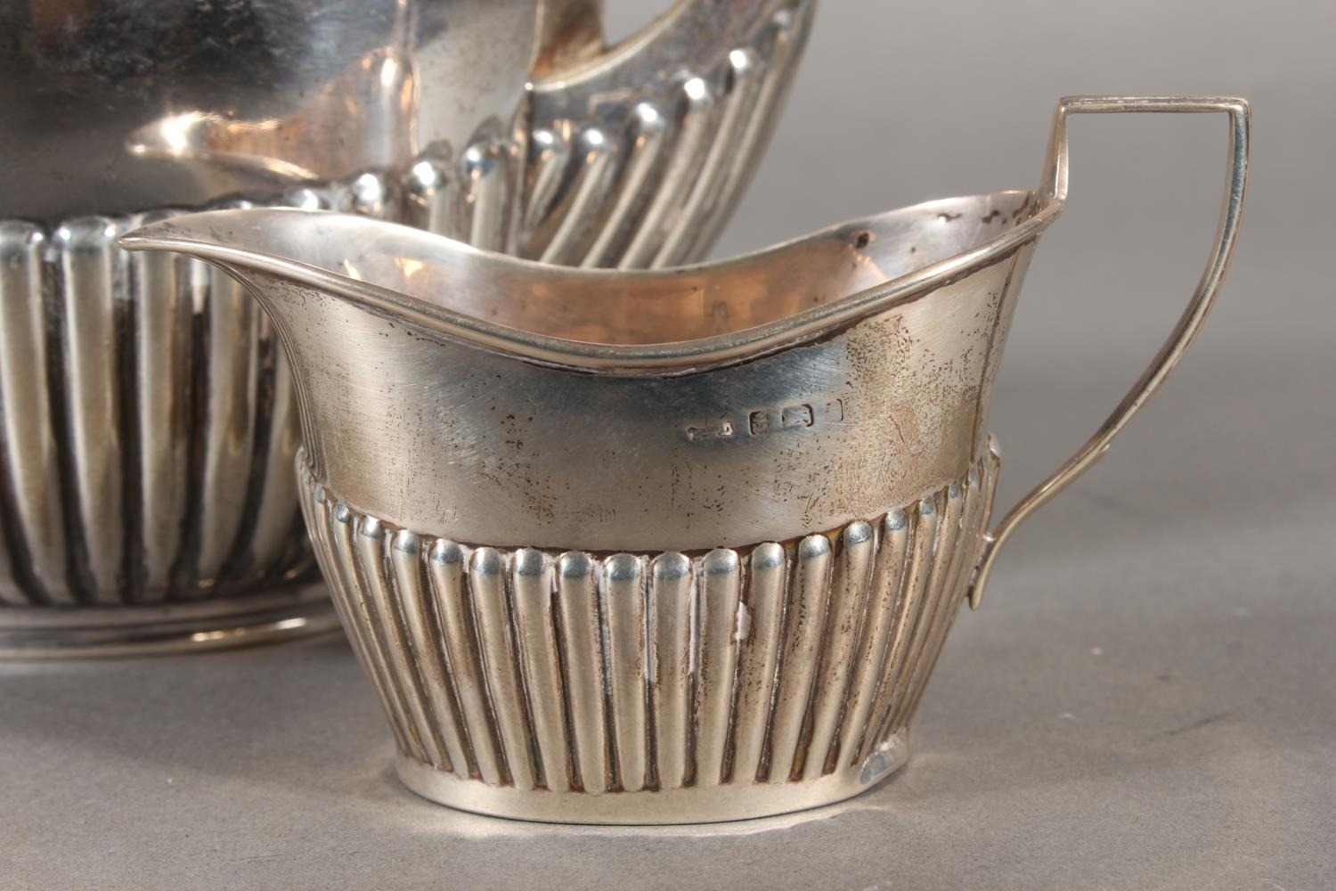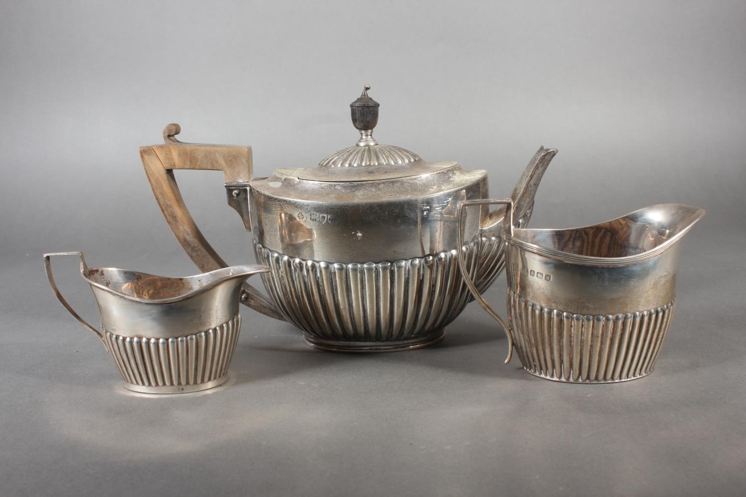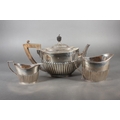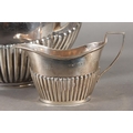 Harlequin three piece silver teaset of half gadrooned form, the teapot by William Hutton & Sons Ltd, London, 1894 and the sugar and cream, Birmingham, 668g gross.
