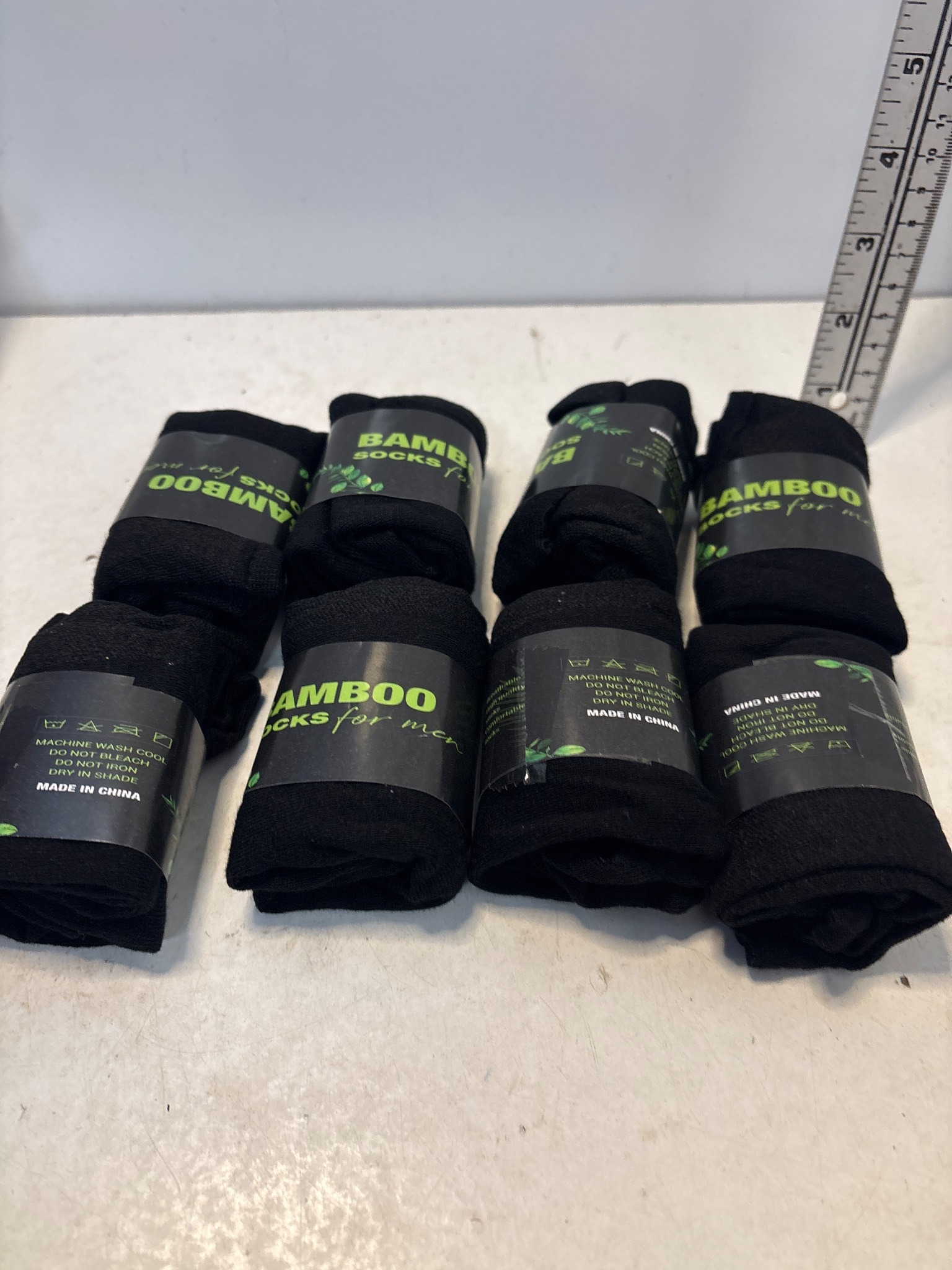 Seven pairs of black bamboo fiber socks, made in China.