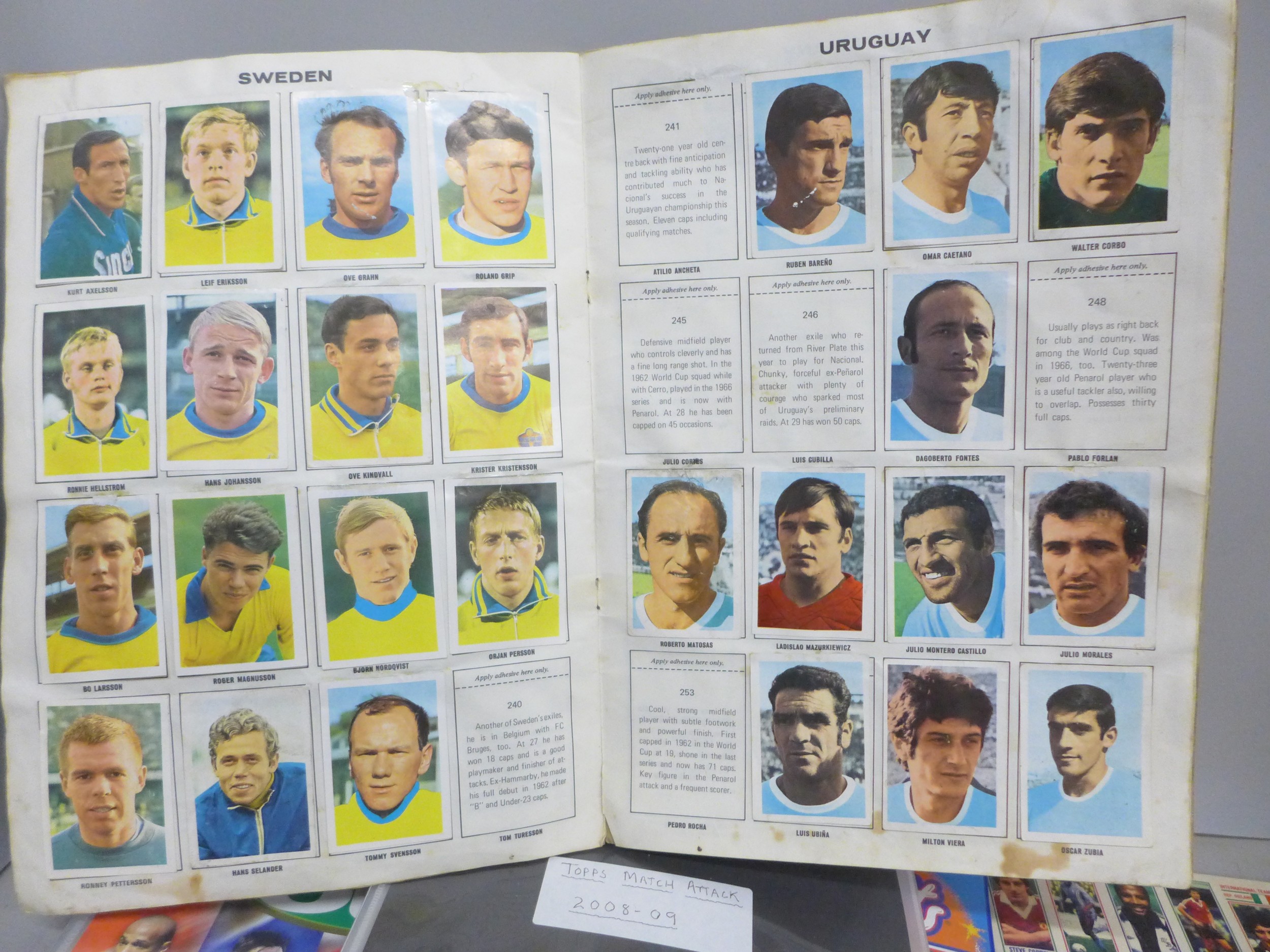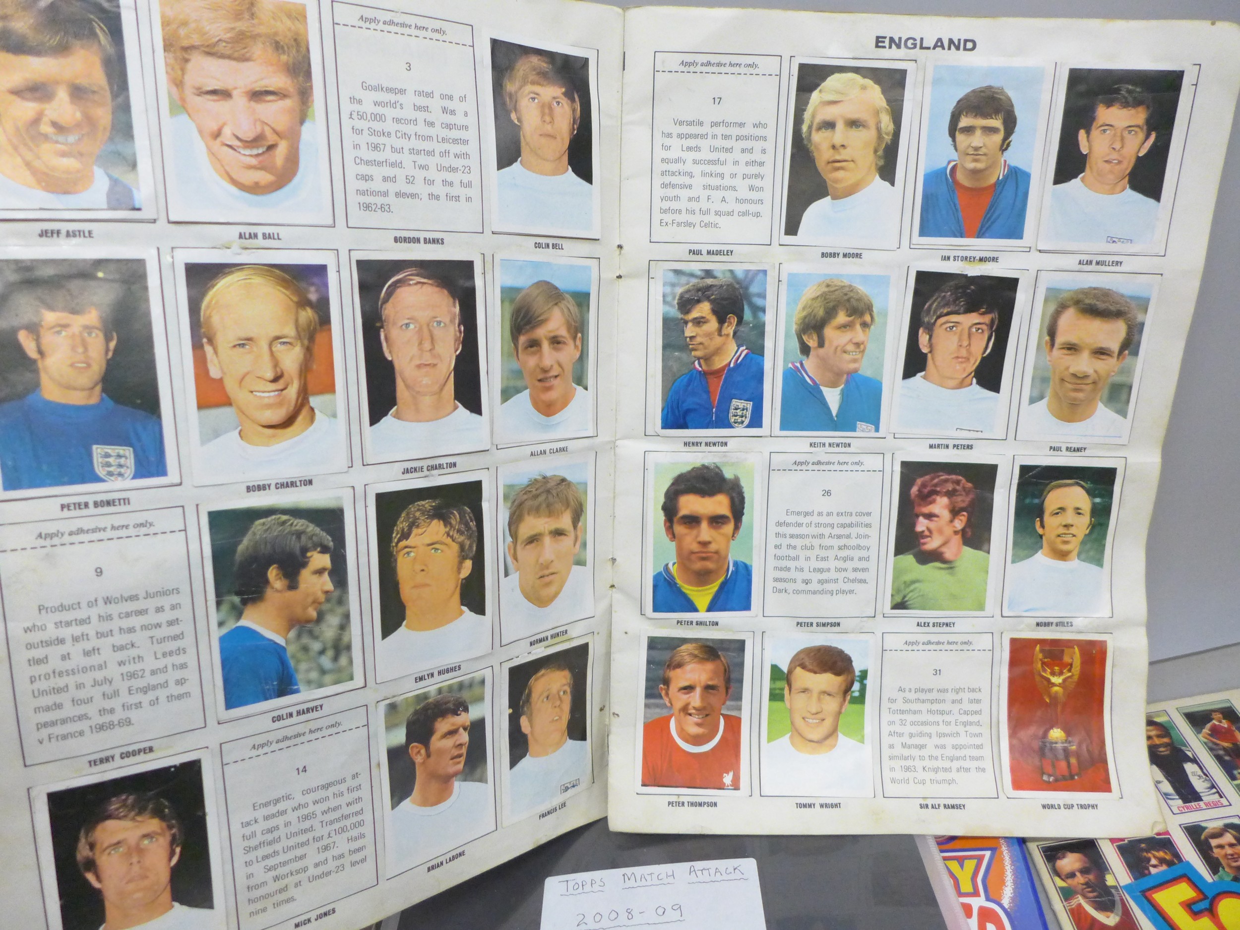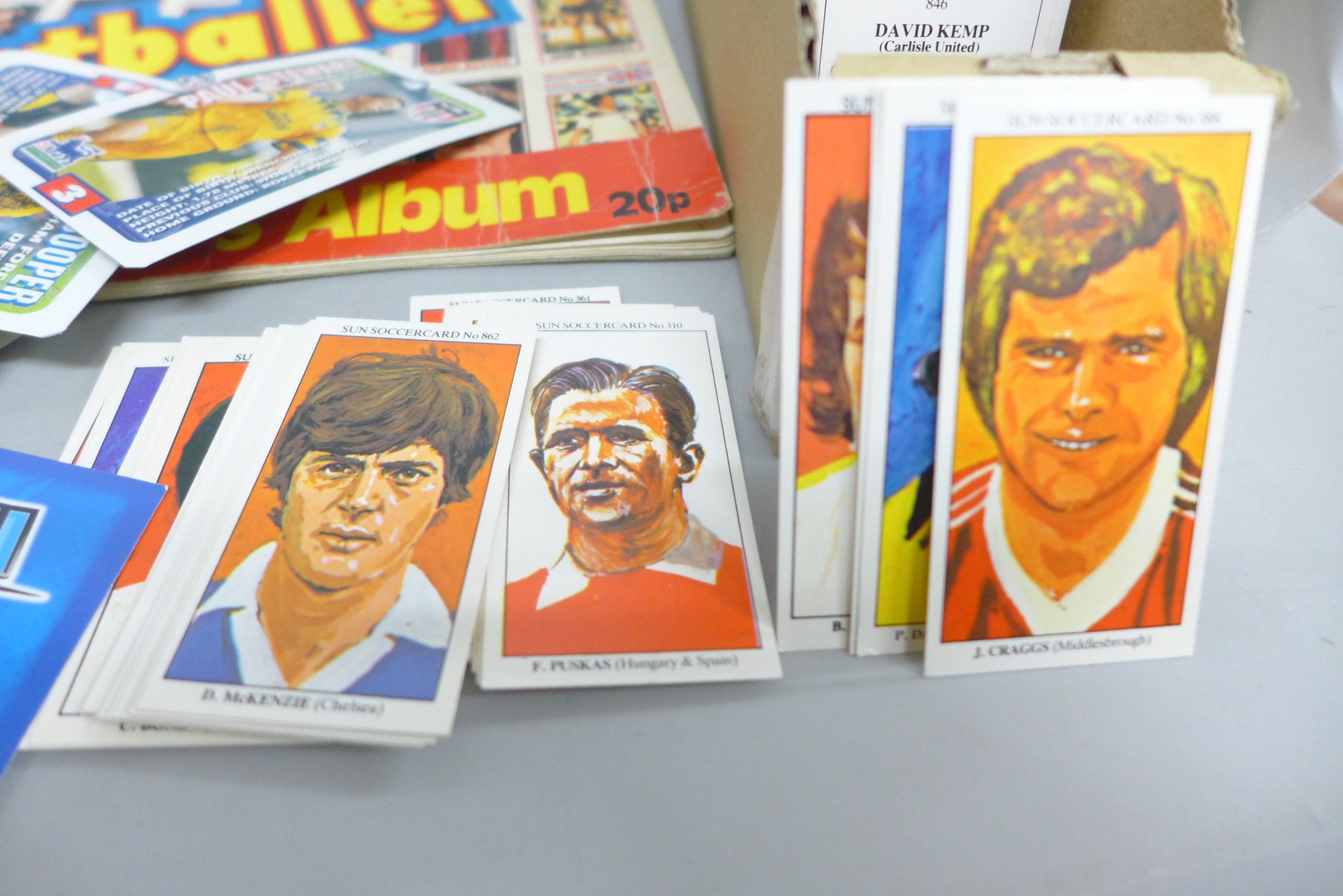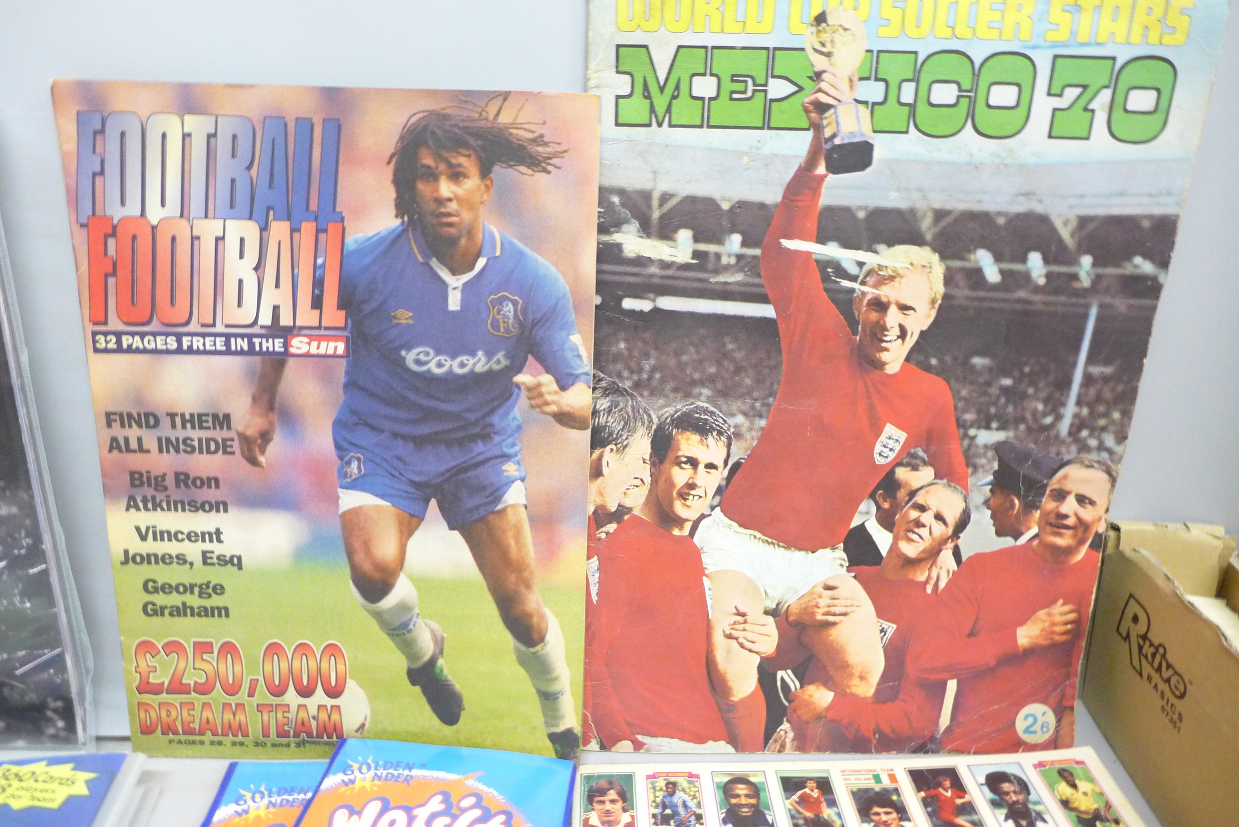 Collection of football trading cards and albums to include World Cup Soccer Stars Mexico 70 (incomplete), Trading Card Game Shoot Out, Topps Match Attax 2008-2009, and large collection of loose The Sun Soccer Cards