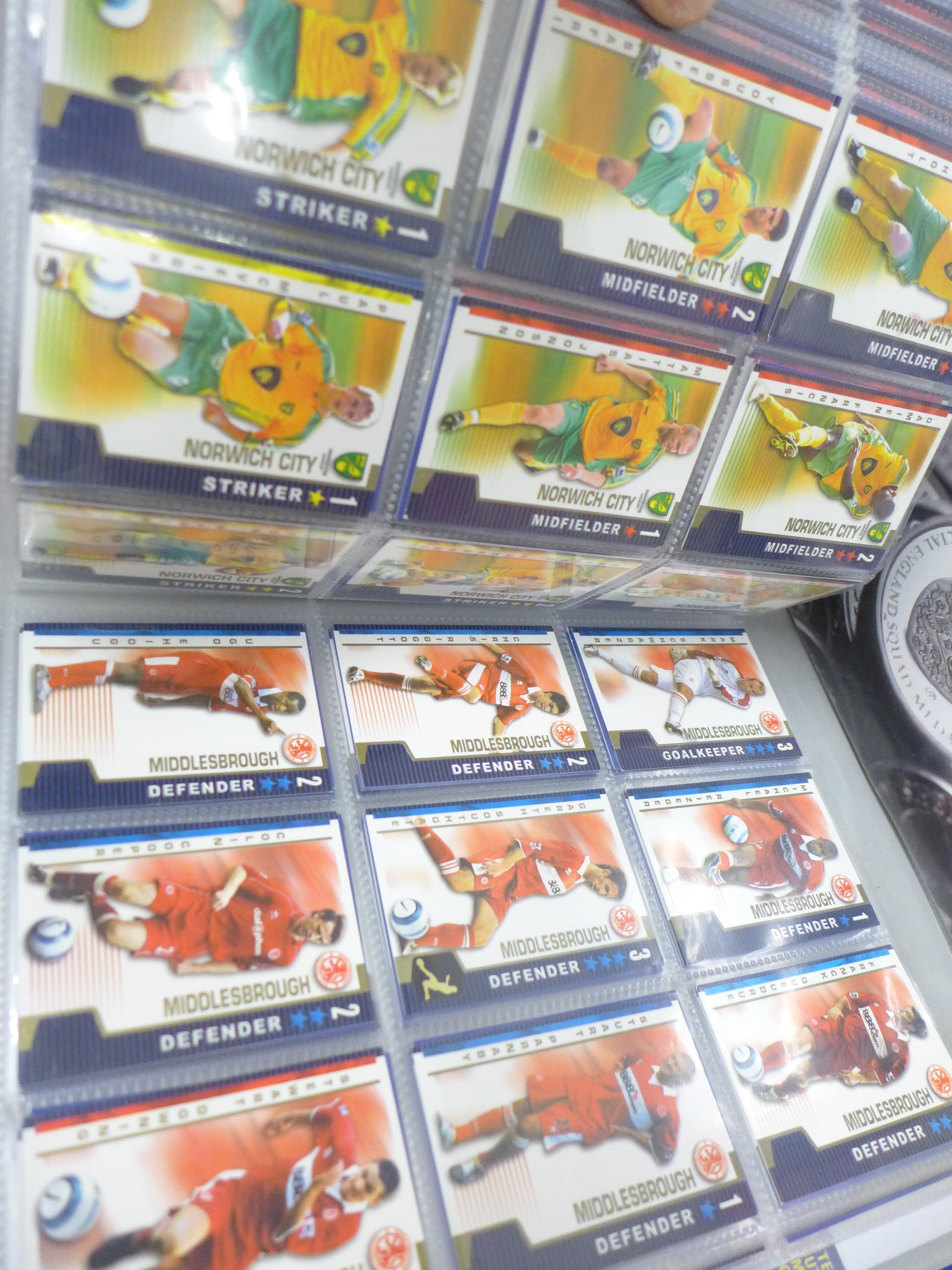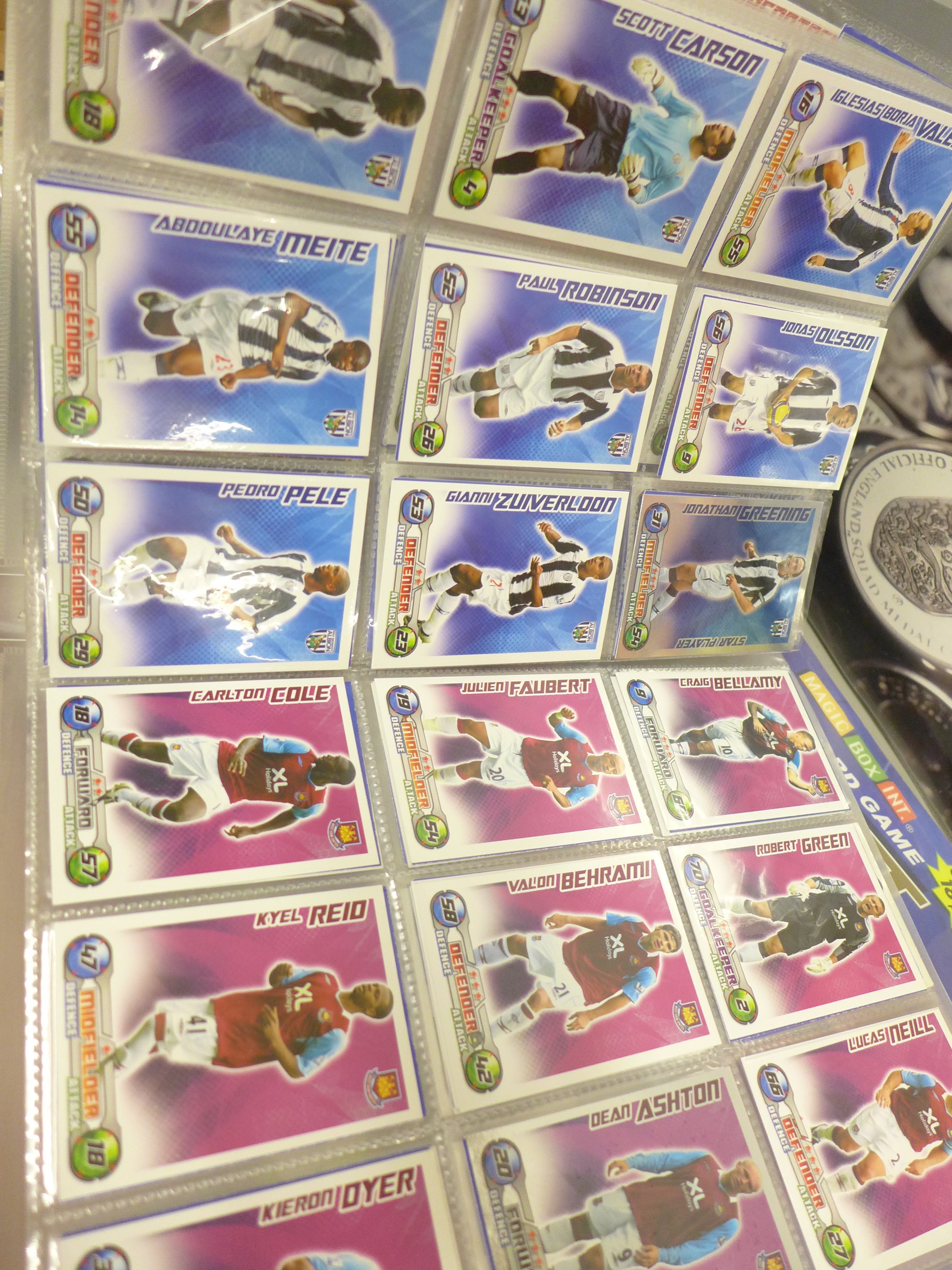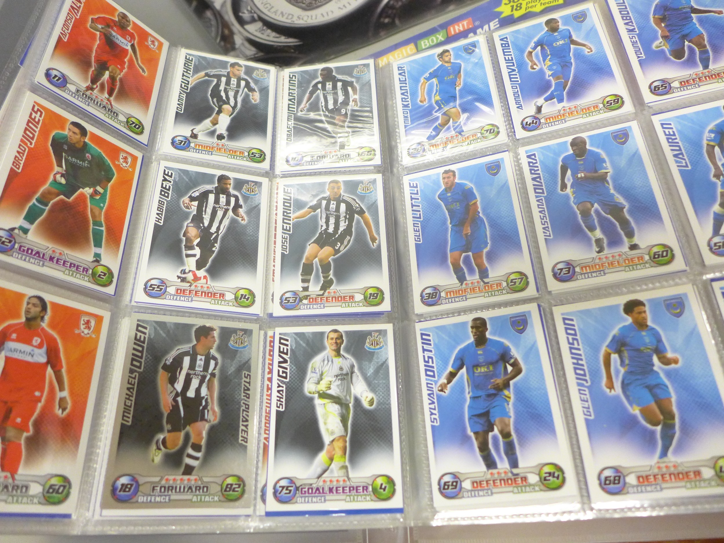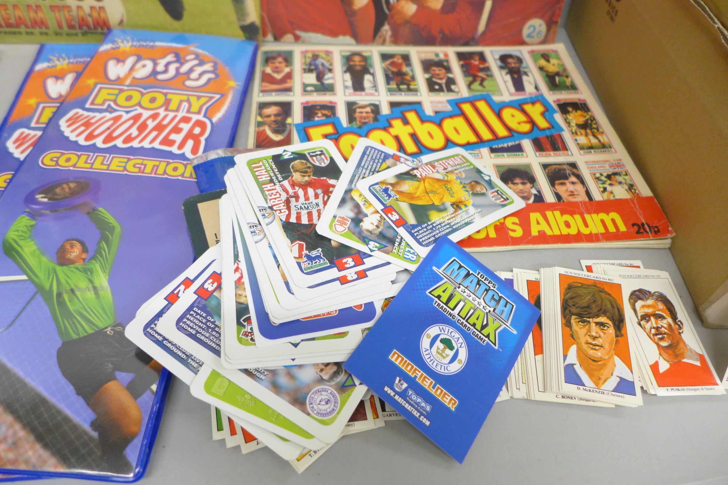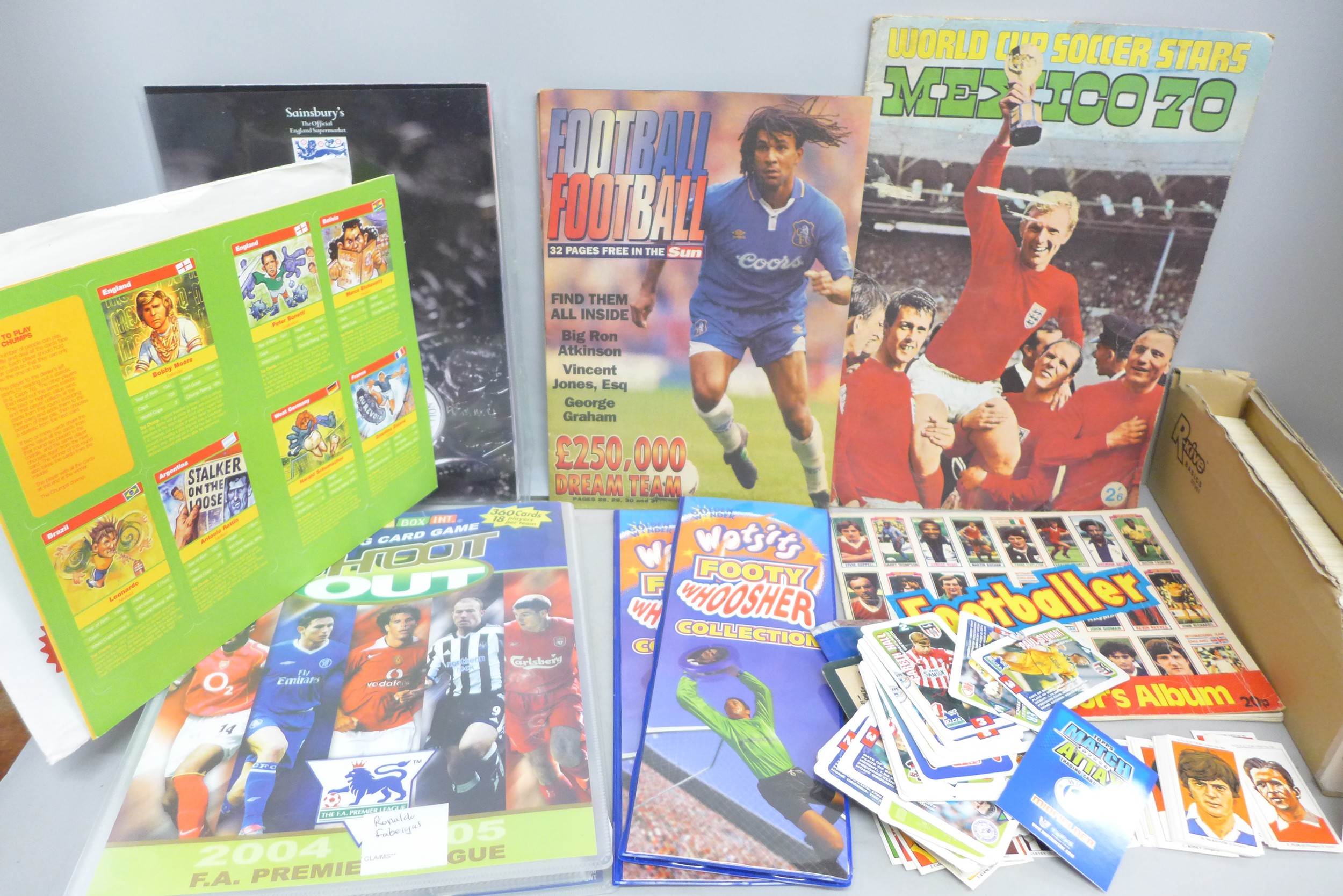 Collection of football trading cards and albums to include World Cup Soccer Stars Mexico 70 (incomplete), Trading Card Game Shoot Out, Topps Match Attax 2008-2009, and large collection of loose The Sun Soccer Cards
