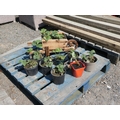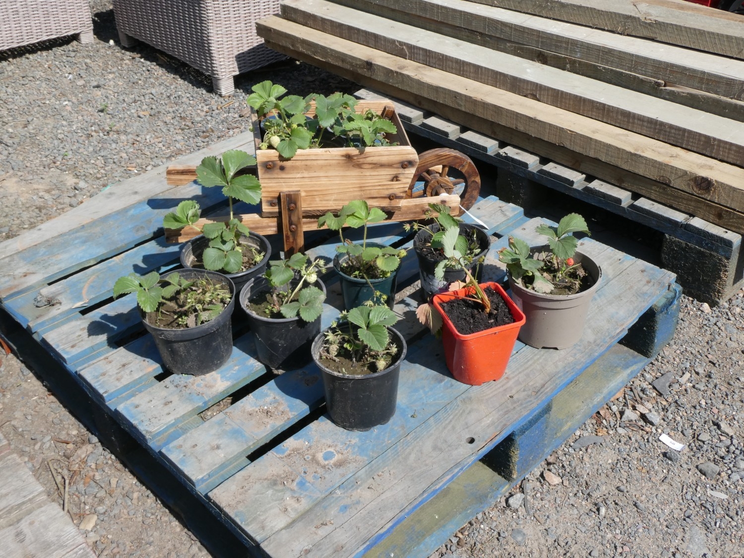 An ornamental wooden wheel barrow together with several Strawberry plants