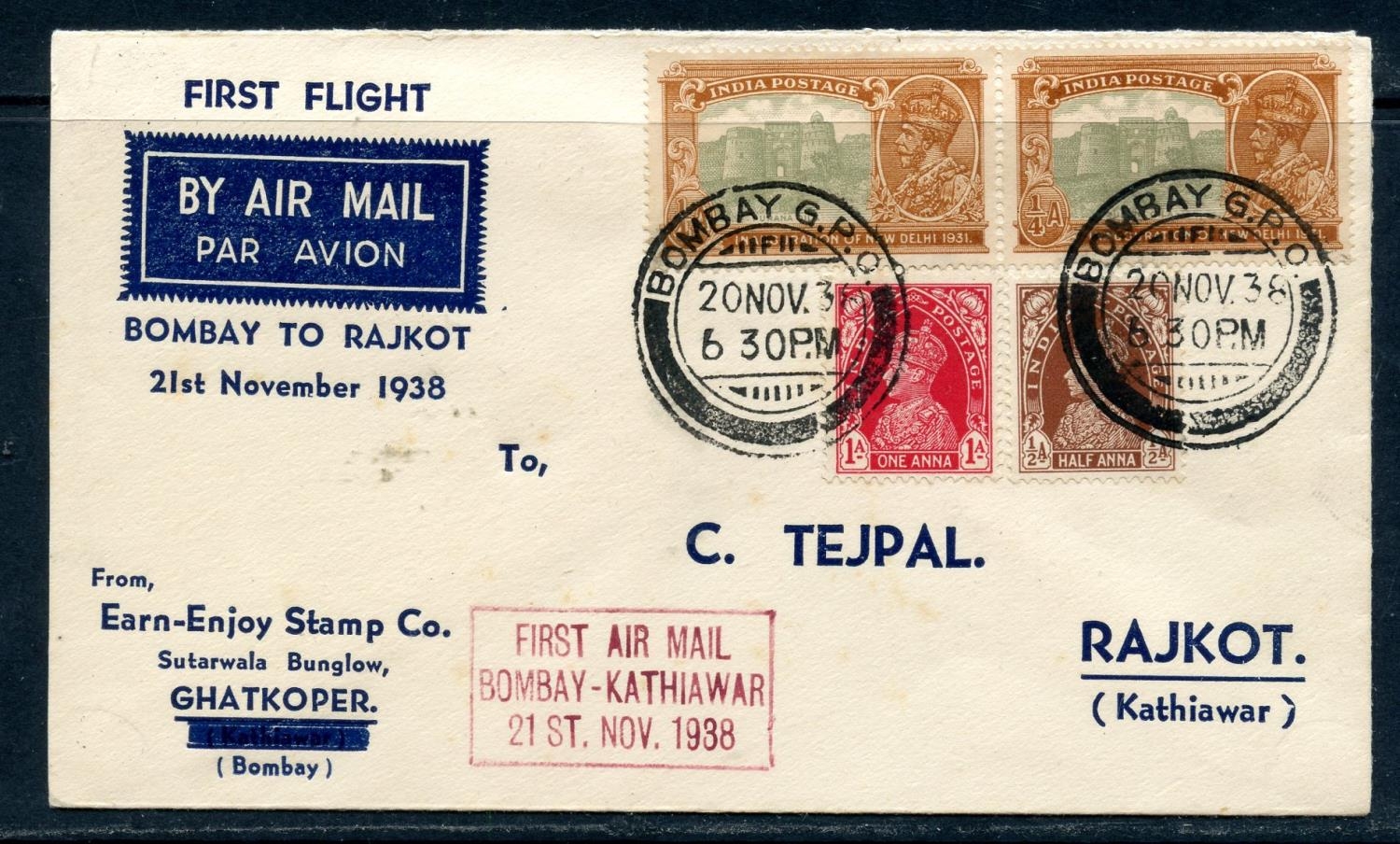 INDIA 1938 First Flight cover from Bombay to Rajkot. Good condition.