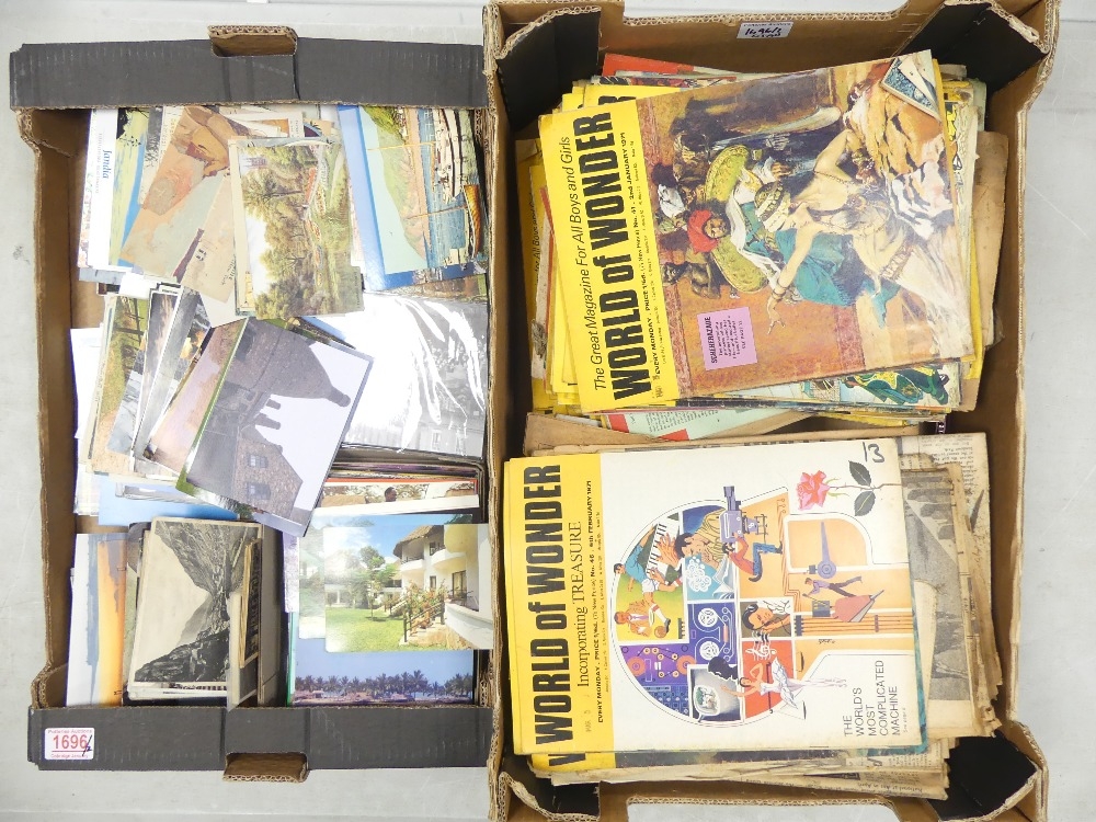 A collection of 20th century postcards from various tourist spots, featuring coastal scenes, landmarks etc from around the UK, together with a collection of World of Wonder magazines. (2 Trays)