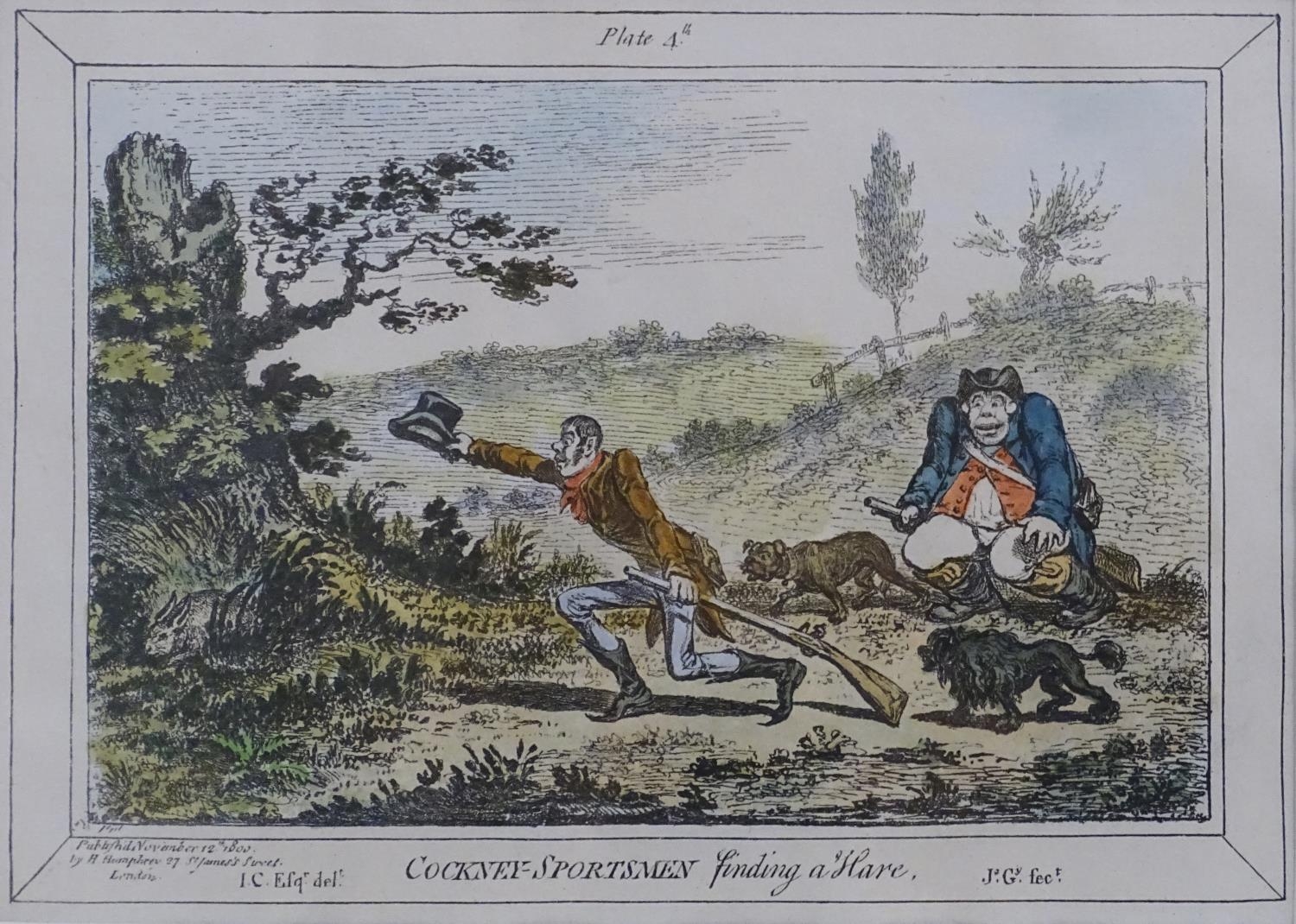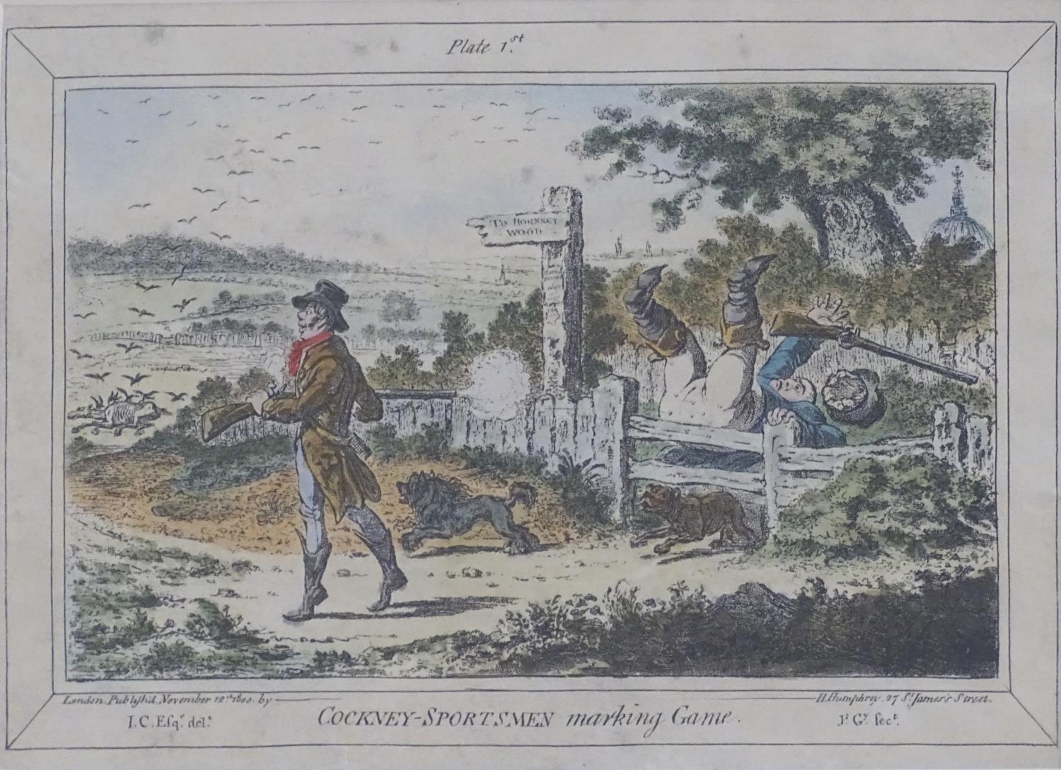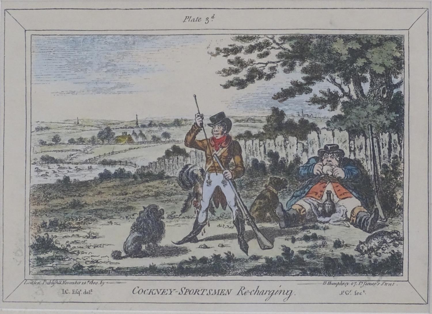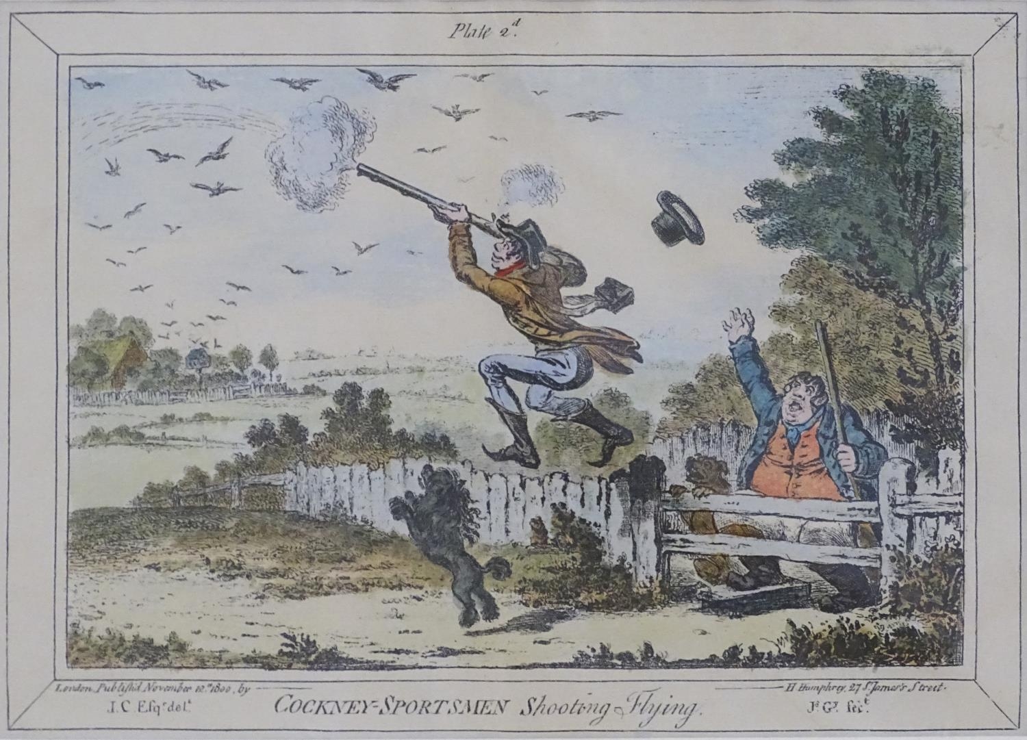After James Gillray (1756-1815), Hand coloured etchings, A set of four images from the Cockney Sportsman series: Marking Game, Shooting Flying, Recharging, and Finding a Hare. Depicting comical shooting scenes. Titled under. Published by H. Humprey, London, 1800. Each approx. 5 1/4" x 8 1/4" (4)
