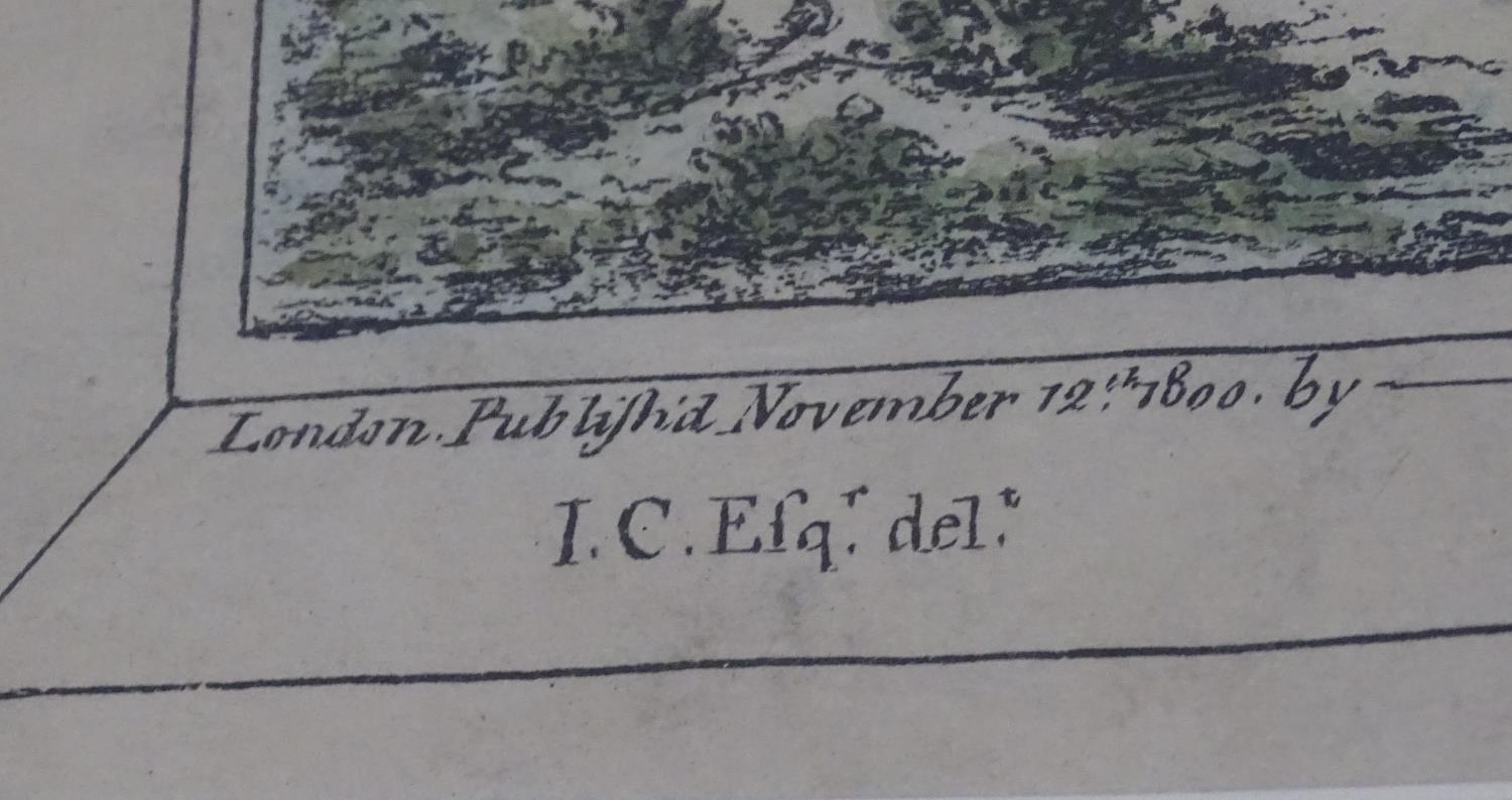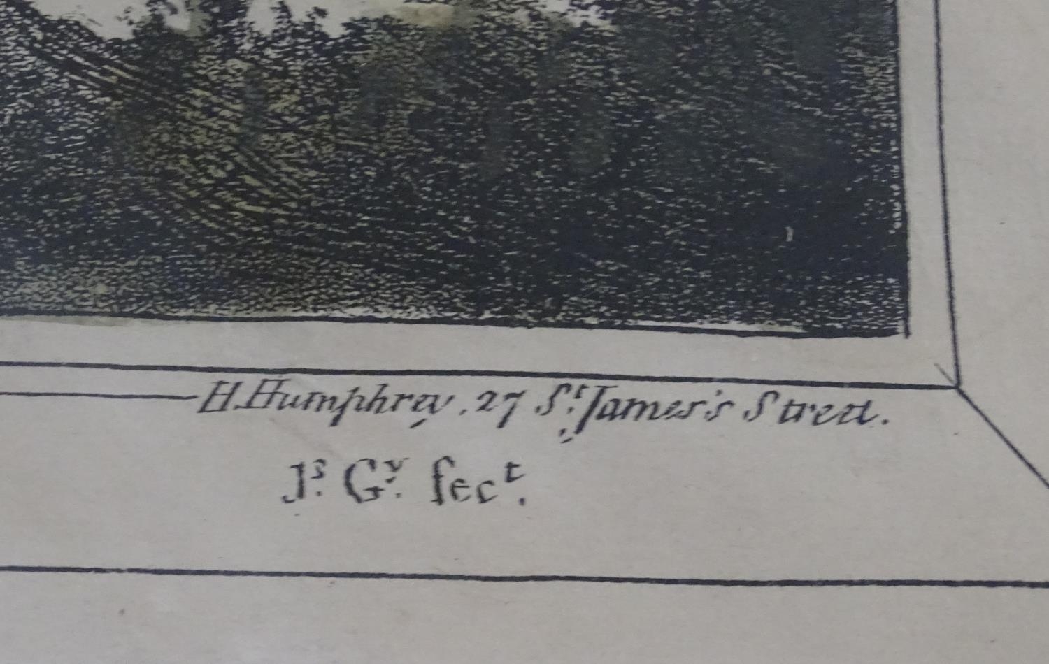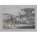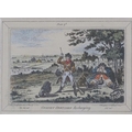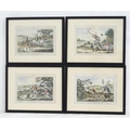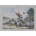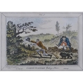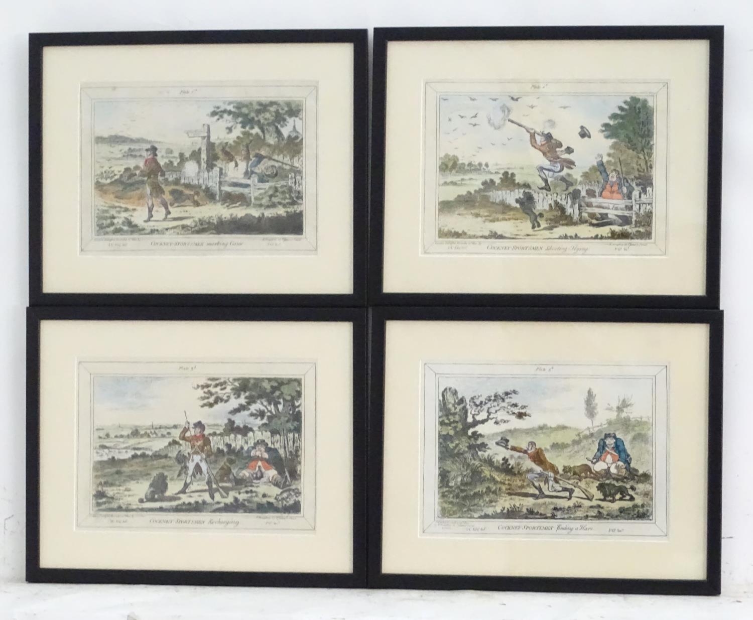 After James Gillray (1756-1815), Hand coloured etchings, A set of four images from the Cockney Sportsman series: Marking Game, Shooting Flying, Recharging, and Finding a Hare. Depicting comical shooting scenes. Titled under. Published by H. Humprey, London, 1800. Each approx. 5 1/4" x 8 1/4" (4)