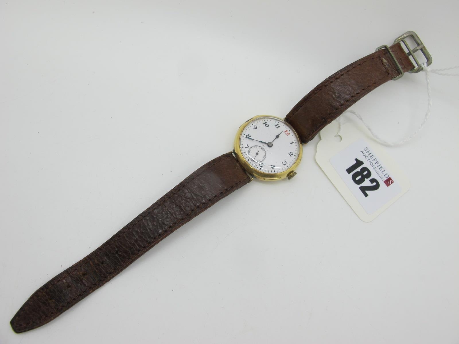 Zenith; A 1920's 18ct Gold Cased Gent's Wristwatch, the (feint) signed dial with black and red Arabic numerals and seconds subsidiary dial, the movement stamped "Zenith" and numbered "2506517", within plain case (import marks for Glasgow 1925), on a strap.