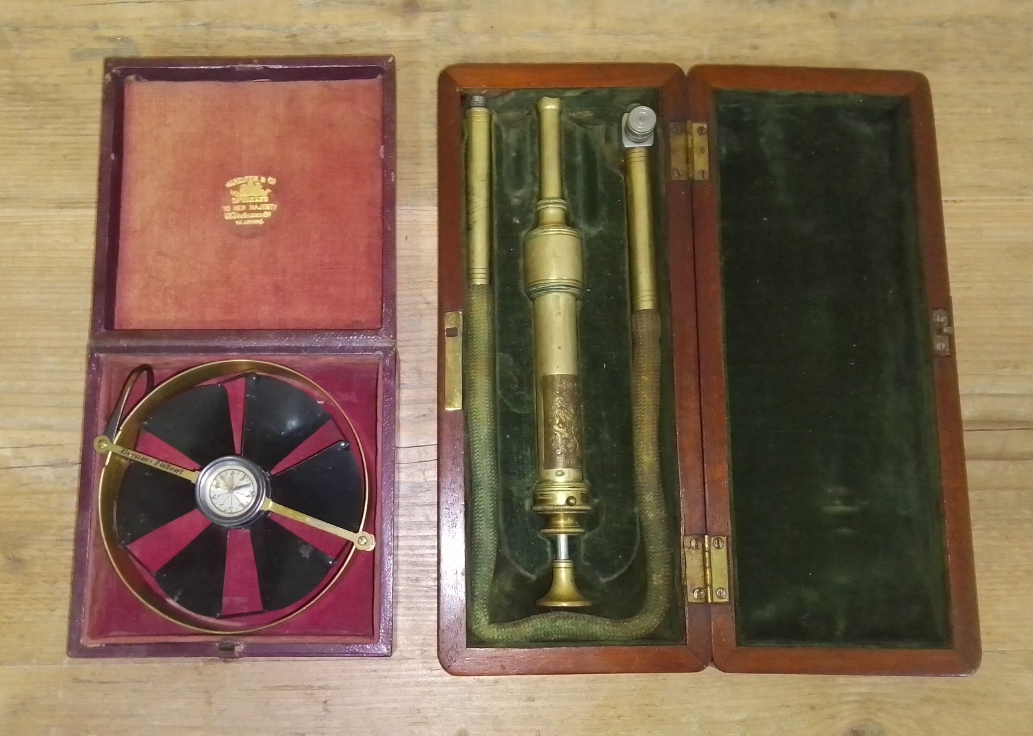 A Reads lavement pump in mahogany case and a cased anemometer.