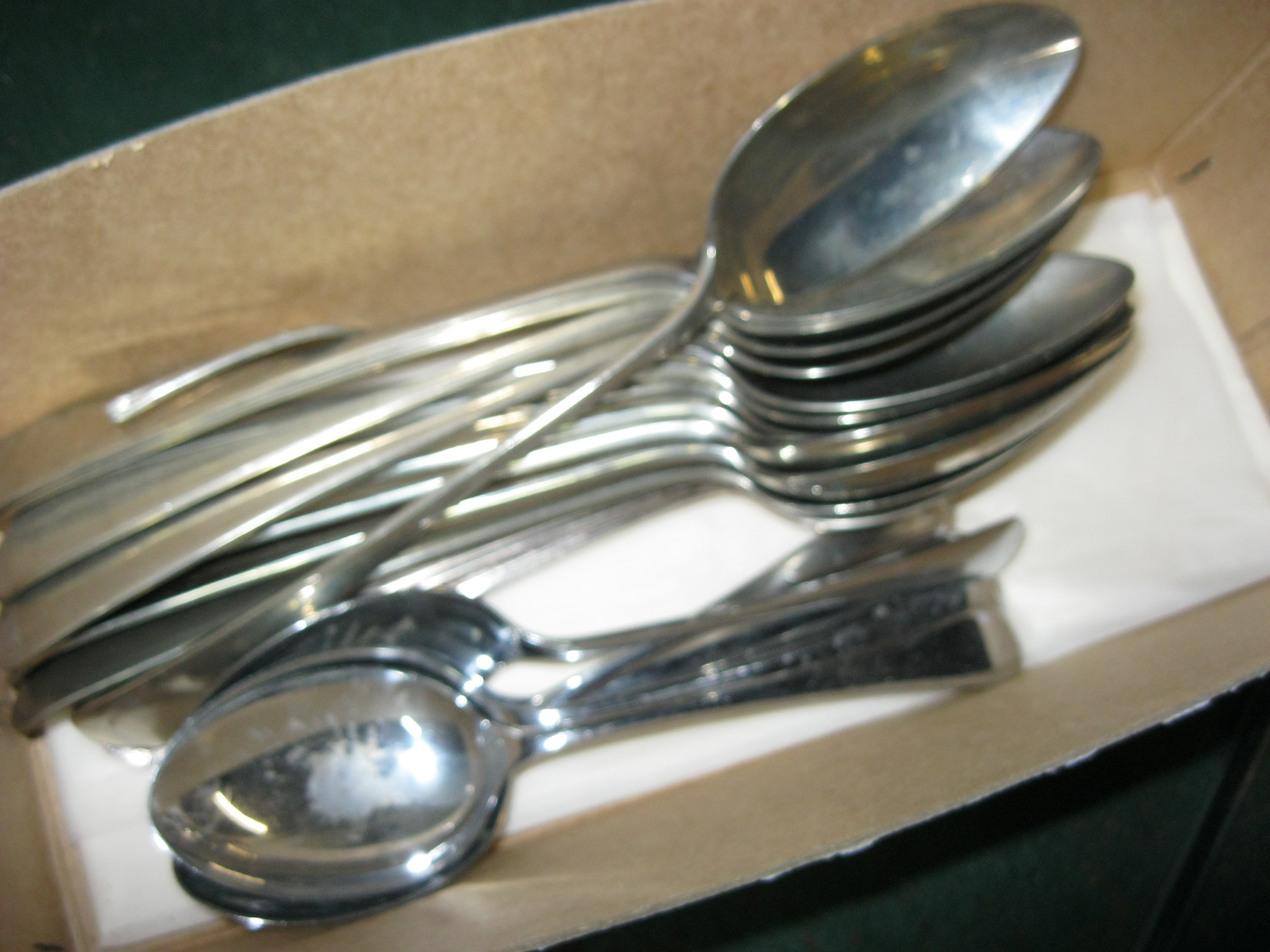 A tub containing a quantity of silver plated spoons, mainly serving spoons with some dessert spoons