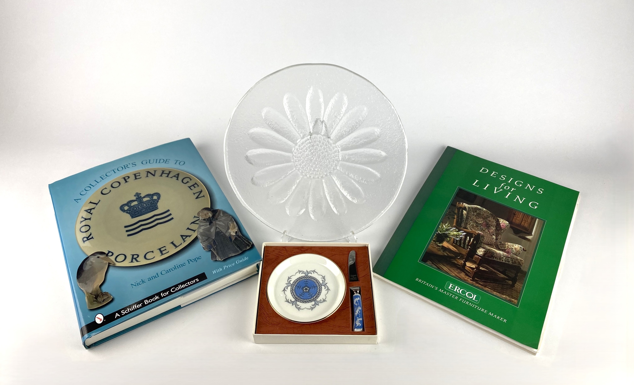 A Dartington Crystal daisy cheese platter, boxed, a small Coalport porcelain Revelry knife and plate set, boxed, a hardback edition of A Collector's Guide to Royal Copenhagen porcelain by Nick and Caroline Pope and a vintage Ercol furniture catalogue