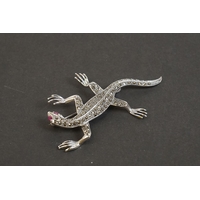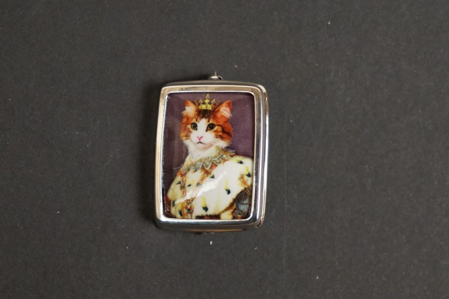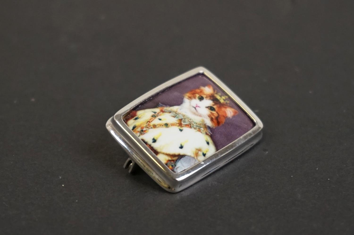 Silver and enamel brooch with pictorial image of a royal cat