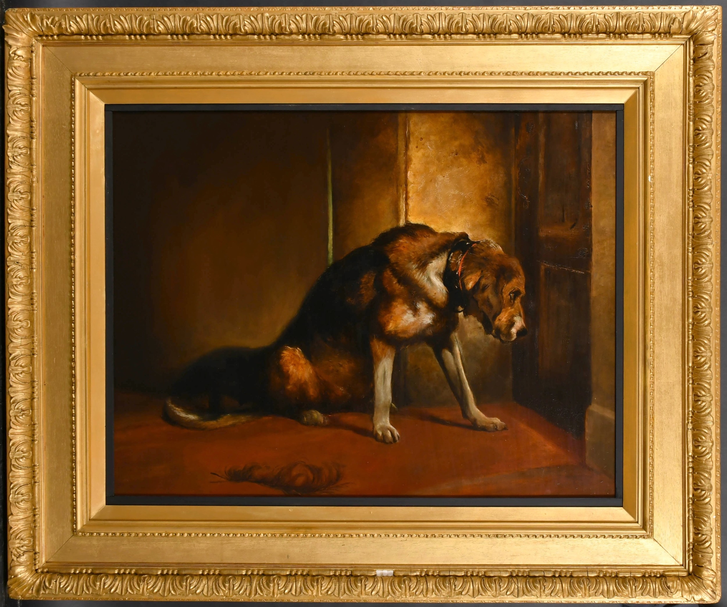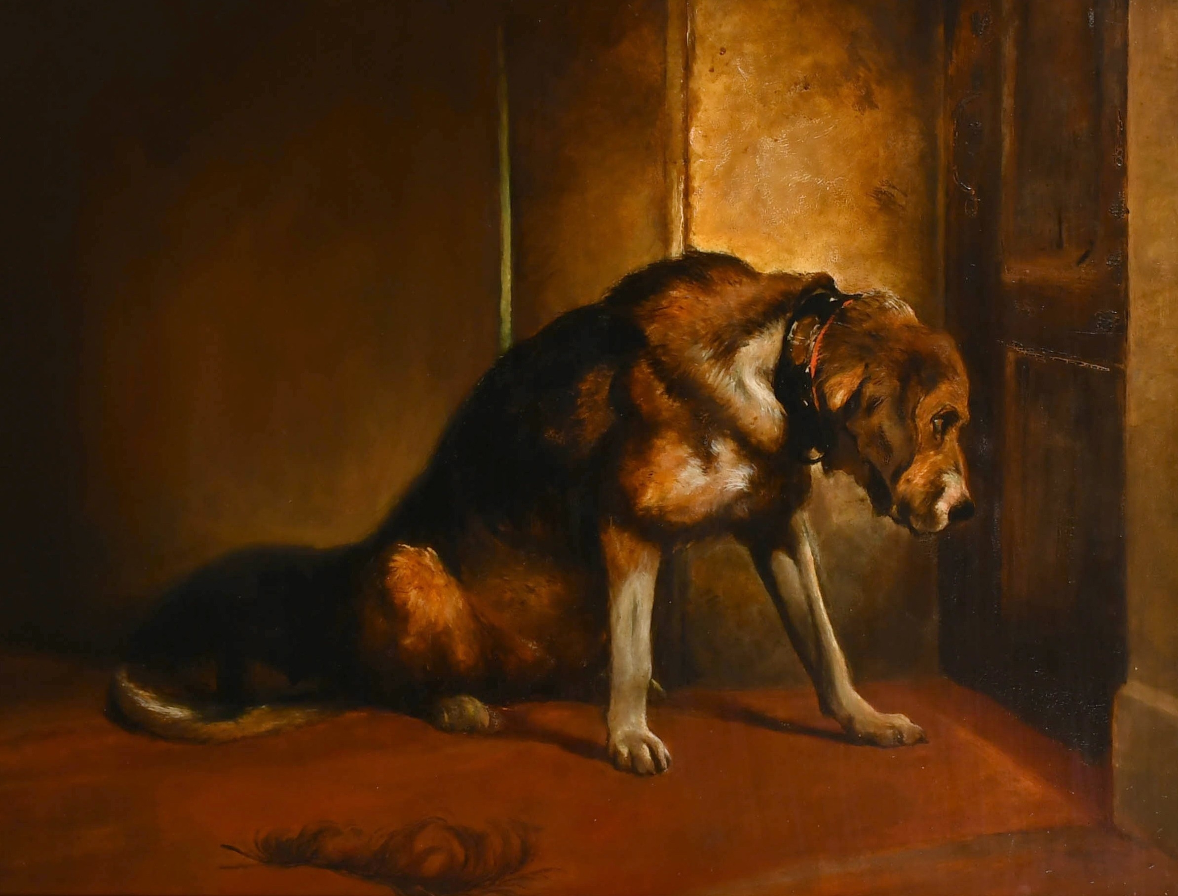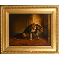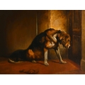 E. Stott (19th Century) after Edwin Henry Landseer (1802-1873) British. "Suspense", a bloodhound, Oil on panel, 28" x 36" (71.1 x 91.5cm)