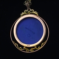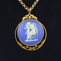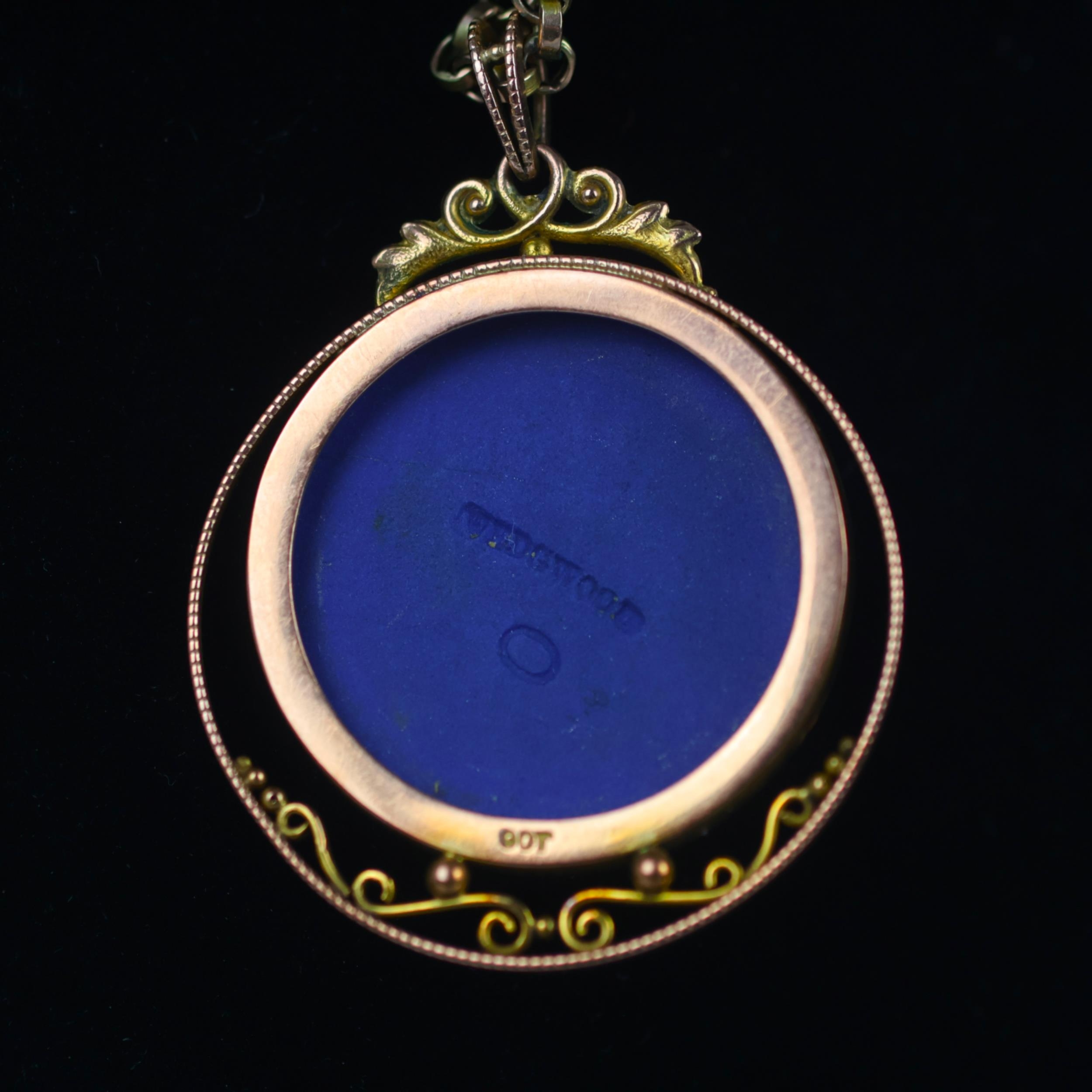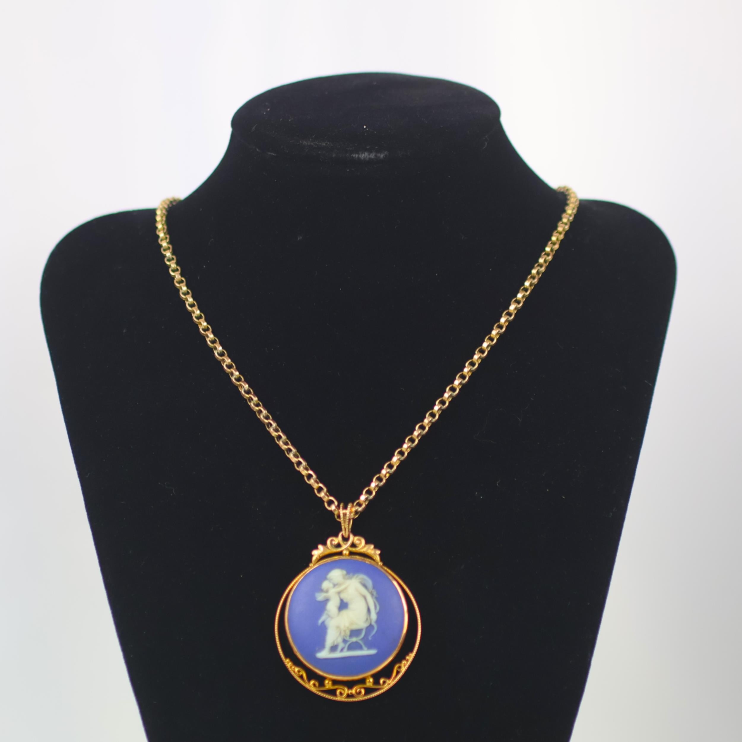 A late 19th/early 20th century Wedgwood Jasperware pendant, the circular typical blue and white pendant depicting Diana and cupid, within openwork scrolling mount, marked '9ct' plaque stamped 'Wedgwood' 5cm long, upon an associated trace link chain, with applied '9c' pad, 47cm long, gross weight 16gms