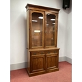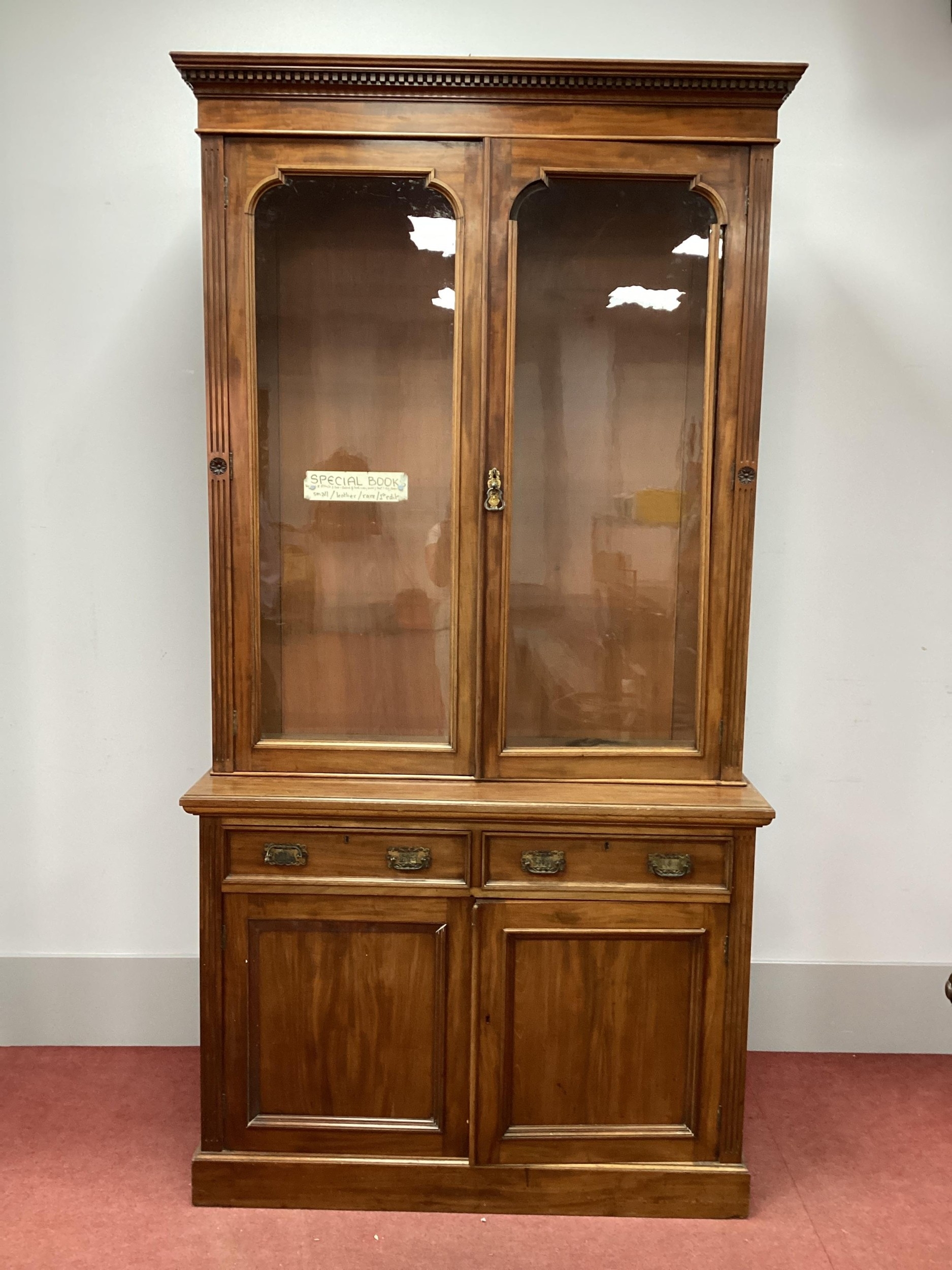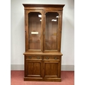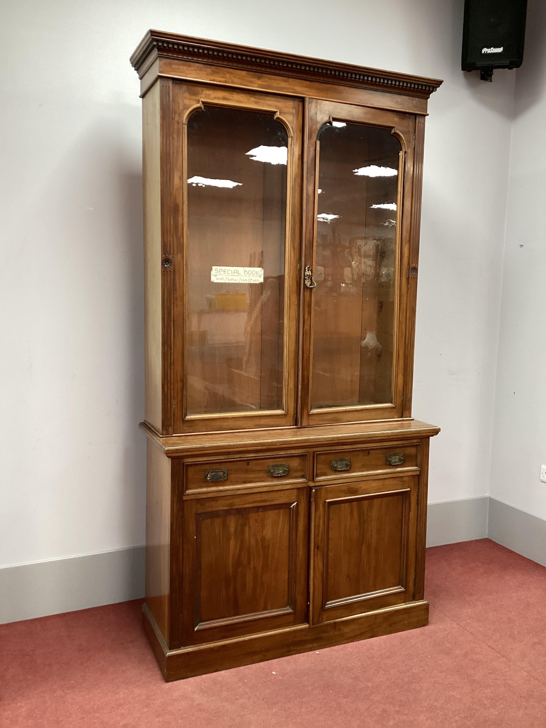 An Early XX Century Mahogany Bookcase, the top with dentil cornice over twin glazed doors, the base with two small drawers over panelled doors on a plinth base, 225cn high, 118cm wide.