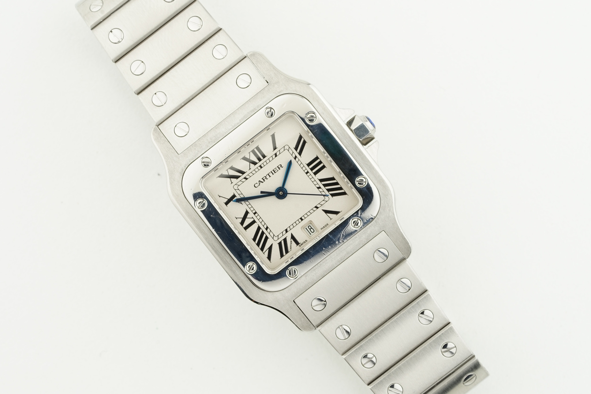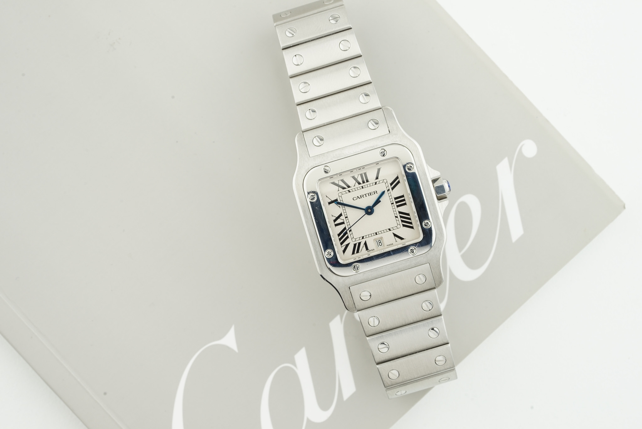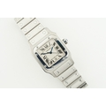 CARTIER SANTOS GALBEE STEEL DATE W/ GUARANTEE PAPERS REF. 1564, square off white dial with hour markers and hands, 29mm stainless steel case with a sapphire crown and a case back, inside is a quartz movement, on a stainless steel cartier bracelet, comes with its guarantee papers, watch is currently running.