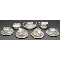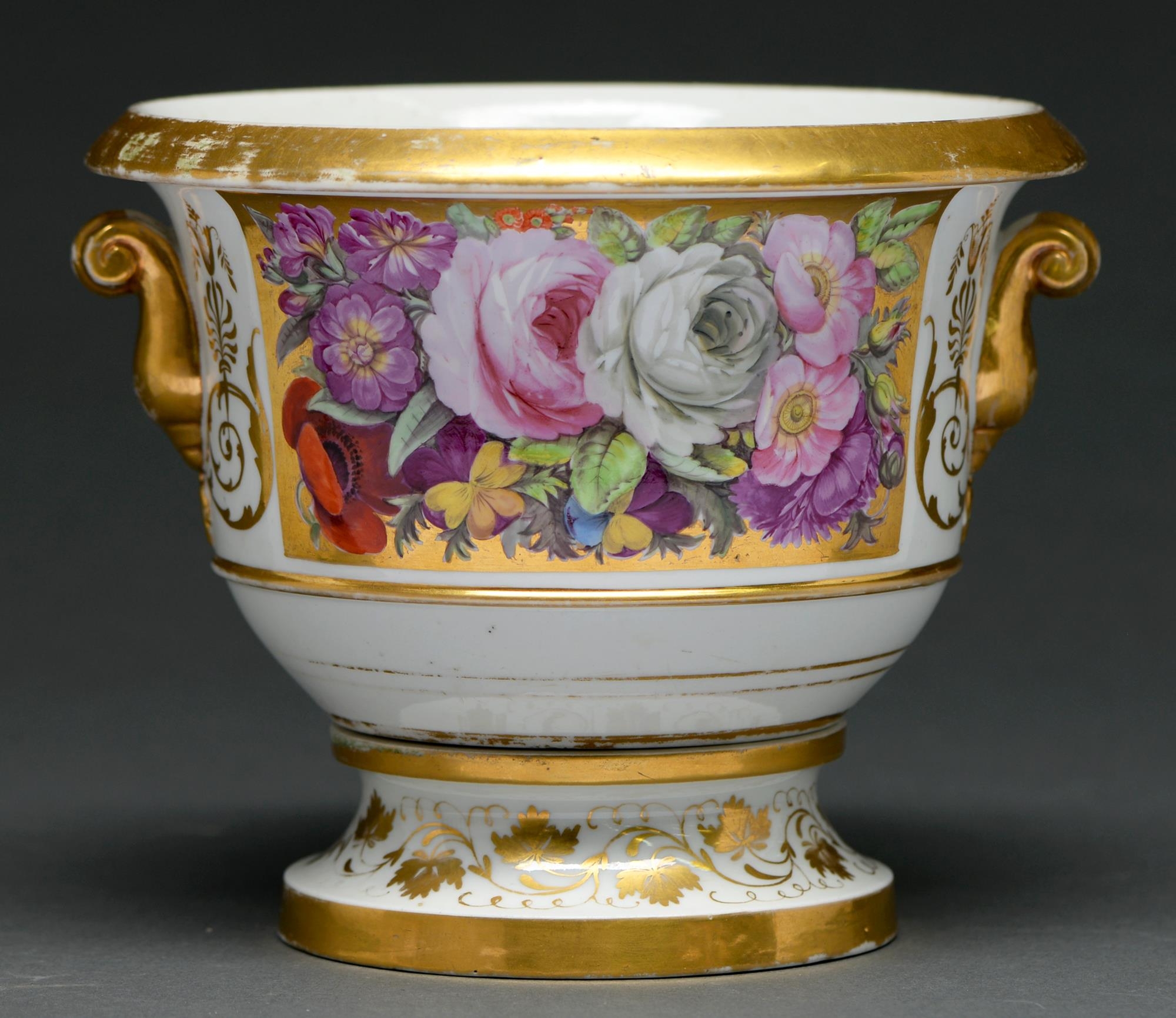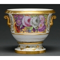 An English porcelain cache pot and stand, c1820, painted with a gilt ground panel of flowers, 15cm h