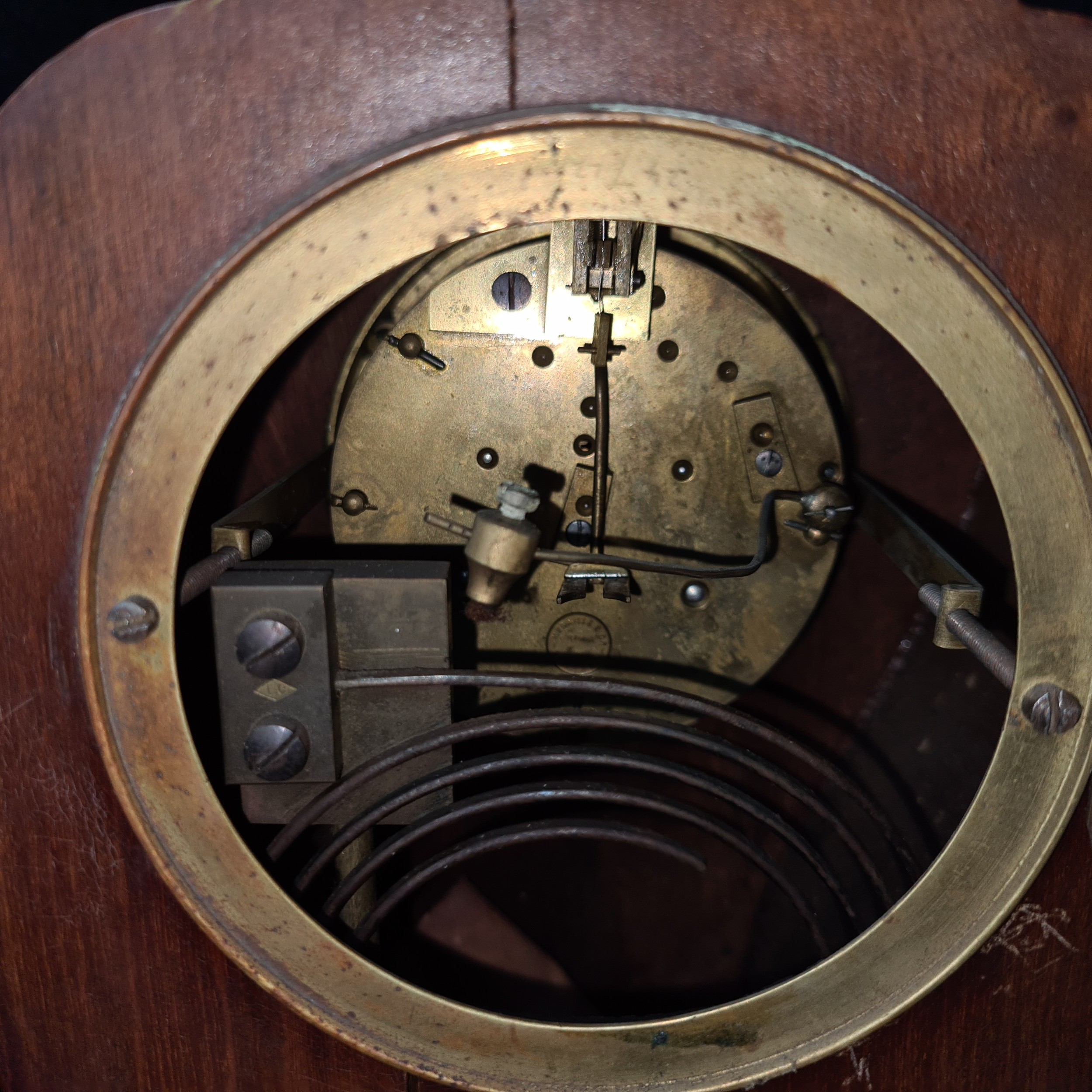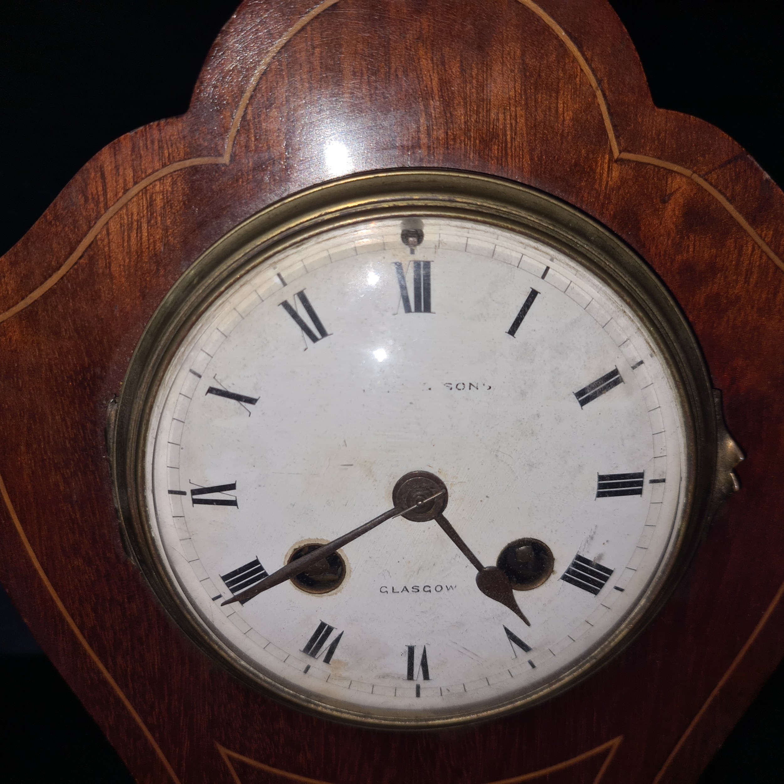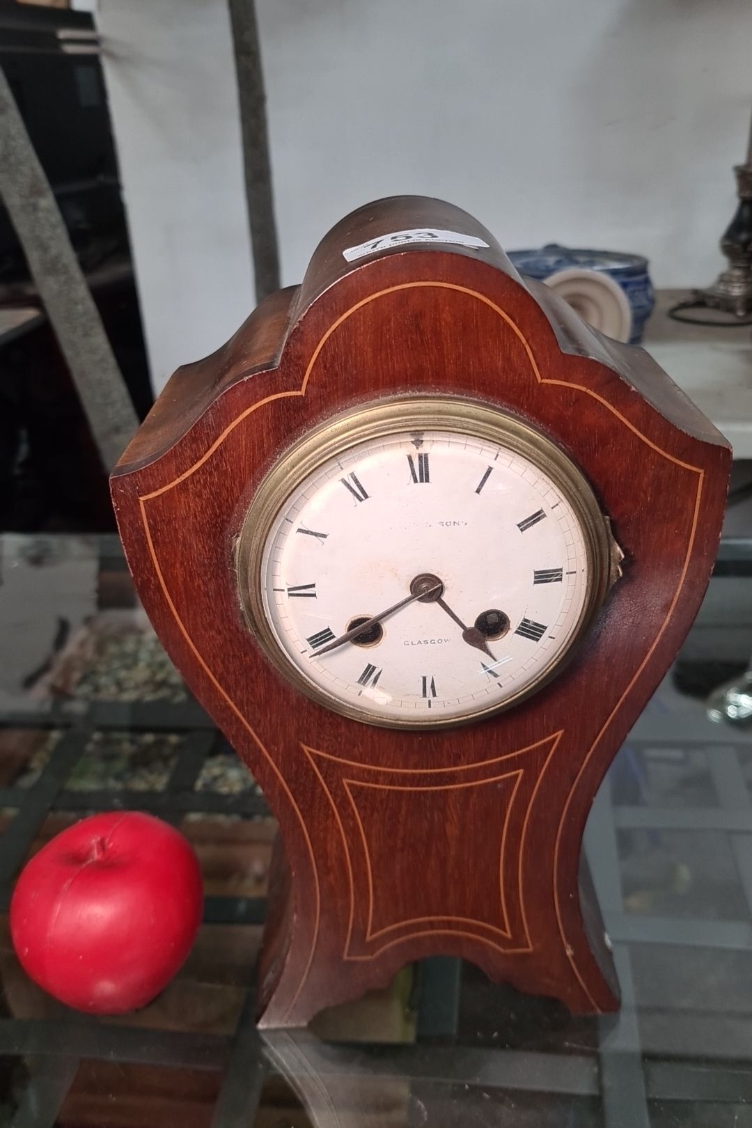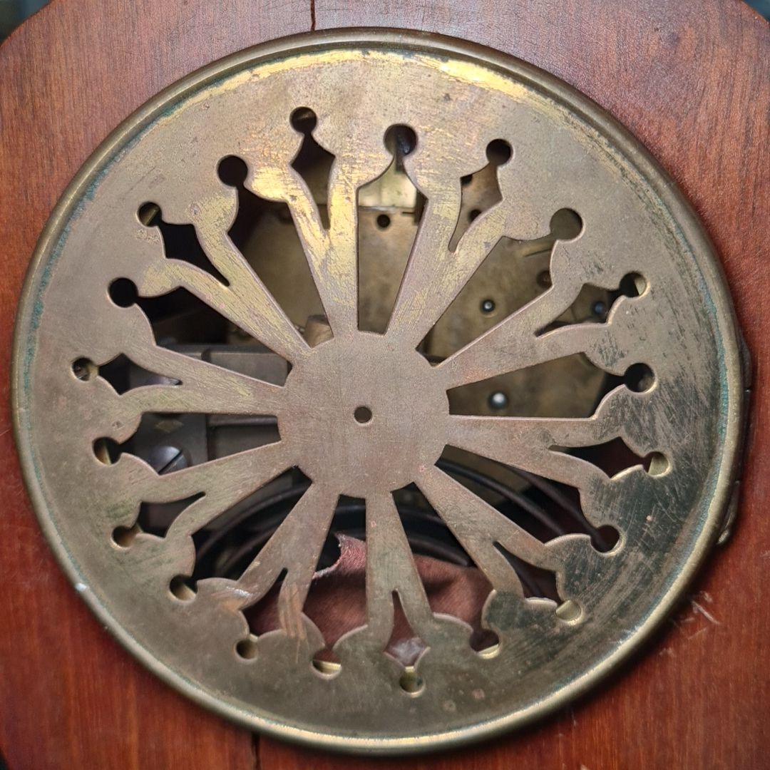 Star Lot: A truly magnificent Edwardian mahogany mantel clock made by the renowned clock maker Samuel Marti. This clock features fine inlay, brass hardware, enameled dial and roman numerals as well as the makers stamp and date inside the clock, "Medaille D'Or Samuel Marti Paris 1900' meaning 'Gold Medal'. Marti in Paris, in the second half of the 1800s, established his business in 1841 in Montbéliard, northeast France that was the birthplace of many of the most prestigious clockmakers. Marti exhibited his clocks regularly at expositions in Paris, where he won a Mention of Honour in 1839, a Bronze Medal in 1860, a Silver Medal in 1889, and several Gold Medals (1841, 1851, 1852, 1900). Marti's clocks begin at €2,580 and can go as high as €18,840 on 1st.dibs.com. There is a crack at the back of the clock but this does not take away from its beauty.