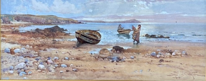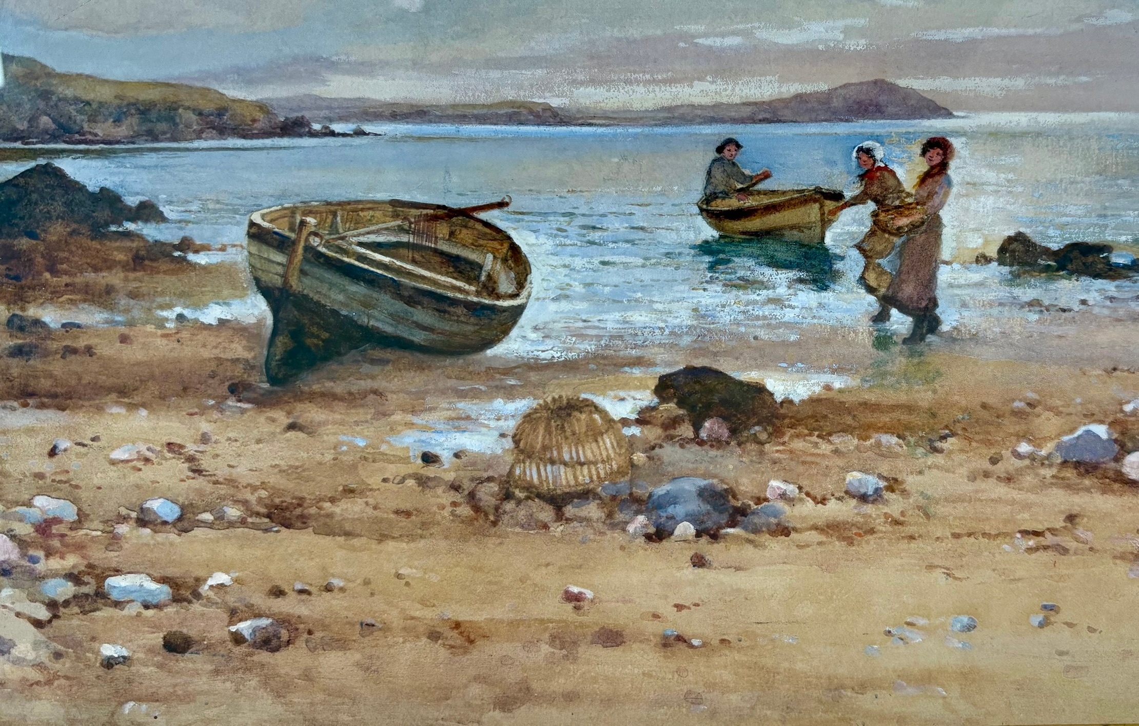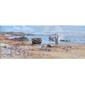 Coastal scene at low water with fisherman and family, probably West Country