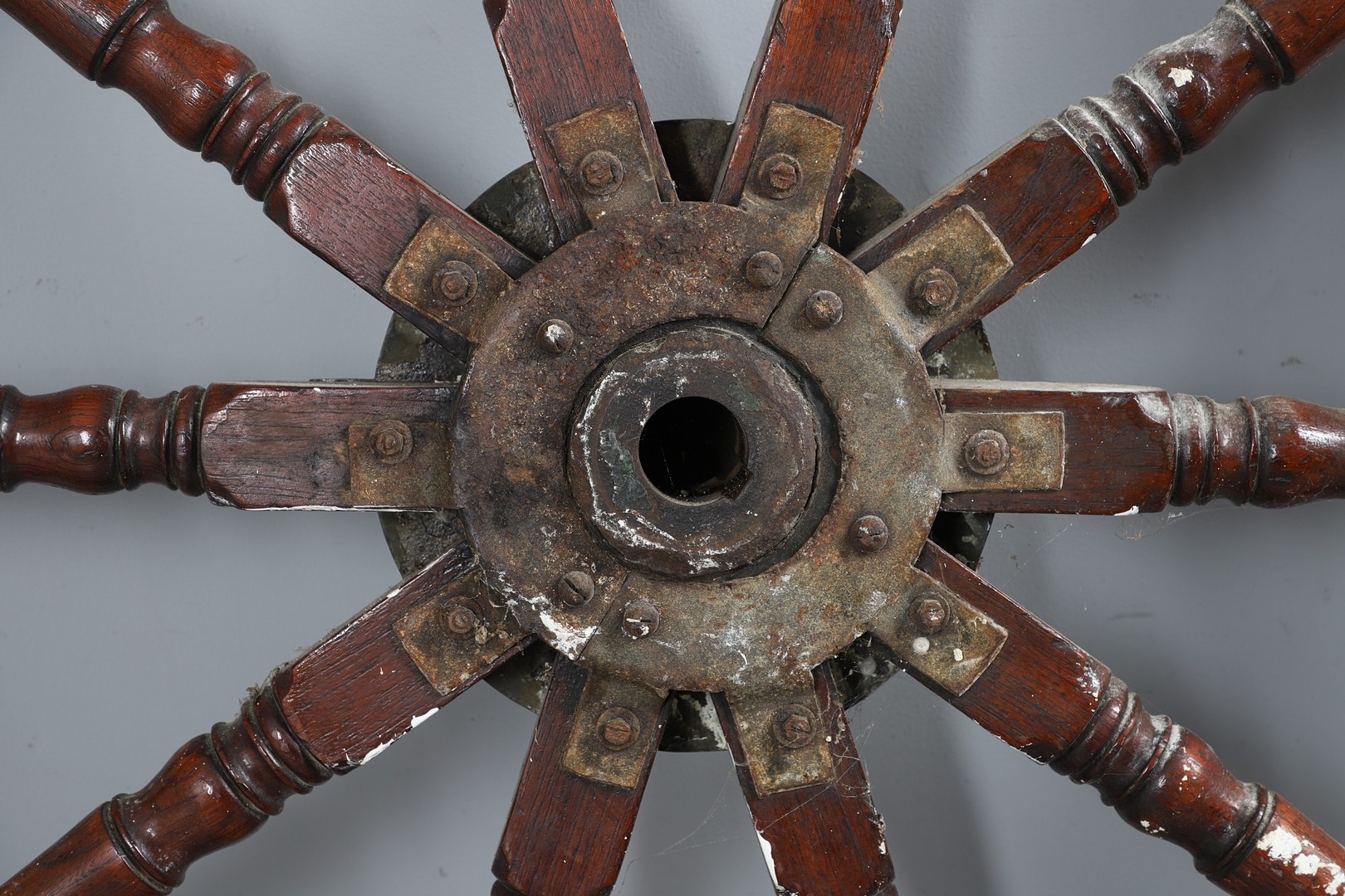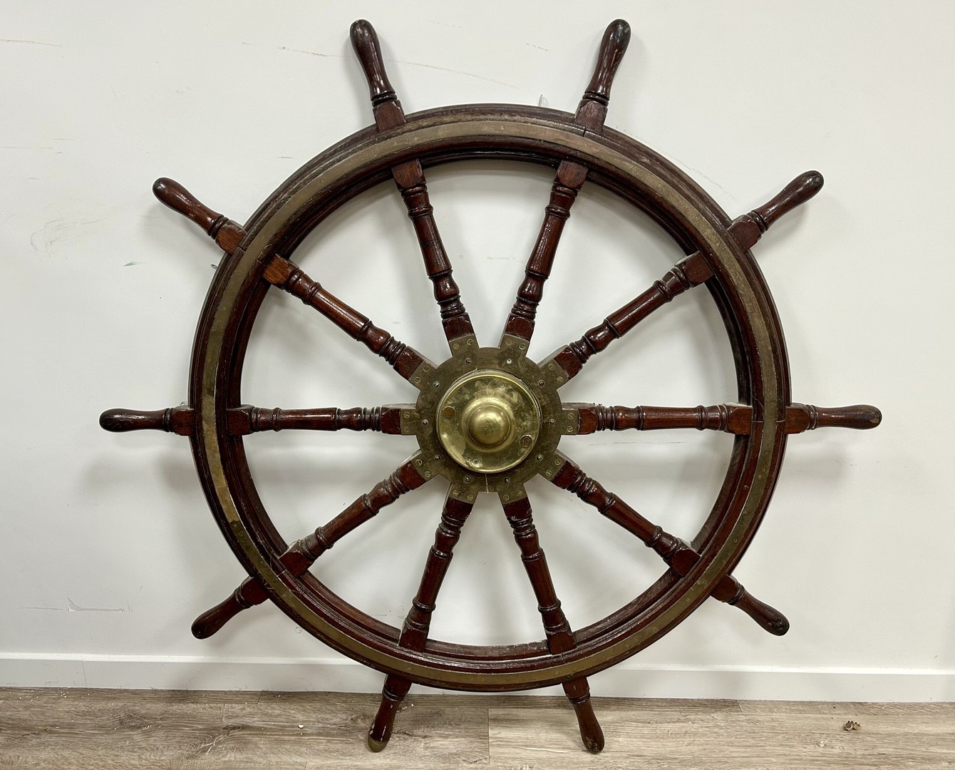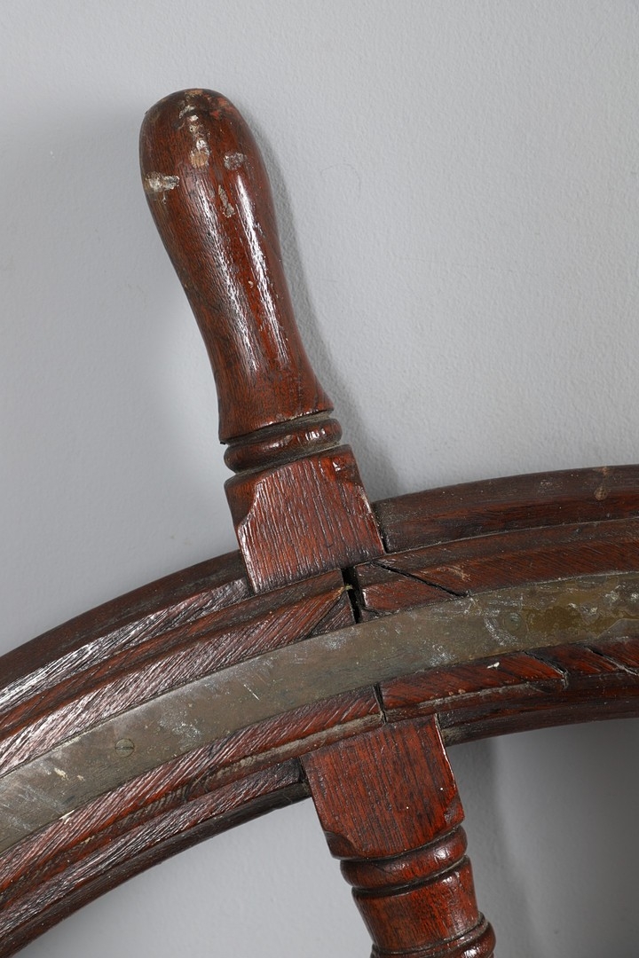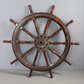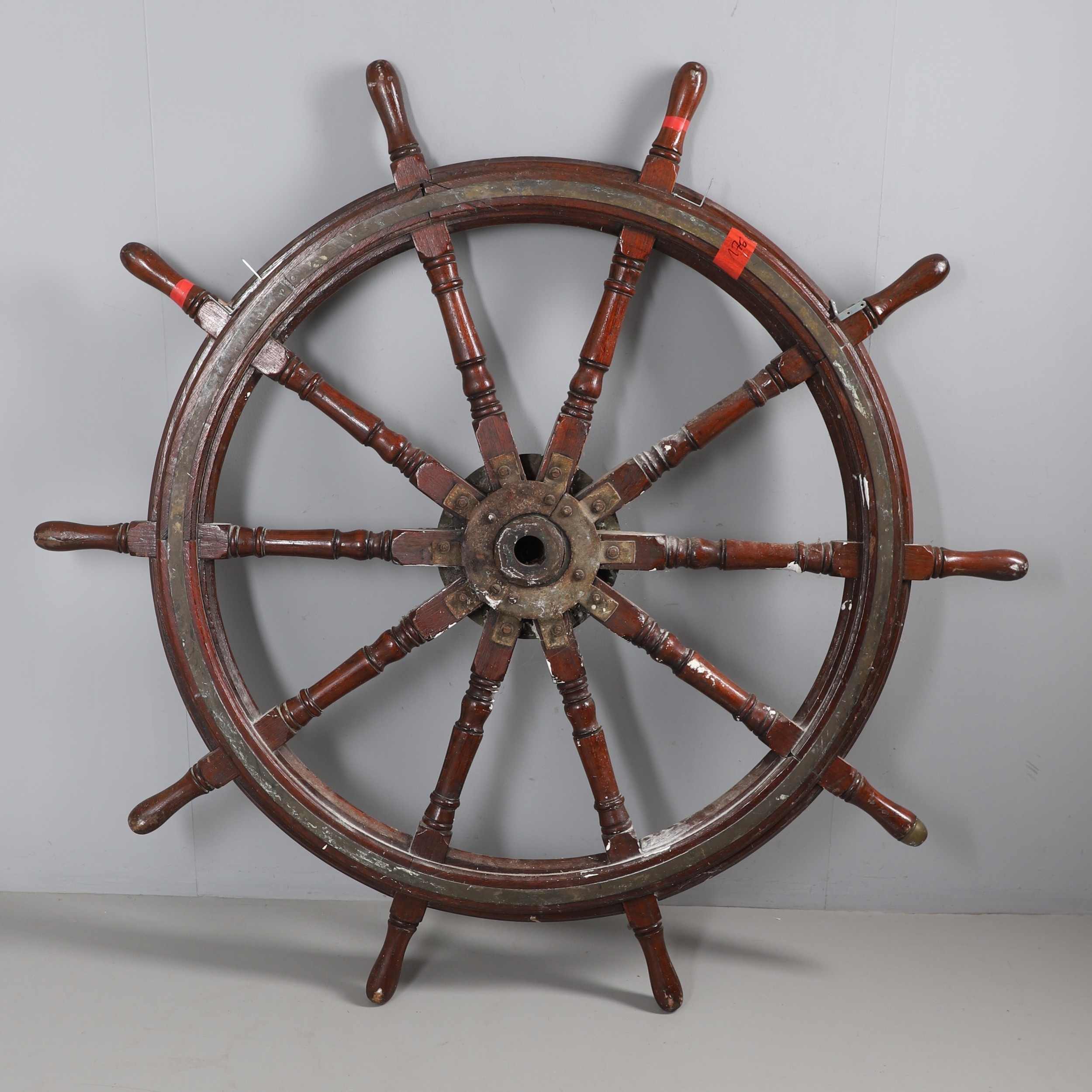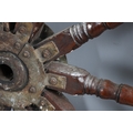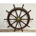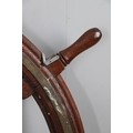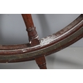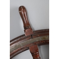 A LARGE MAHOGANY AND BRASS BOUND SHIP'S WHEEL. unattributed, set with two half pennys, dated 1952, 168cm diameter.
