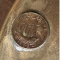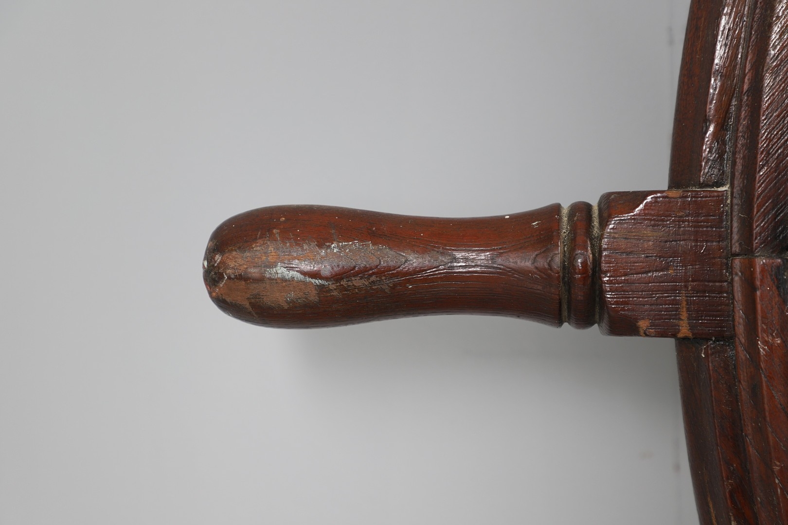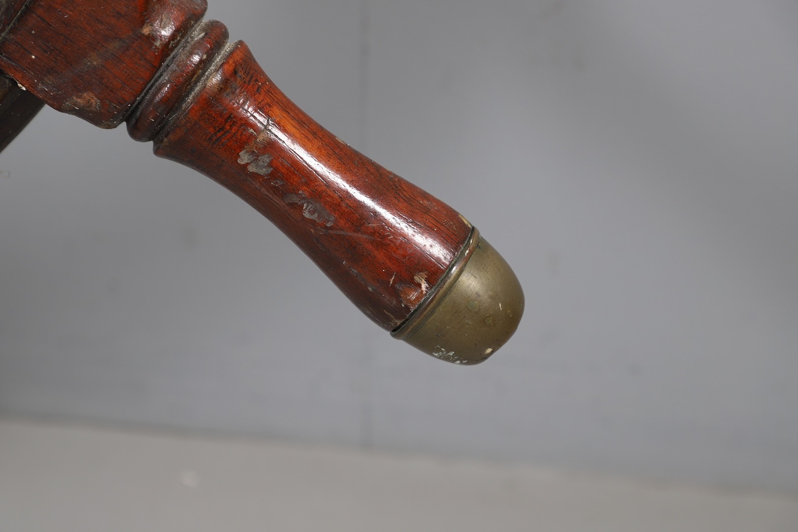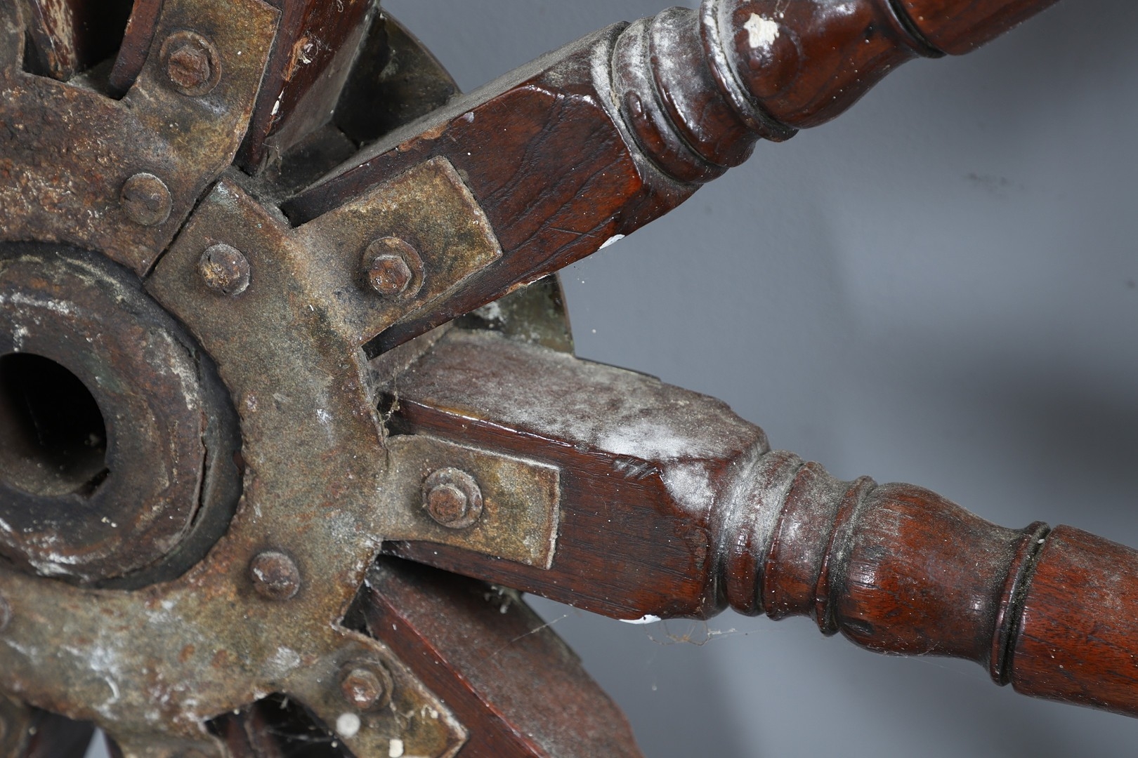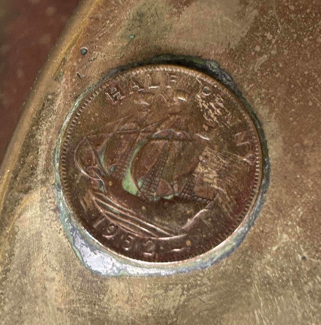 A LARGE MAHOGANY AND BRASS BOUND SHIP'S WHEEL. unattributed, set with two half pennys, dated 1952, 168cm diameter.