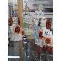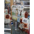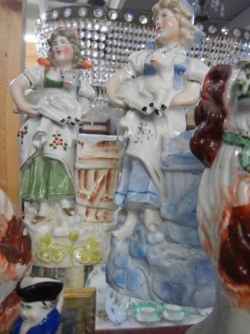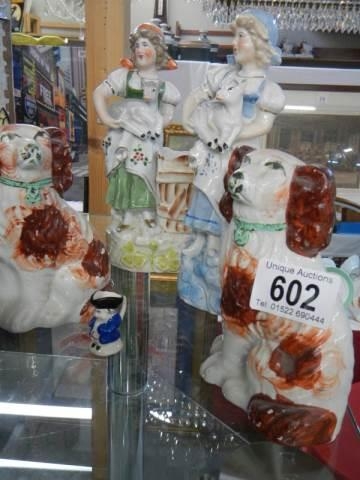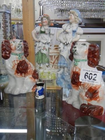 A pair of Staffordshire spaniels and two shepherdess figures.