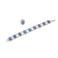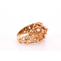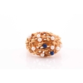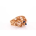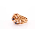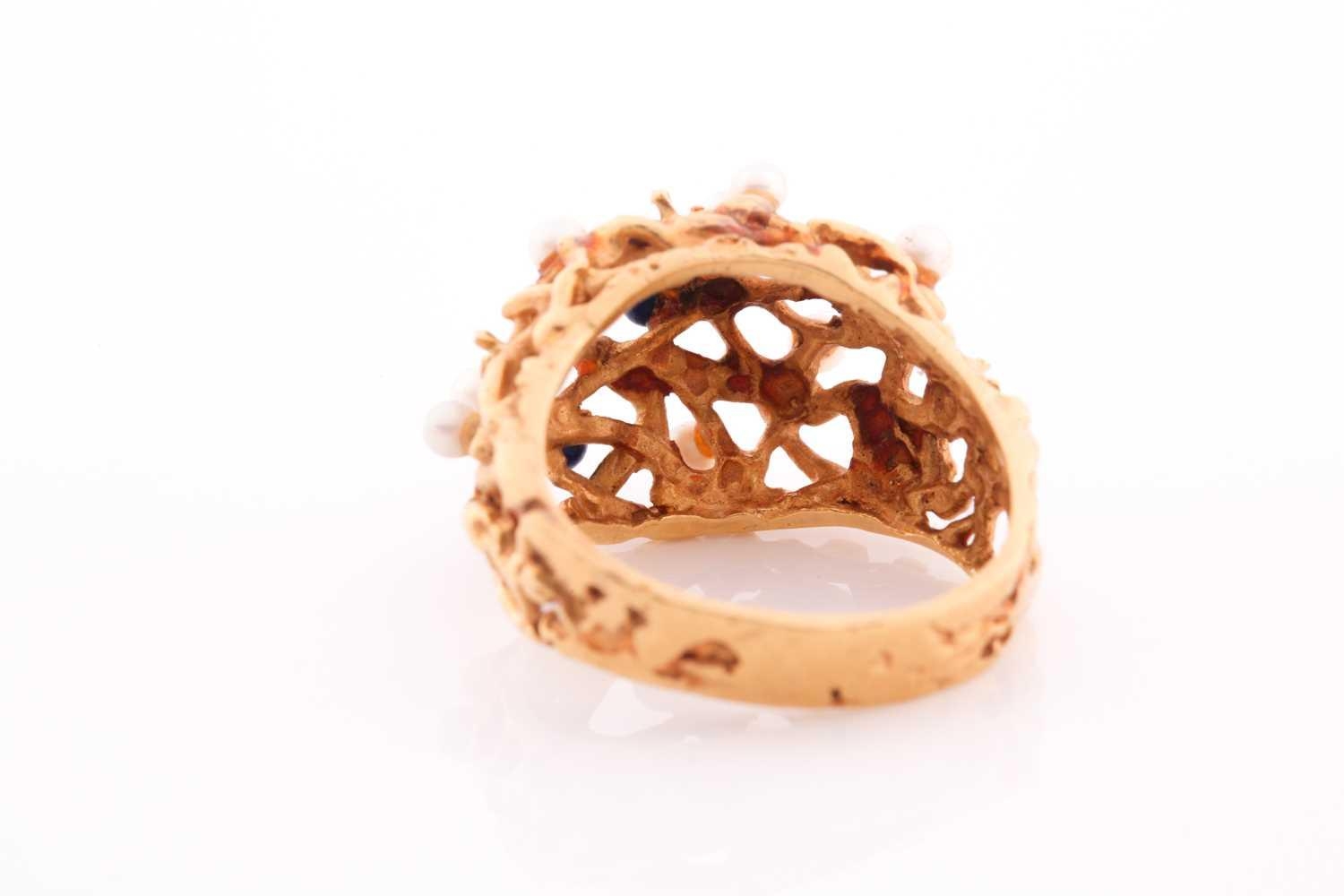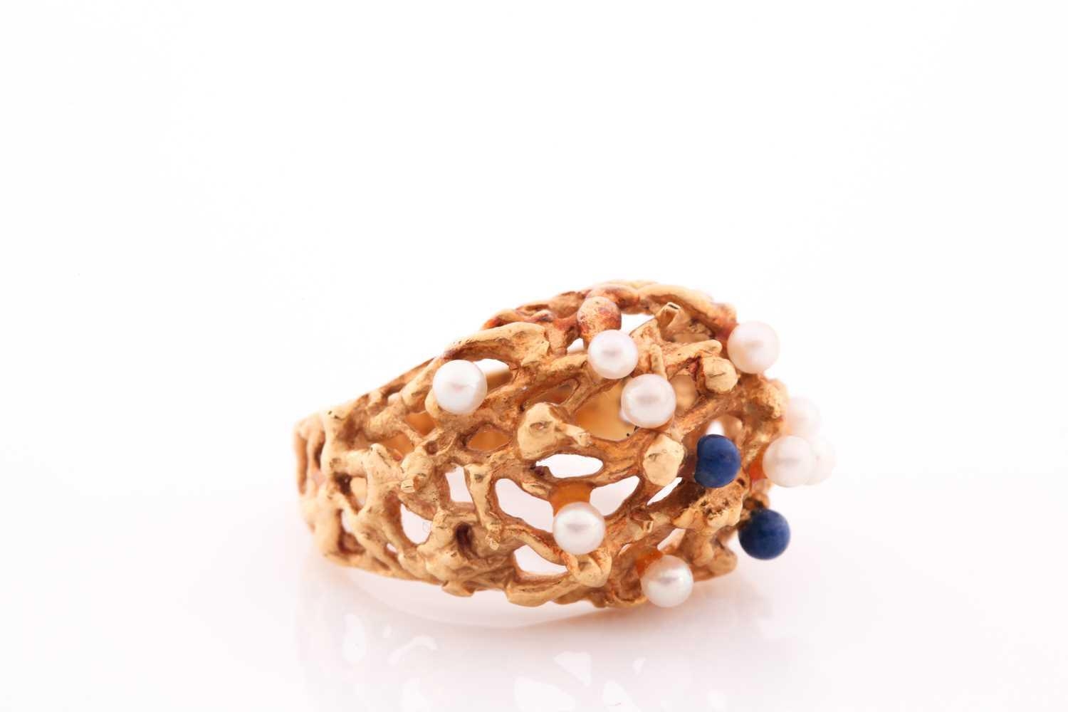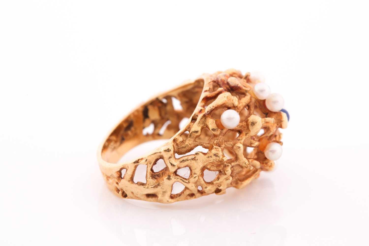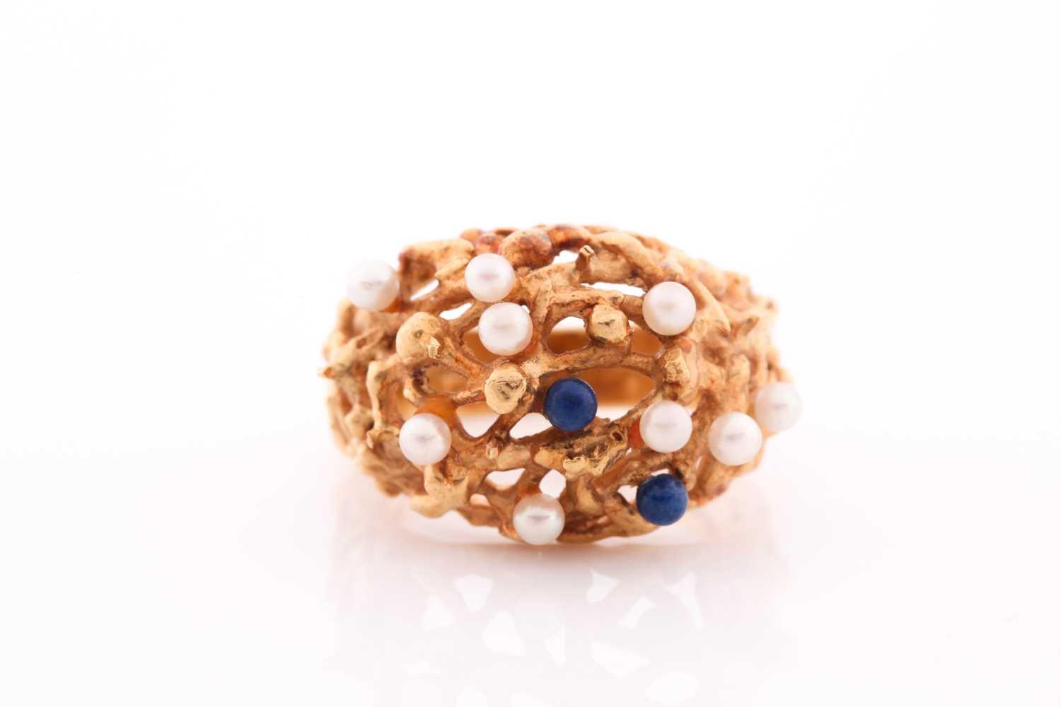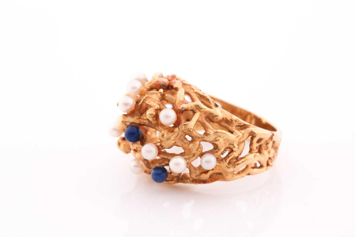 A yellow metal, pearl, and lapis ring, possibly made in Switzerland, the openwork mount set with small pearls and lapis, the shank marked 750, size M 1/2.