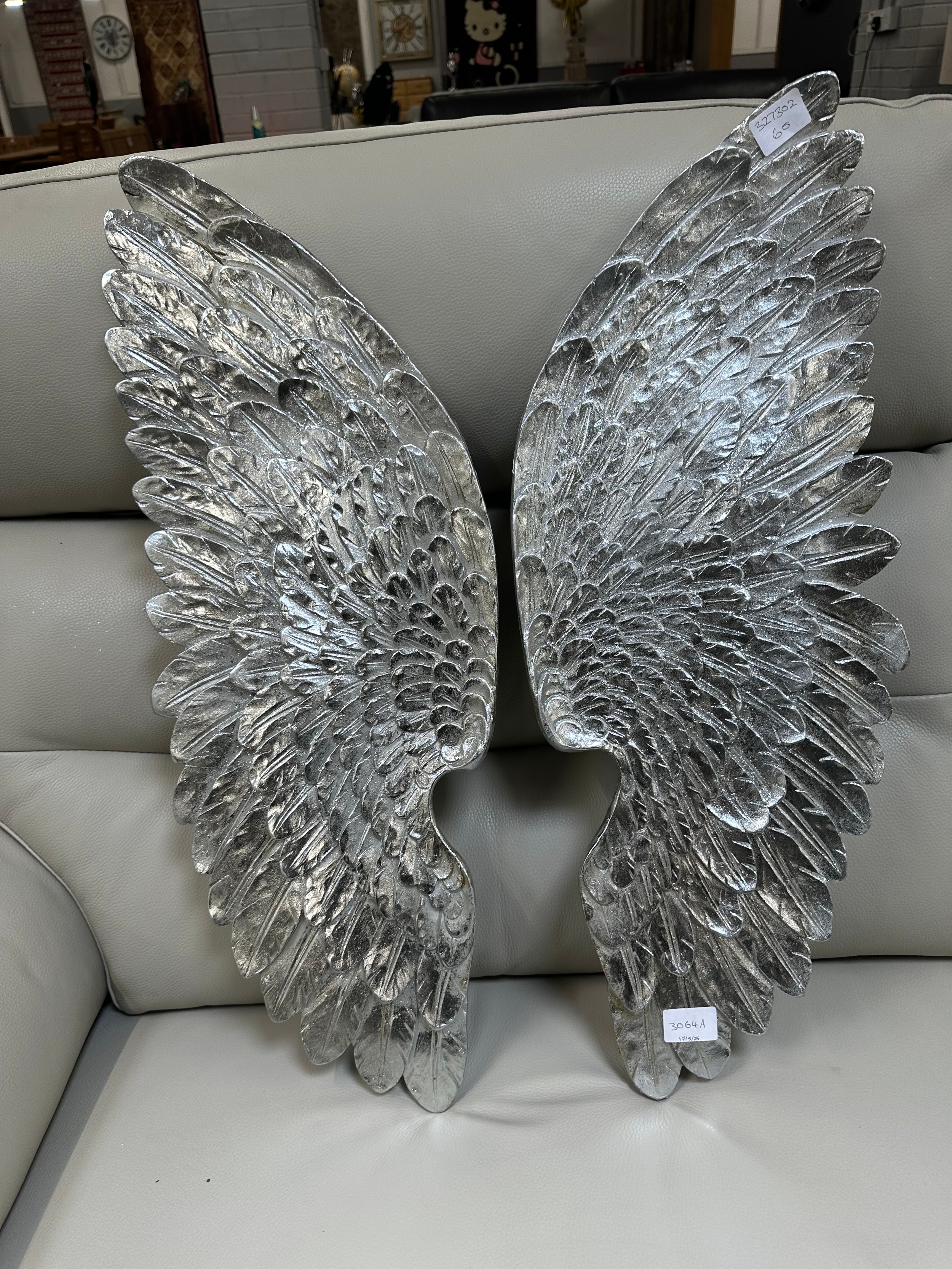 A pair of silver painted wall hanging wings