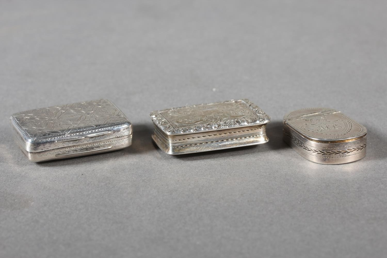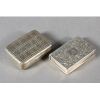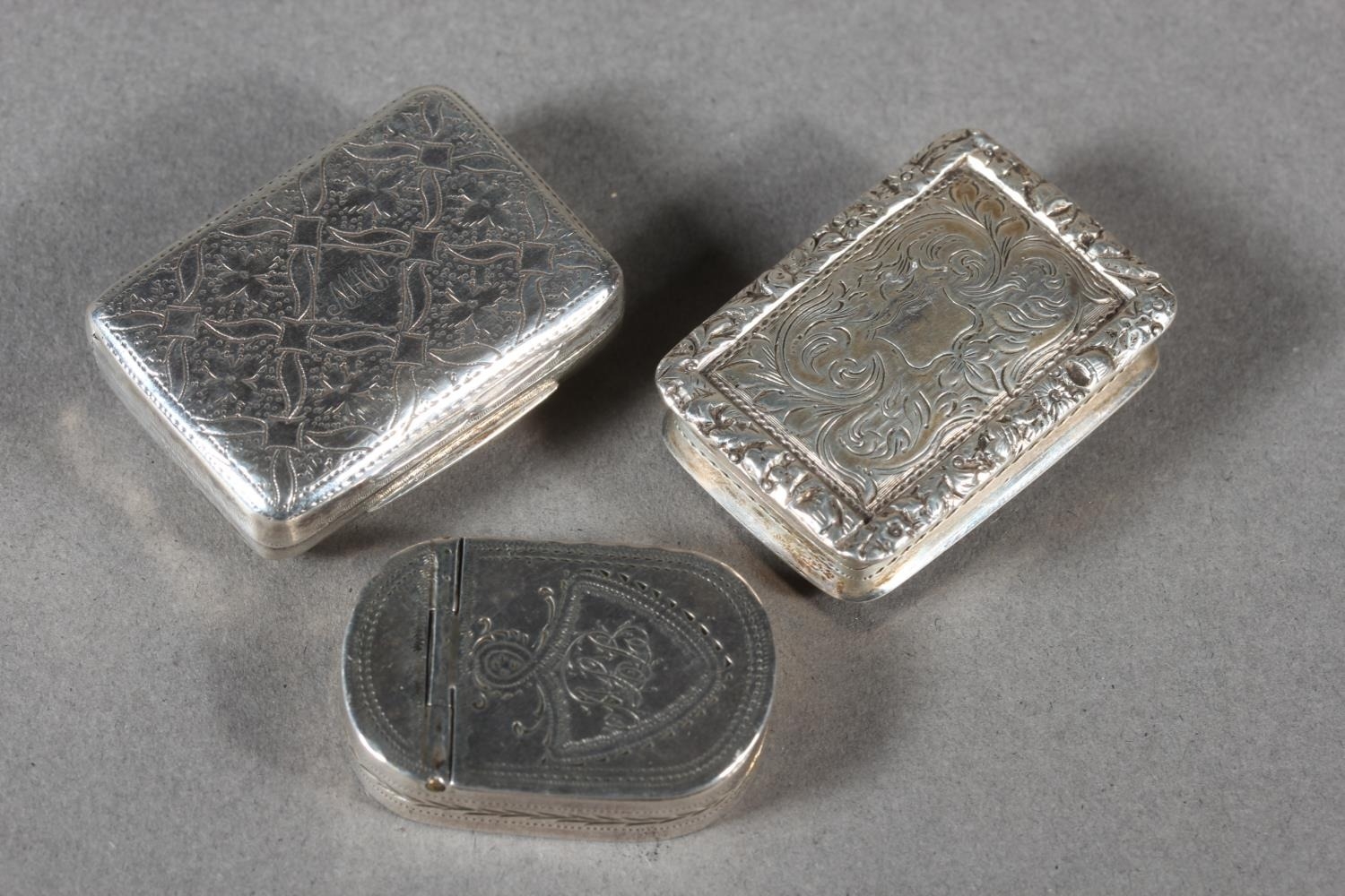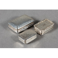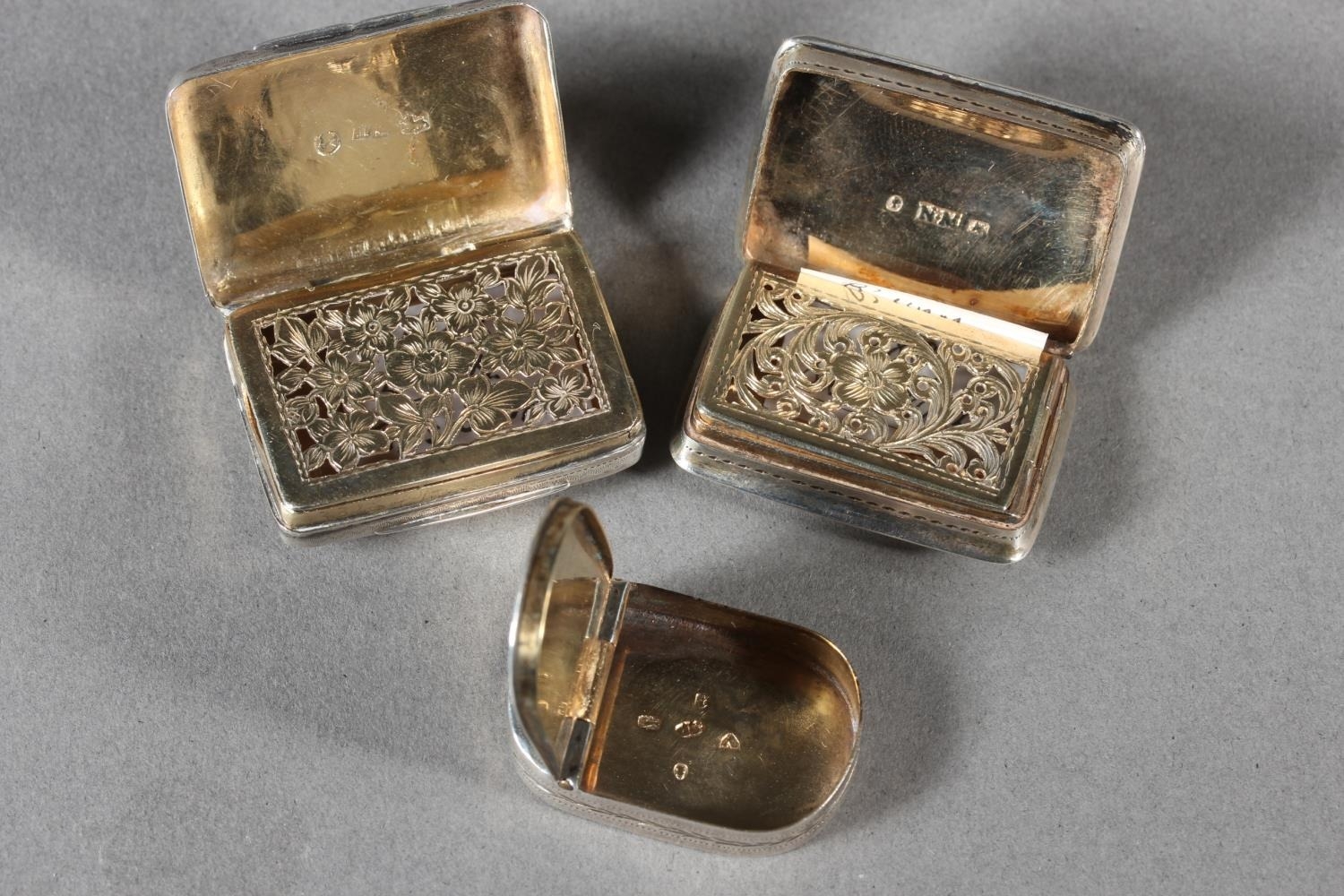 Two antique silver vinaigrettes, Nathaniel Mills and Thomas Shaw, Birmingham, and a small silver snuff box, Sam Pemberton, Birmingham, 44g.