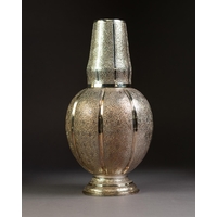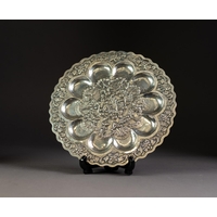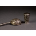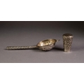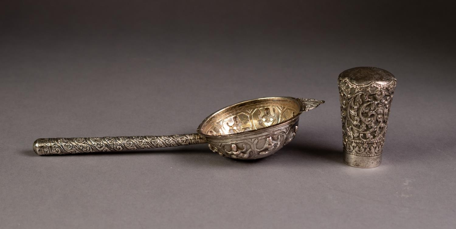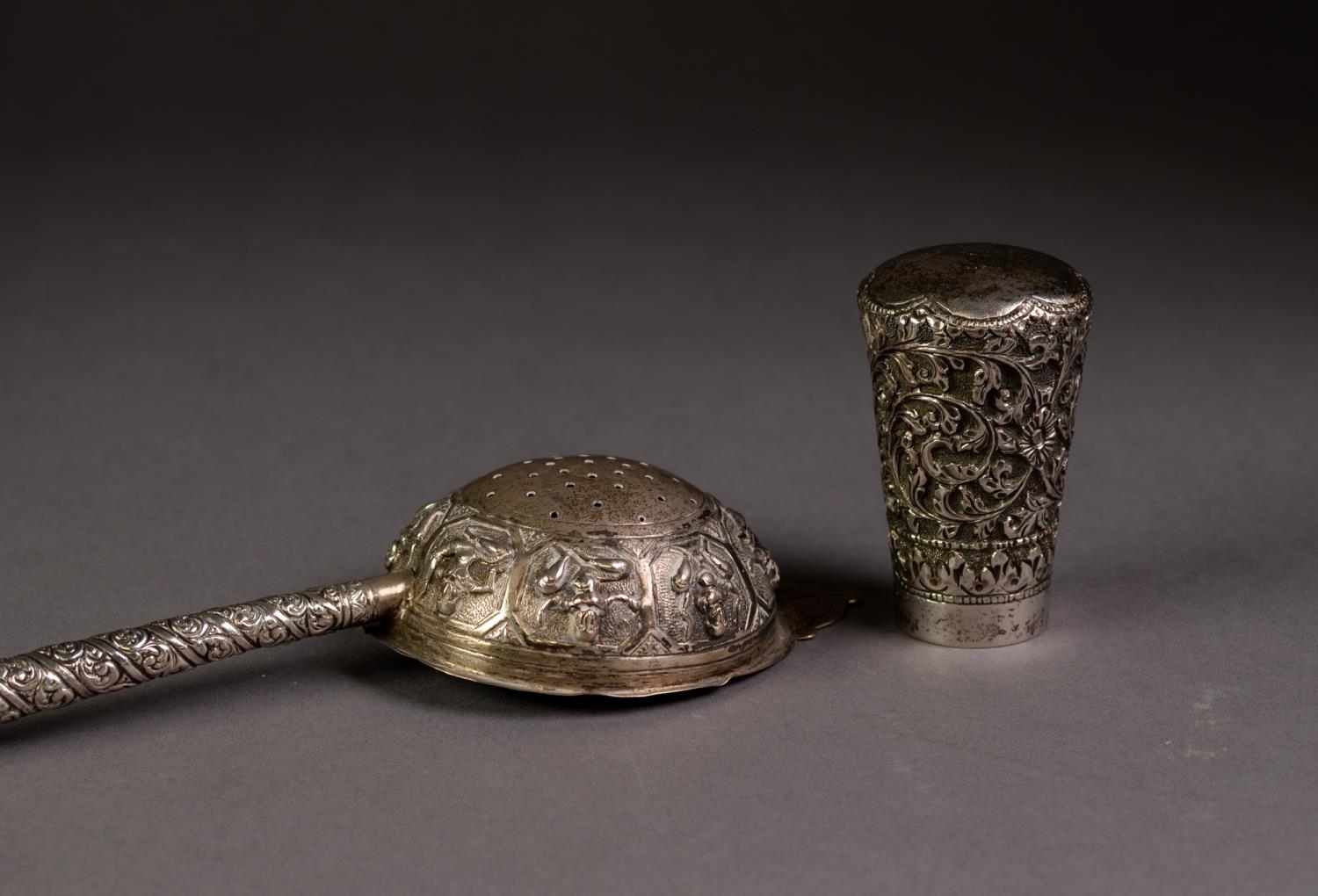 FAR EASTERN SILVER COLOURED METAL TEA STRAINER, the bowl repousse with figures, the straight handle repousse with a spiral of foliate scrolls, 8 1/4in (20.9cm) long and an INDIAN SILVER COLOURED METAL WALKING STICK POMMEL, chased and repousse with flowers and foliate scrolls, 2 5/8in (6.6cm) high