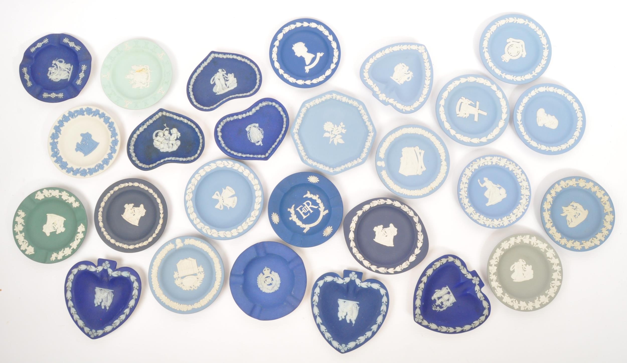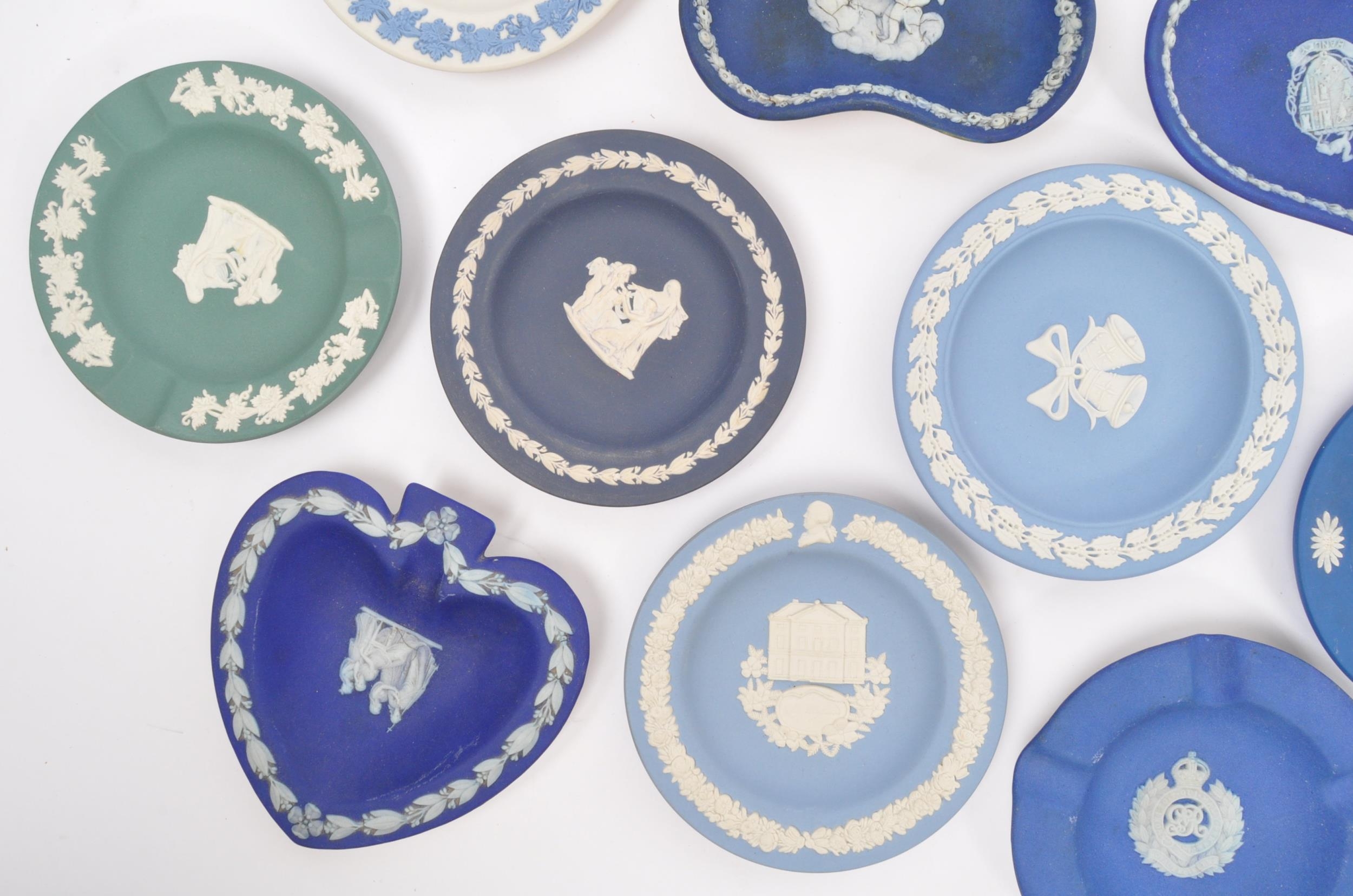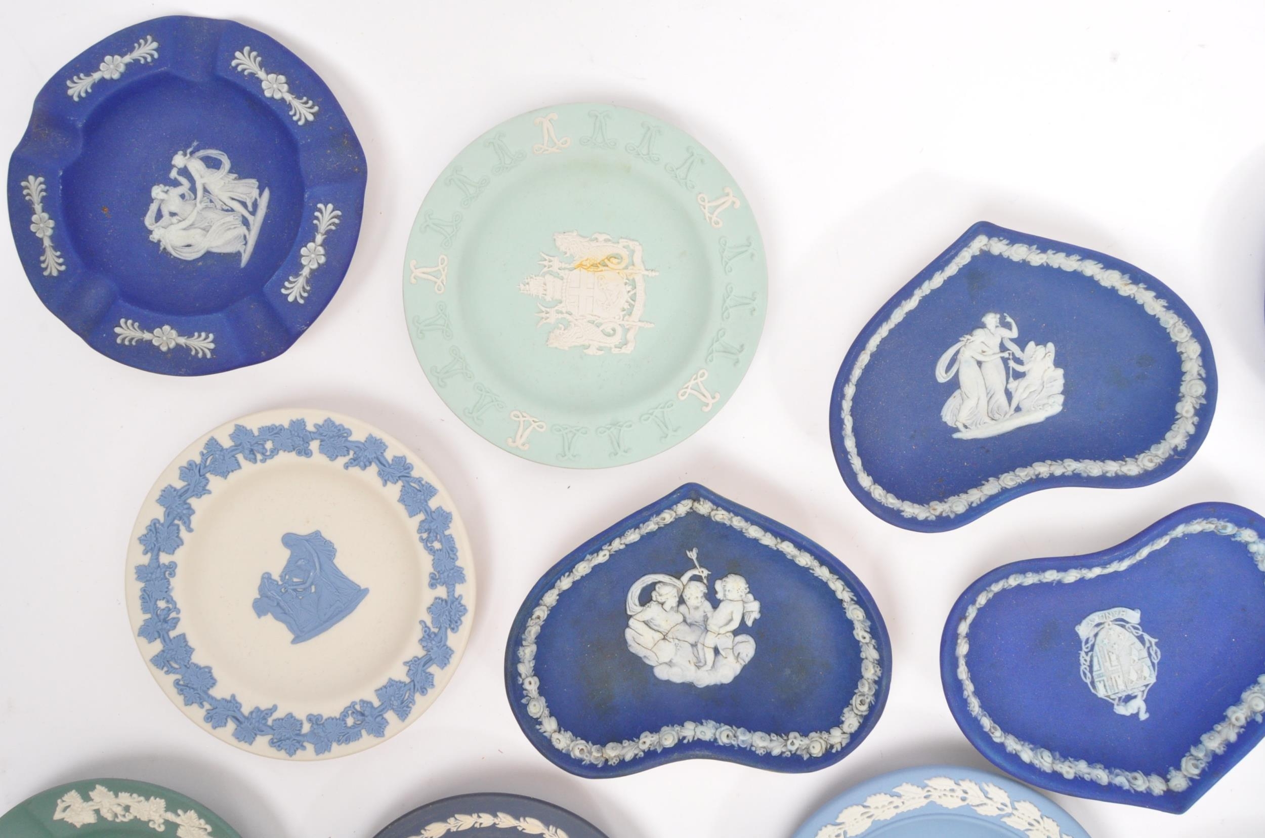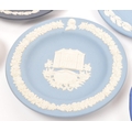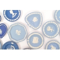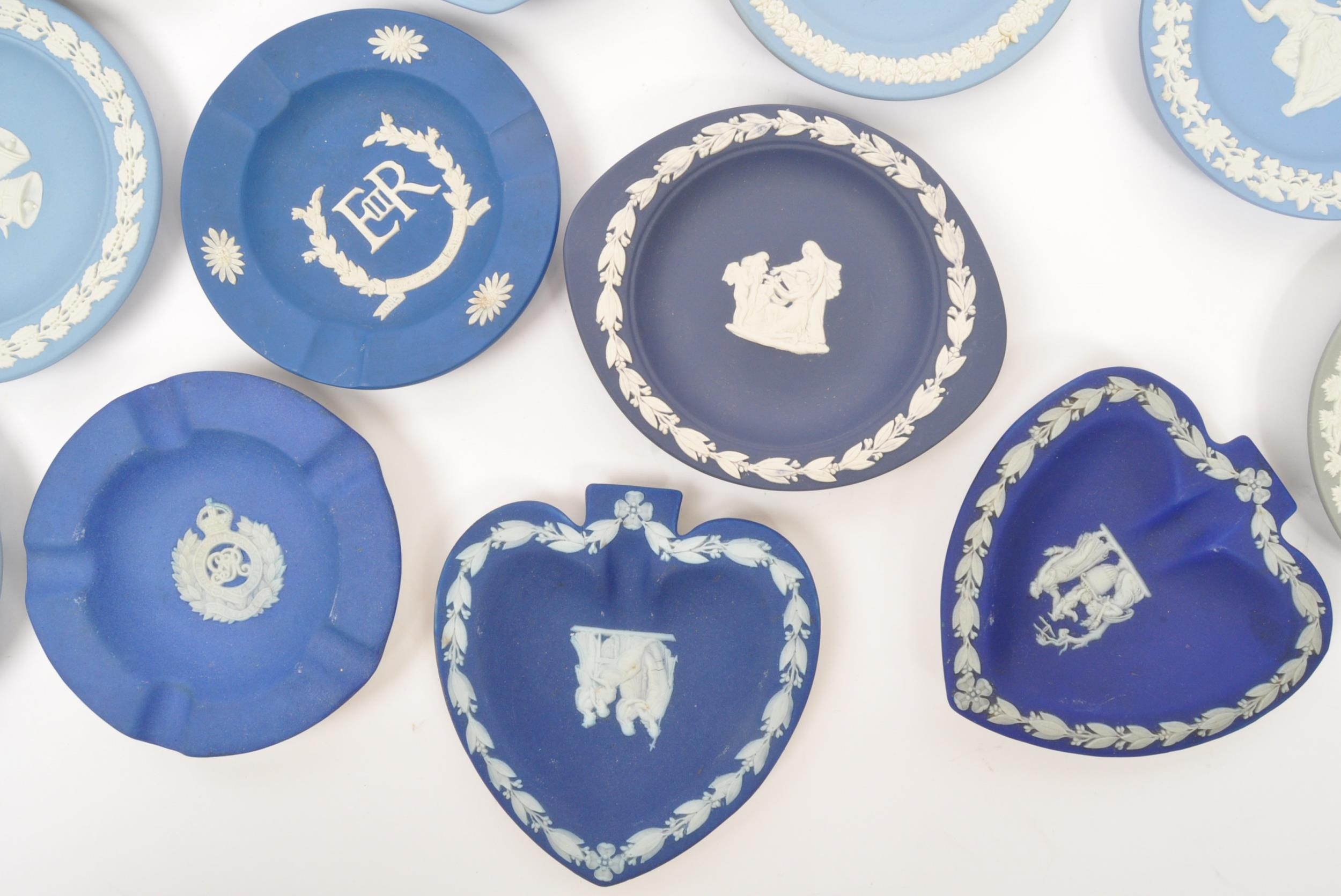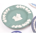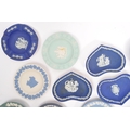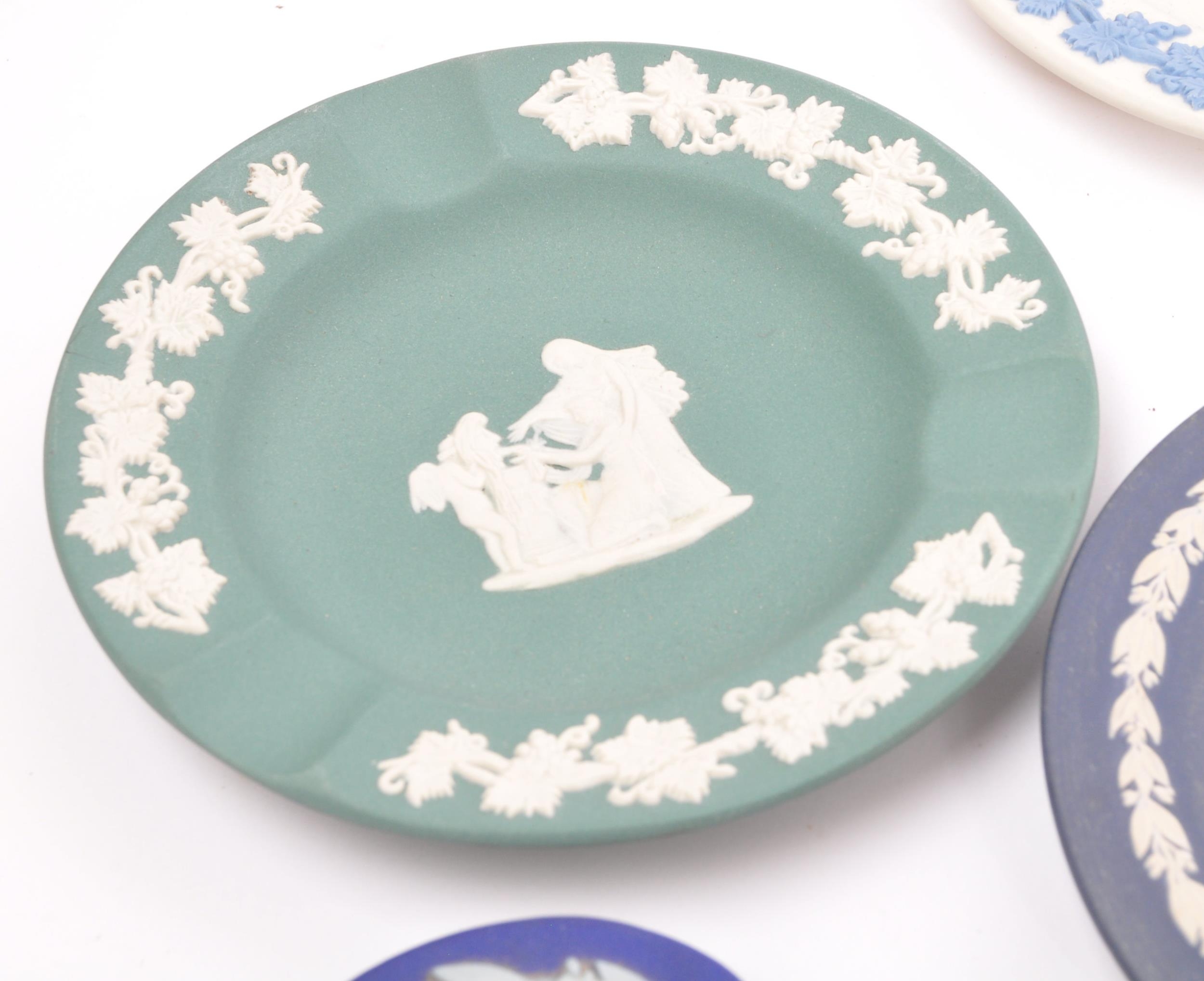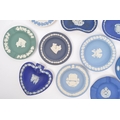 Wedgwood - A collection of 20th century Wedgwood jasperware to include ashtrays and pin dishes. Each piece having sprigged borders with central motifs in relief of bells, classical figures, cupid, Queen Elizabeth II. In varying shapes of clover, hearts and octagonal. Measures 13cm diameter.