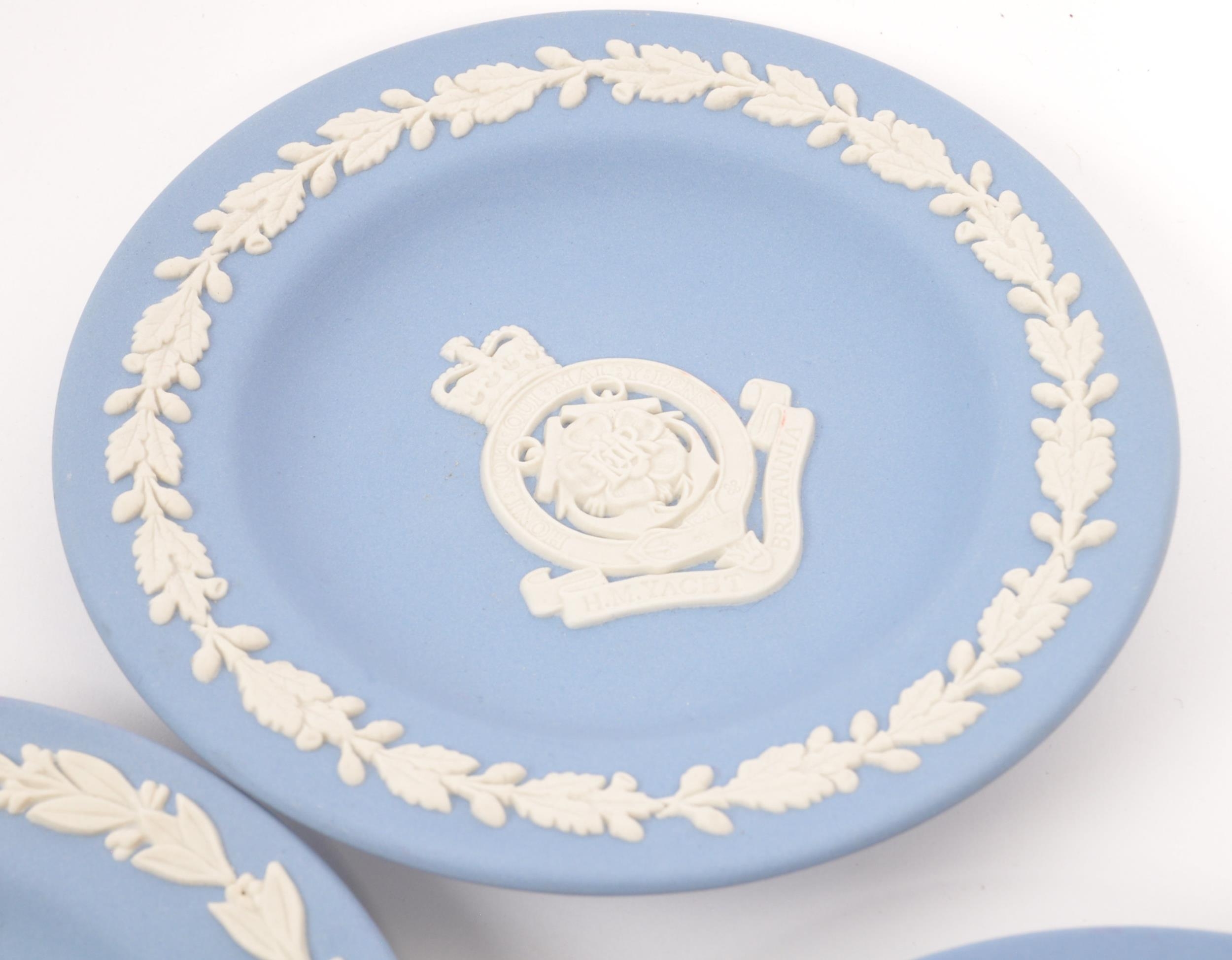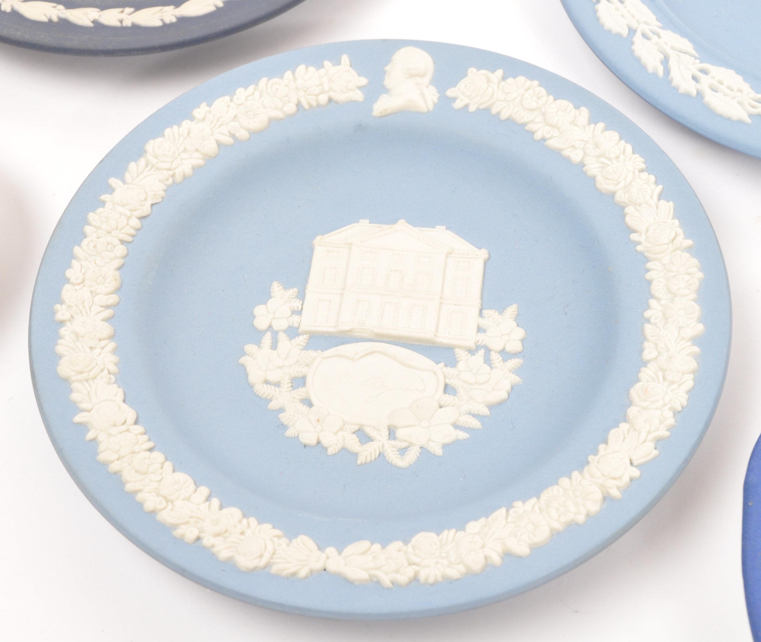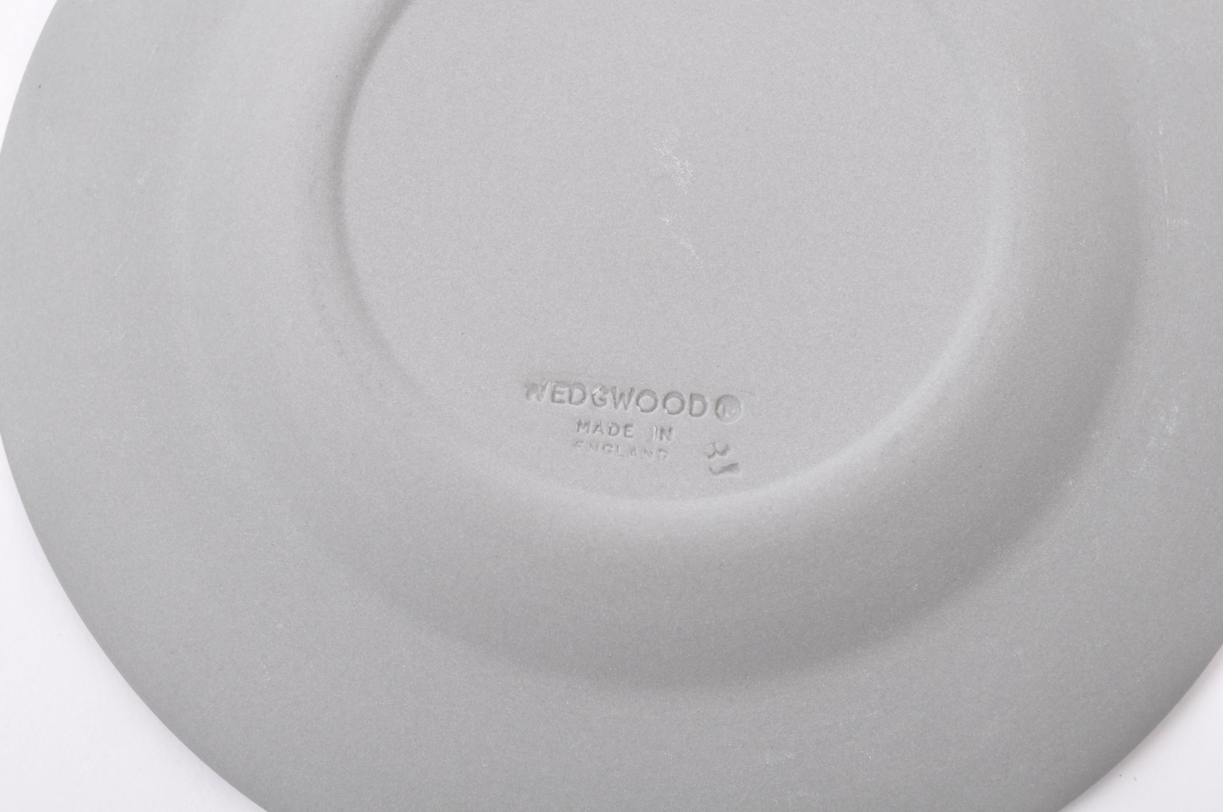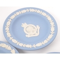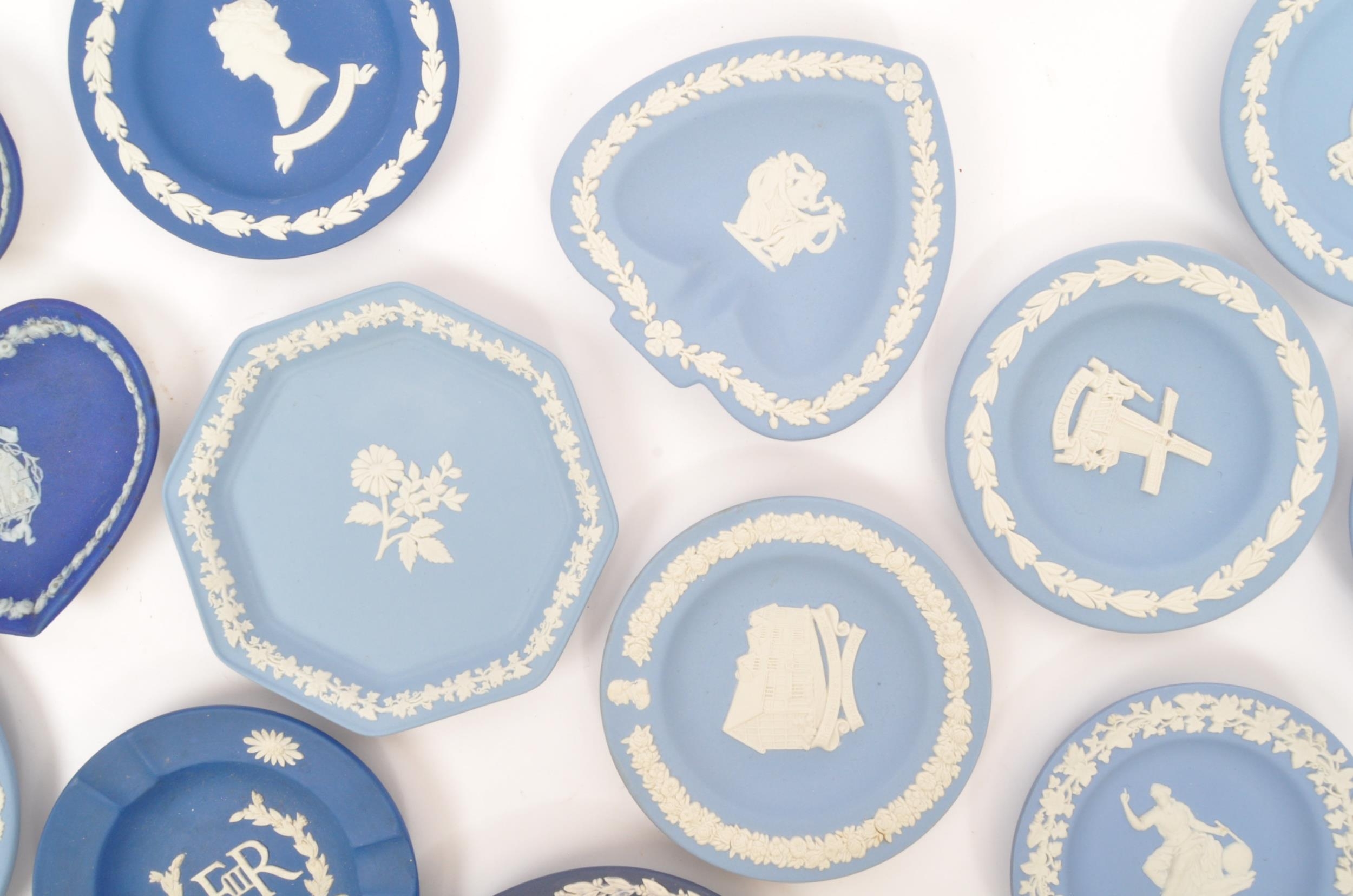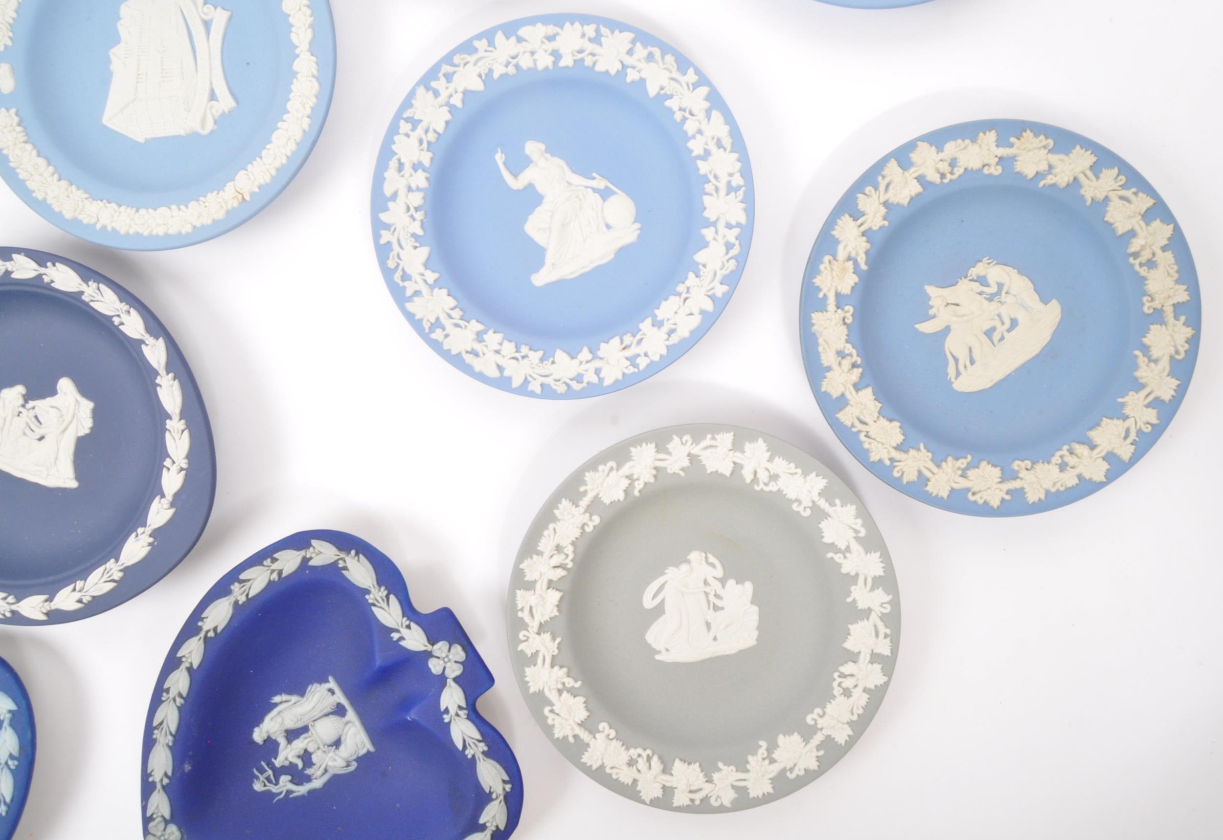 Wedgwood - A collection of 20th century Wedgwood jasperware to include ashtrays and pin dishes. Each piece having sprigged borders with central motifs in relief of bells, classical figures, cupid, Queen Elizabeth II. In varying shapes of clover, hearts and octagonal. Measures 13cm diameter.
