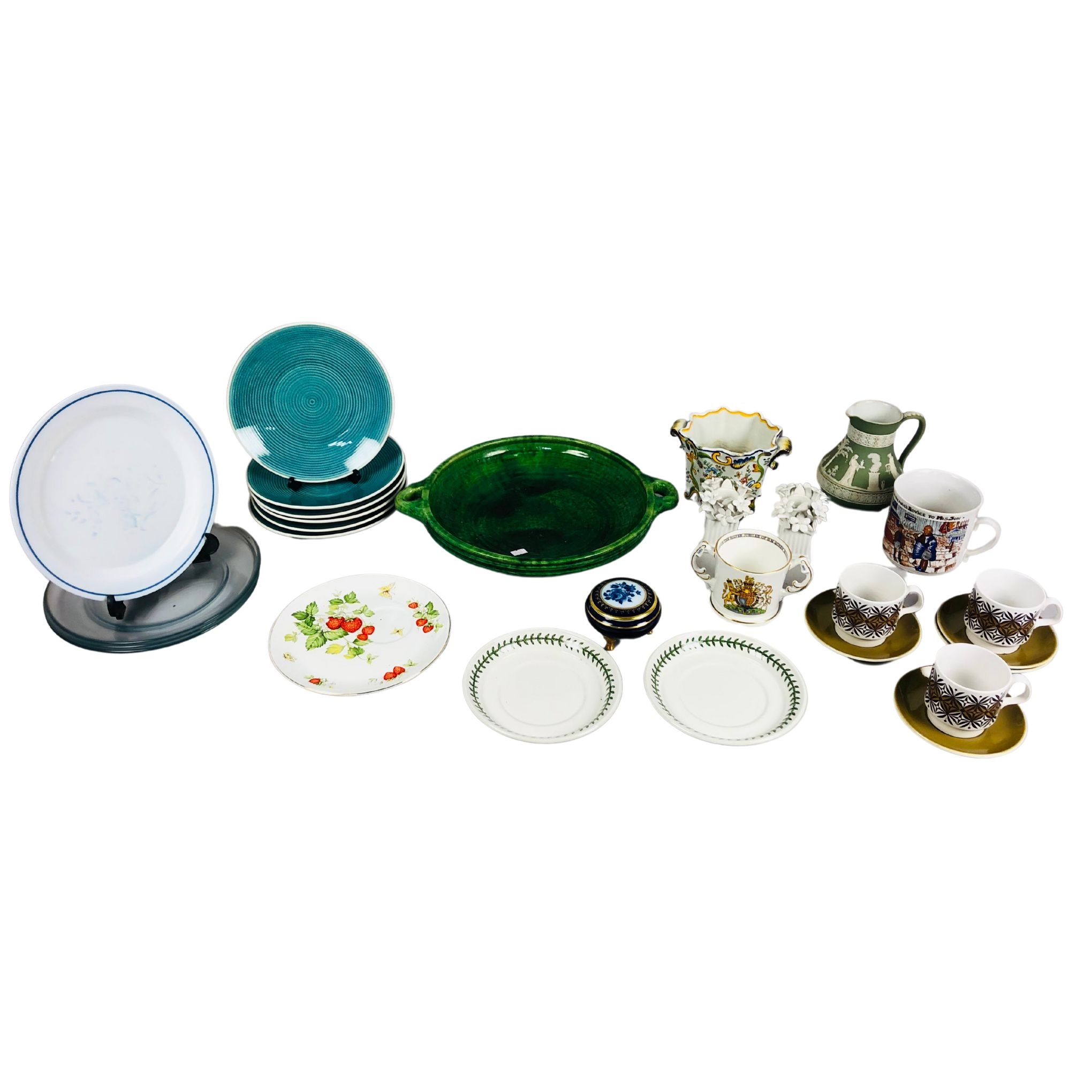 A Large Majolica Green Centre Bowl and Various pottery and China items to include a small faience plant pot and a Jasperware jug.