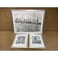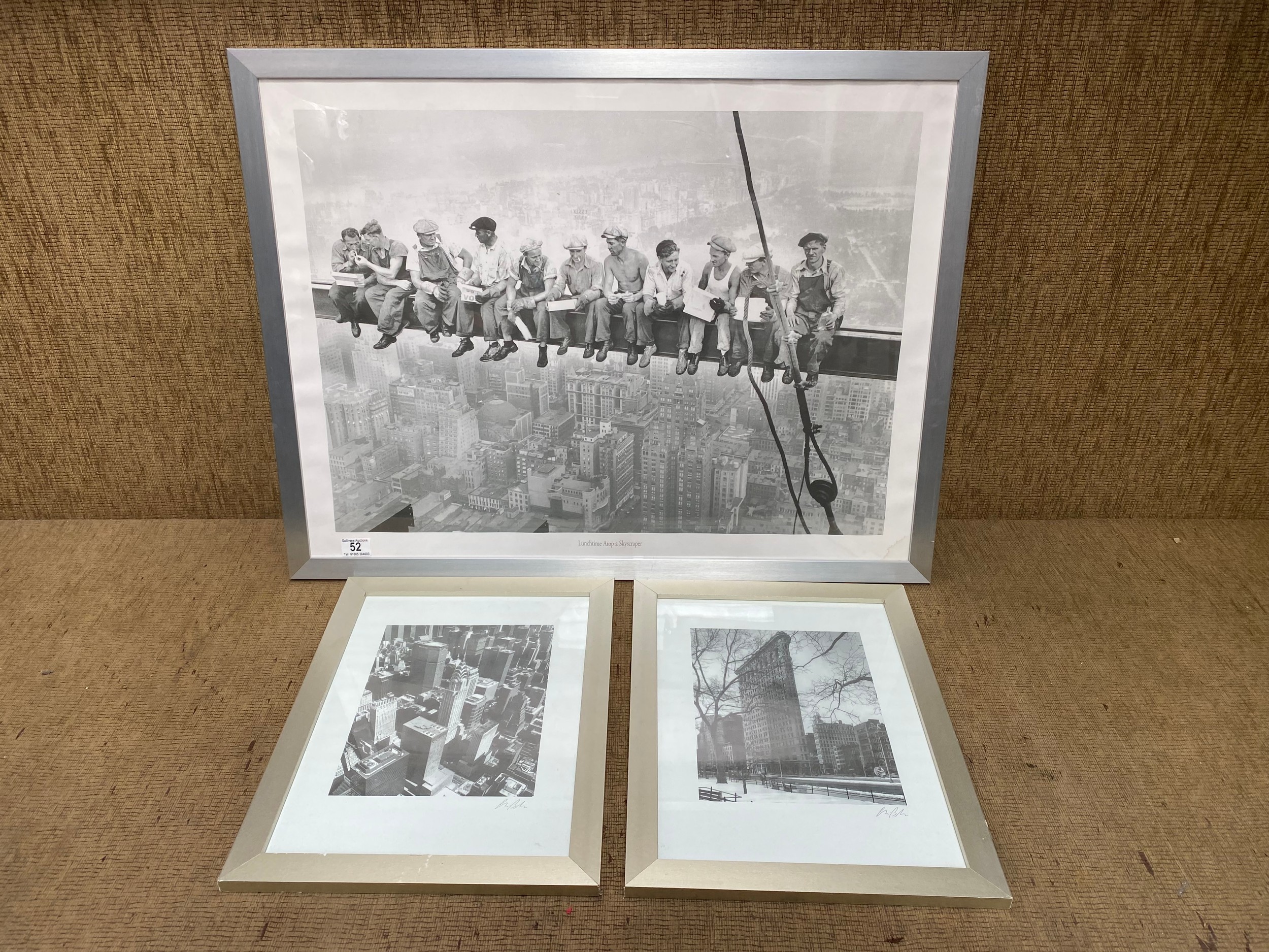Three New York-themed framed prints, including 'Lunchtime atop a skyscraper'.