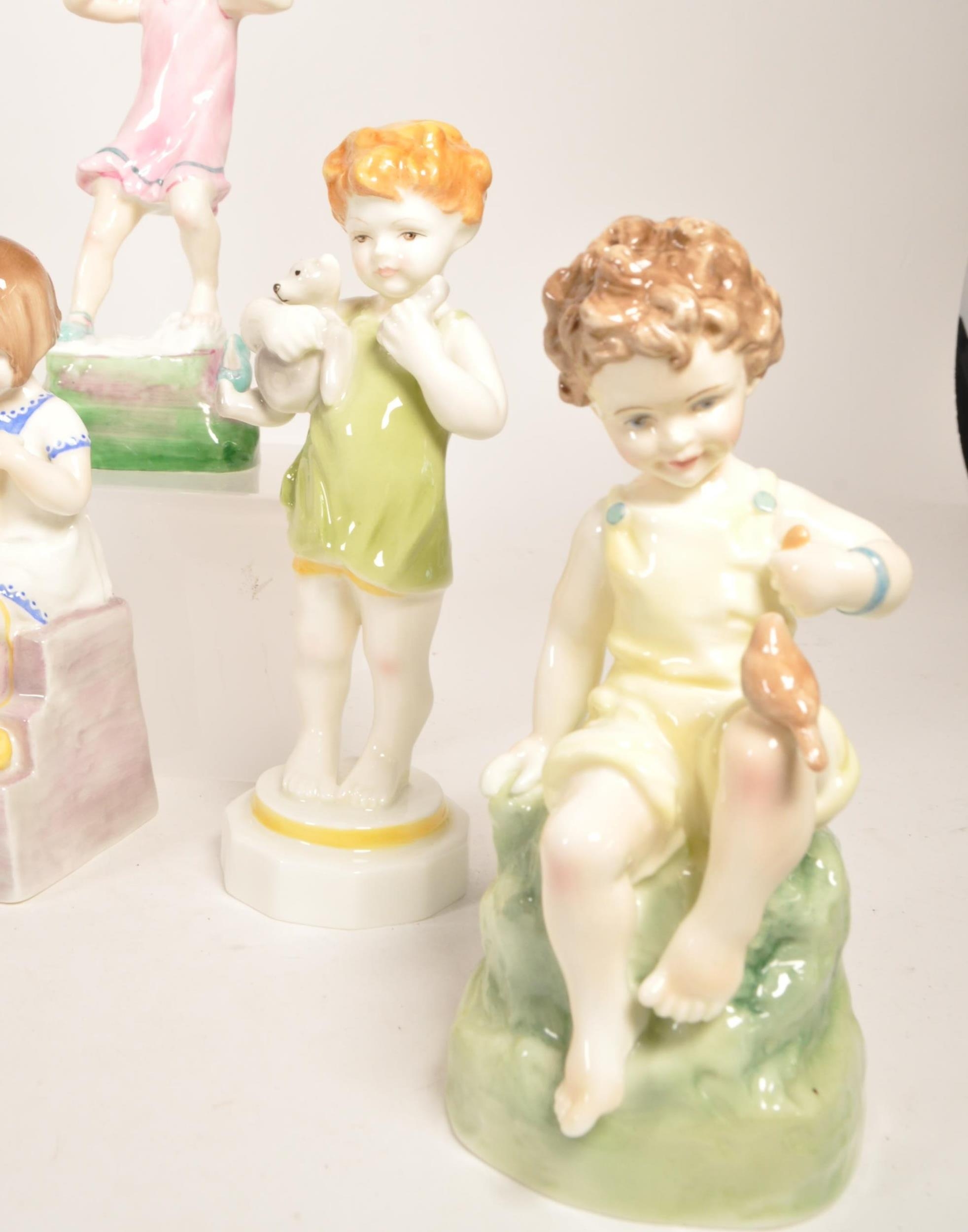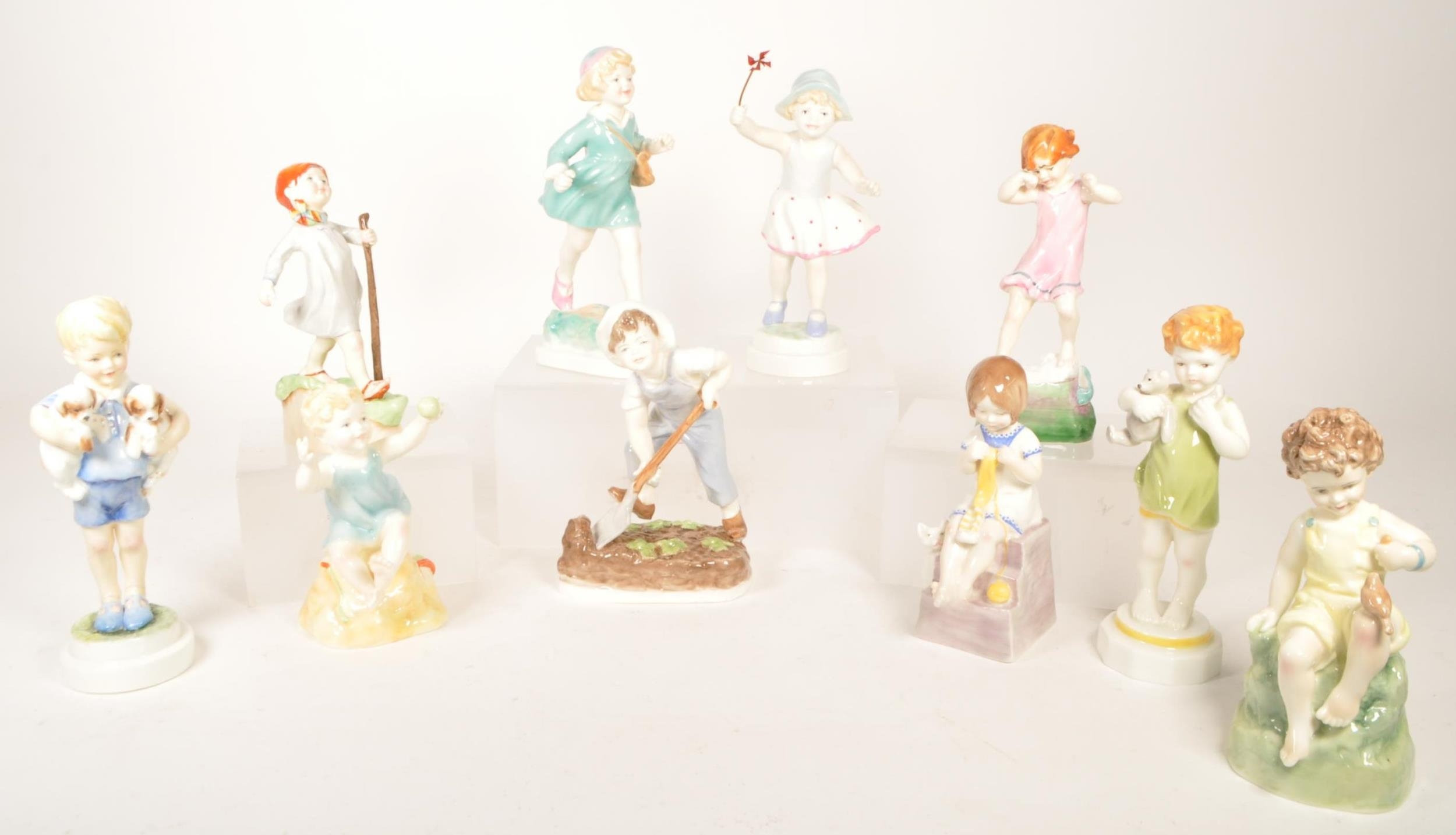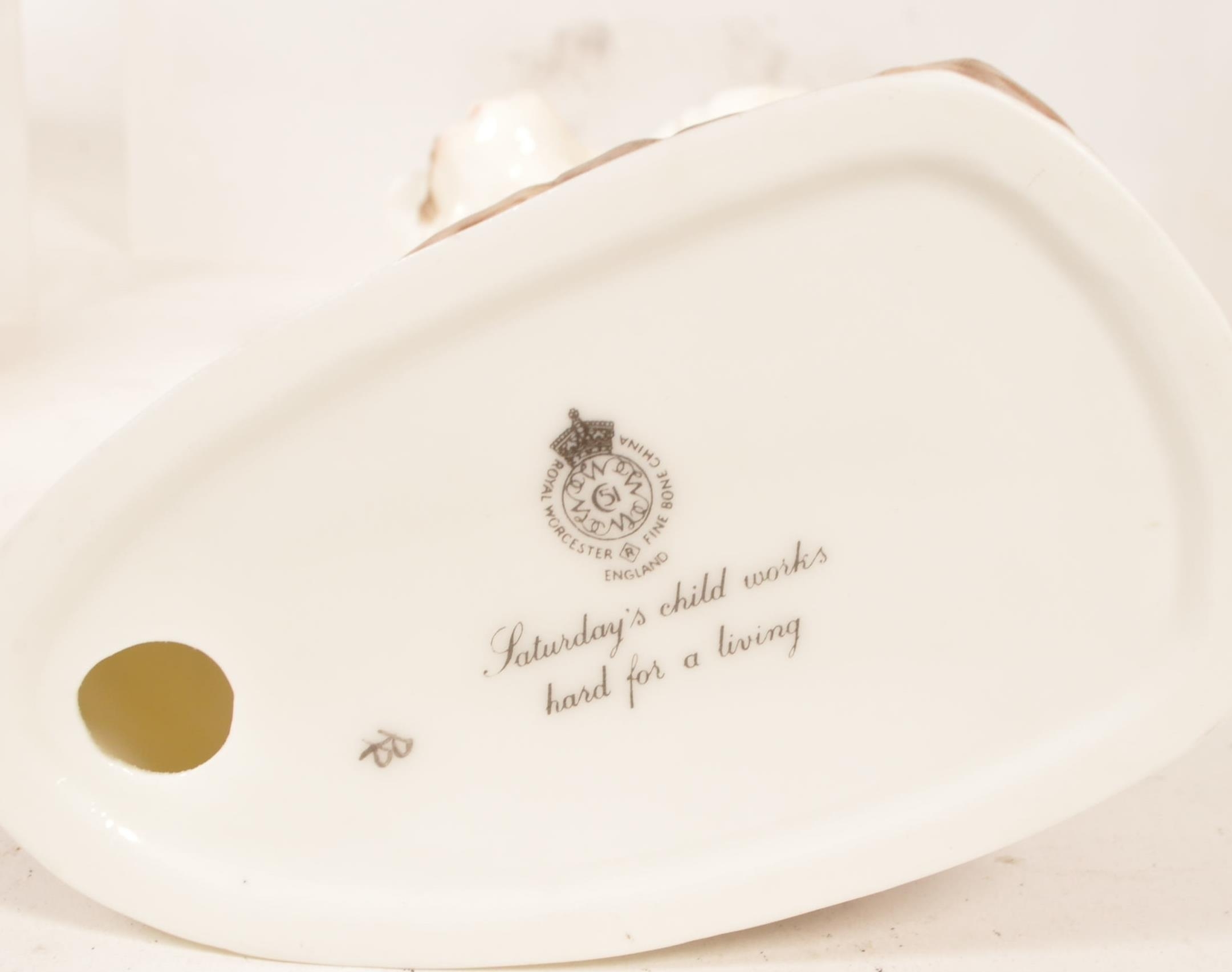 Royal Worcester - Collection of ten 20th century bone china Children of The Week figures. Examples including Monday's child if fair of face 3519, Wednesday's child is full of woe 3258, Thursday's child has far to go 3260, Friday's child is loving and giving, Saturday's child works hard for a living, and more. All with their makers marks to the underside. Largest measuring approx. 19.5cm tall.