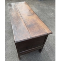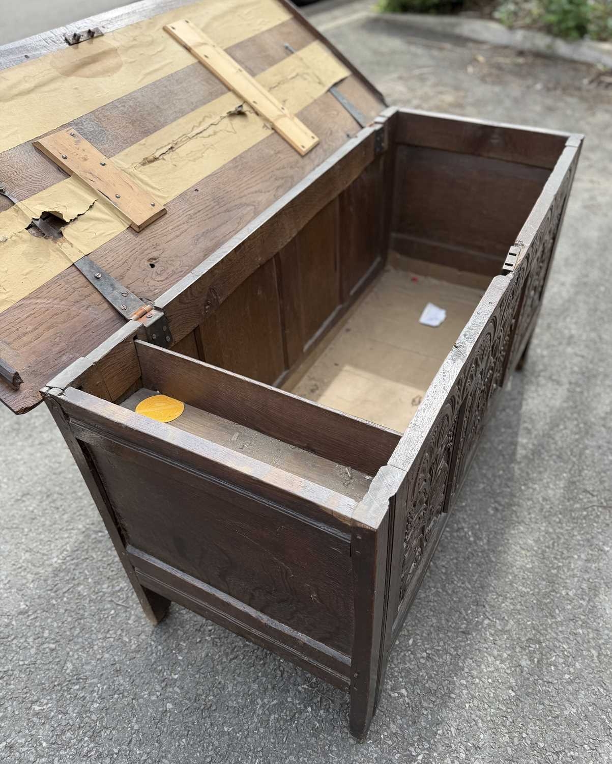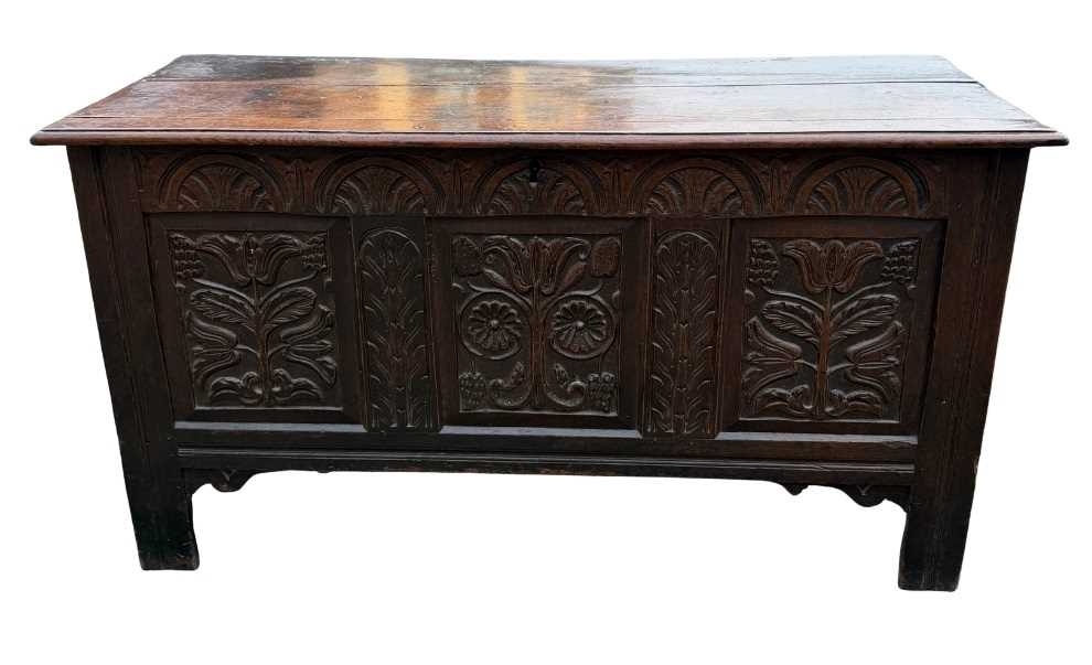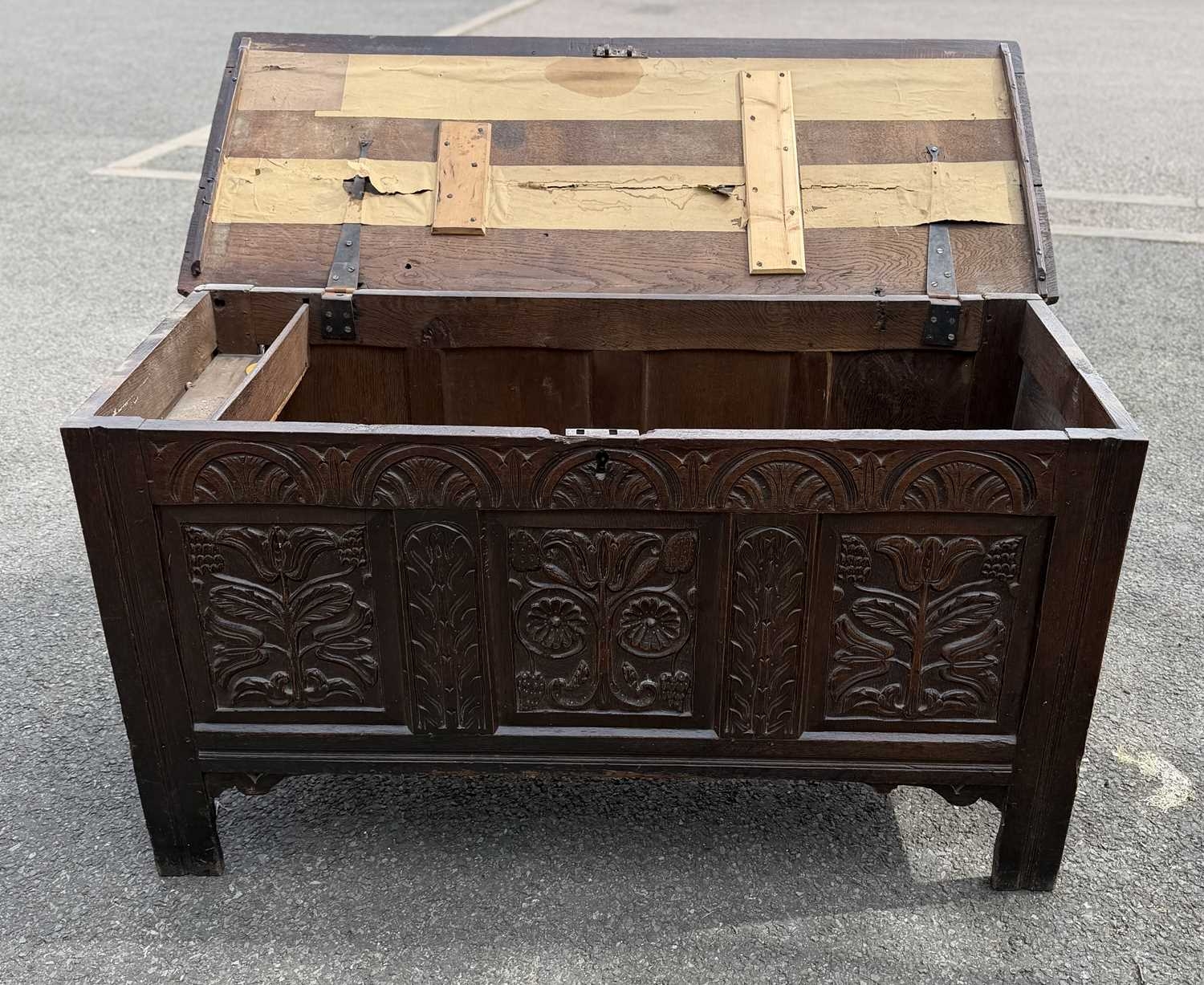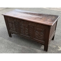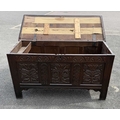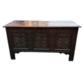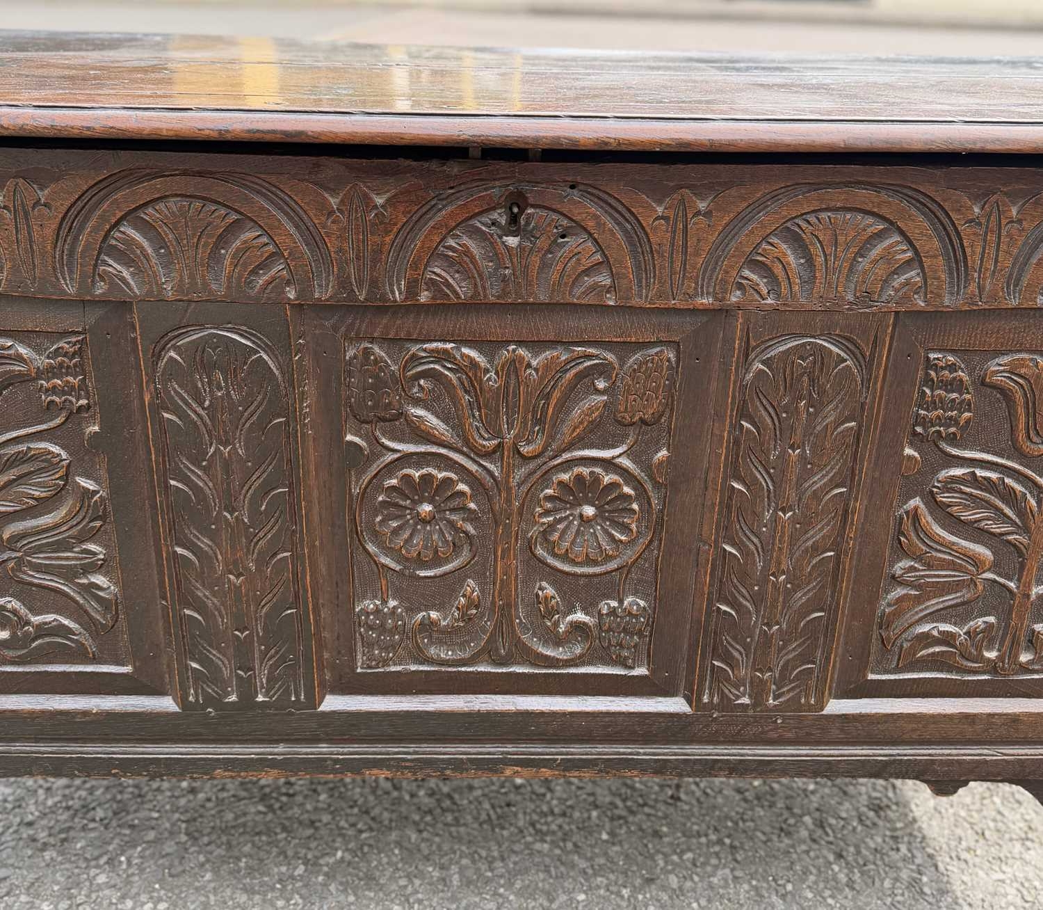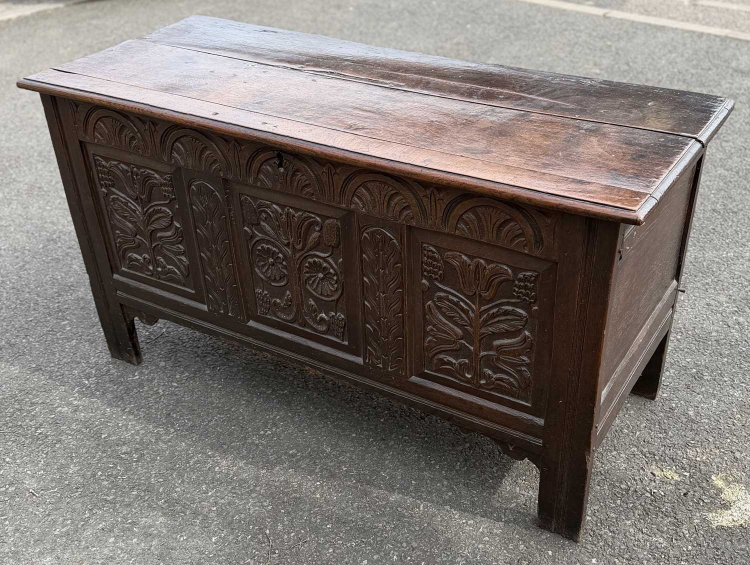 An 18th century panelled, oak coffer or chest with floral and foliate carvings to the three front panels, and geometric motifs to the top front rail, the three plank moulded top its above four molded stiles there are four panels to the back and one to each side, approx height 74cm, width 126cm, depth 55cm (1)