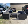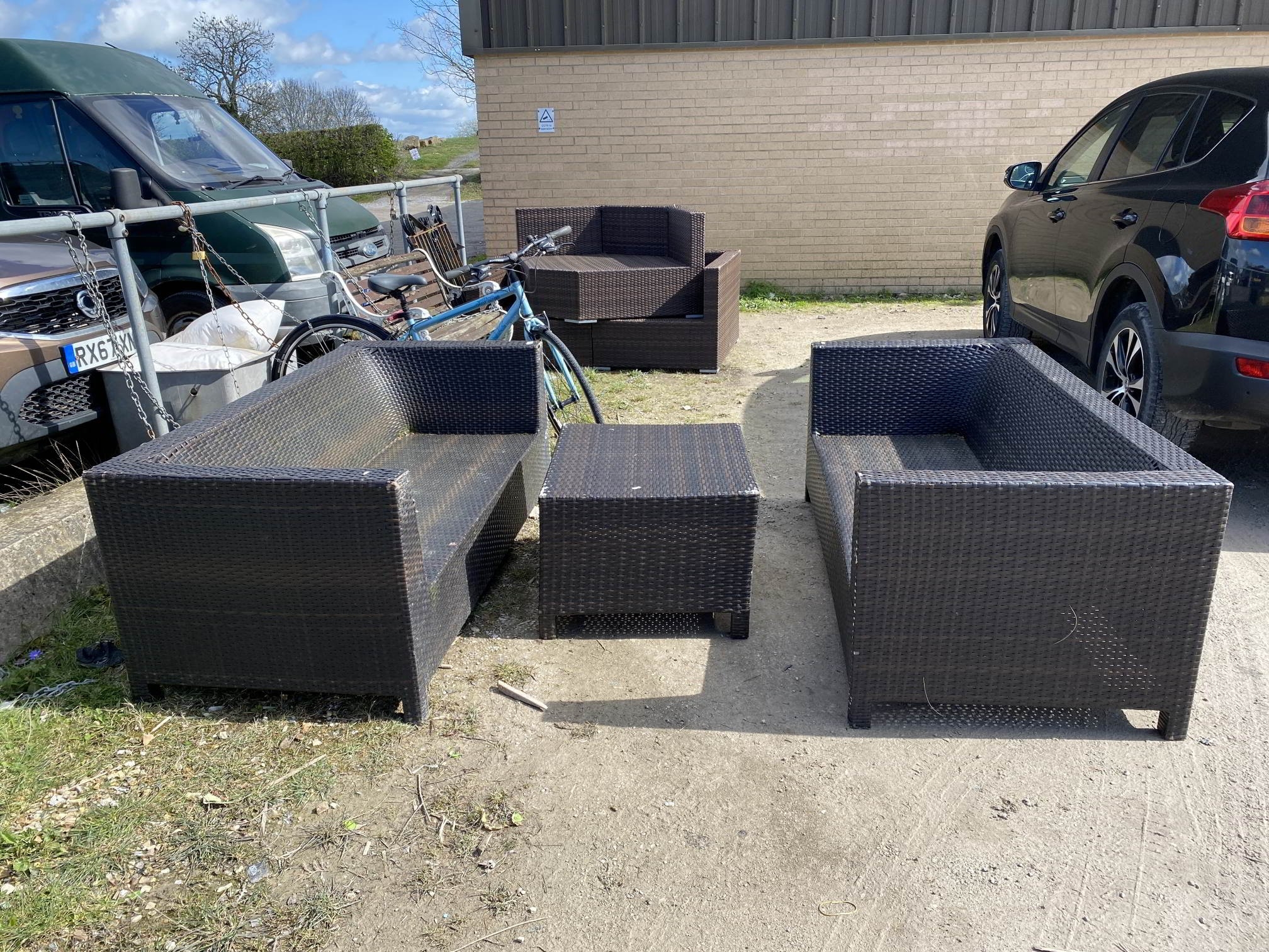 2 brown rattan garden settees 66H 166W 79D & a matching occasional table 46H 64W 74D