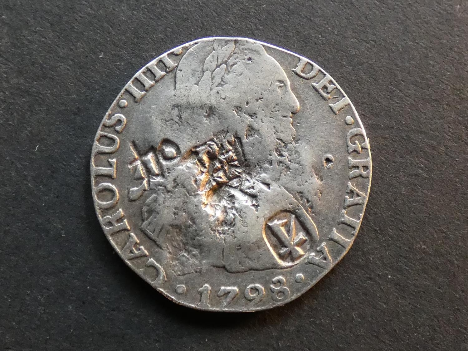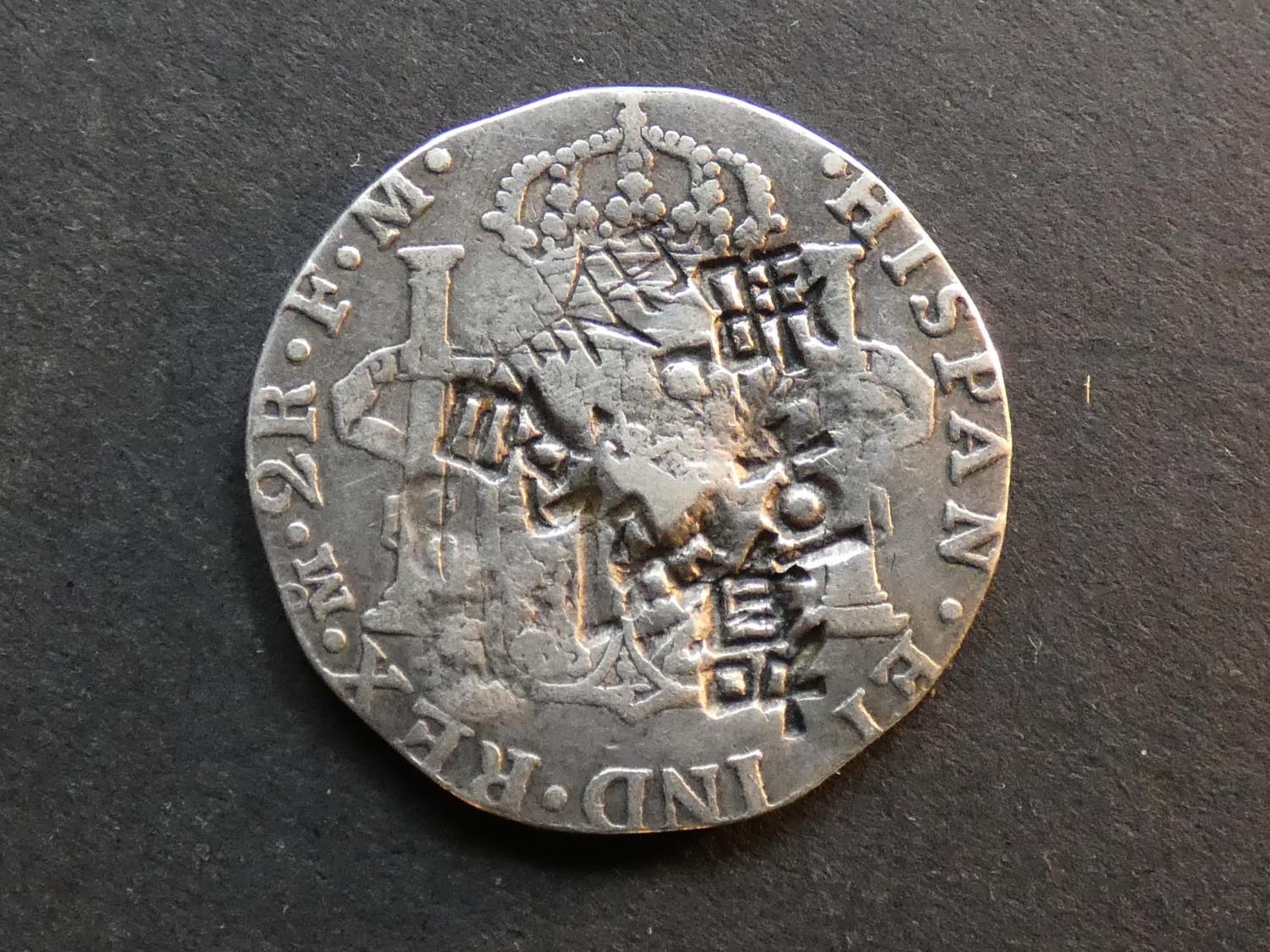 CHINA. Mexico, 2 Reales, 1798 Mo-F.M., KM91, slightly clipped to 5.3g from 6.77g, one large relief chop-mark on obverse, character “cái” (“only”, or “really”, also “gift”), as well as several large incuse chops, both sides, host coin VG