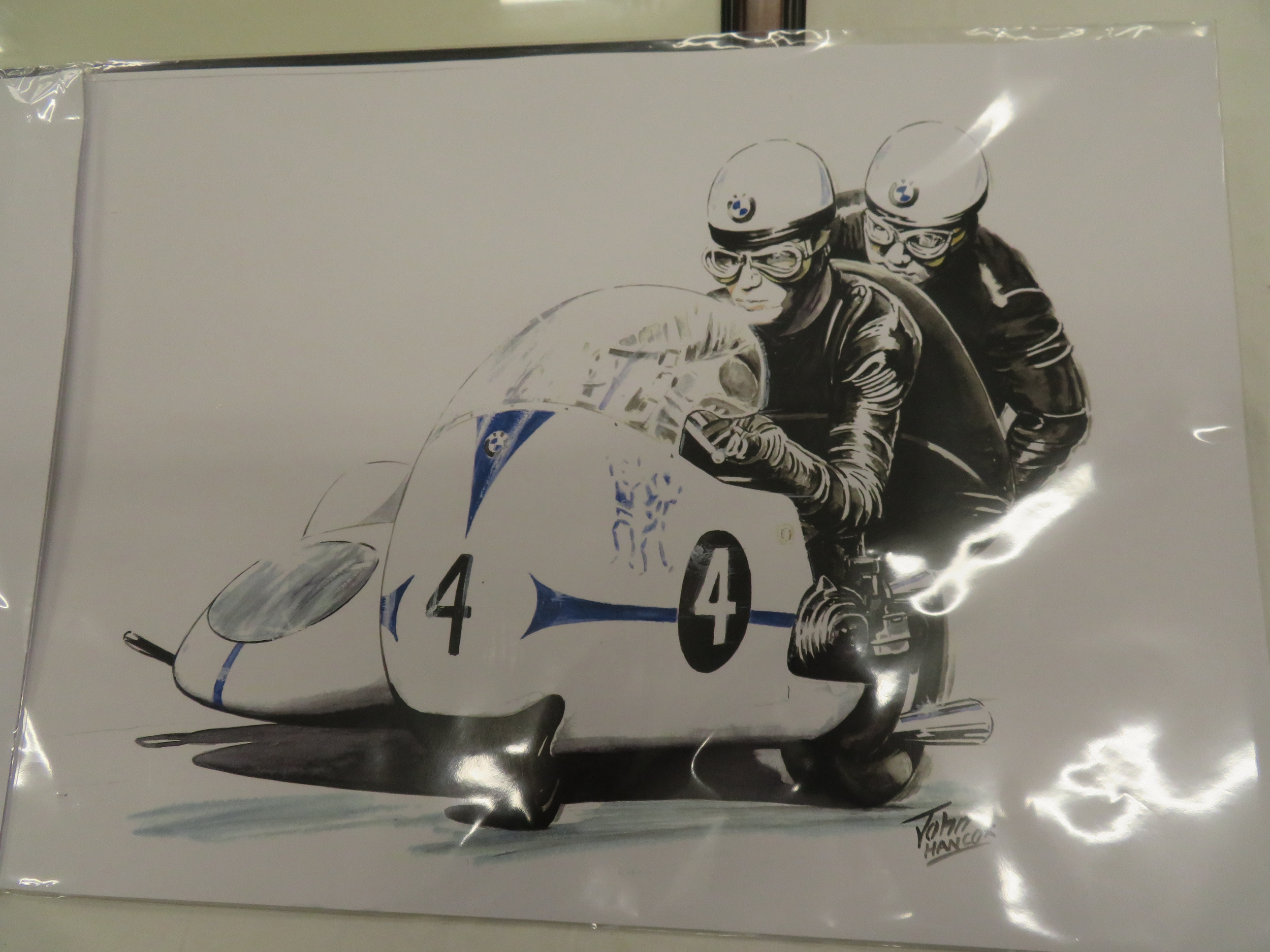 90th Anniversary of The Isle of Man Tourist Trophy illustrated by D.N.Sykes (signed in pencil) plus two John Hancox prints