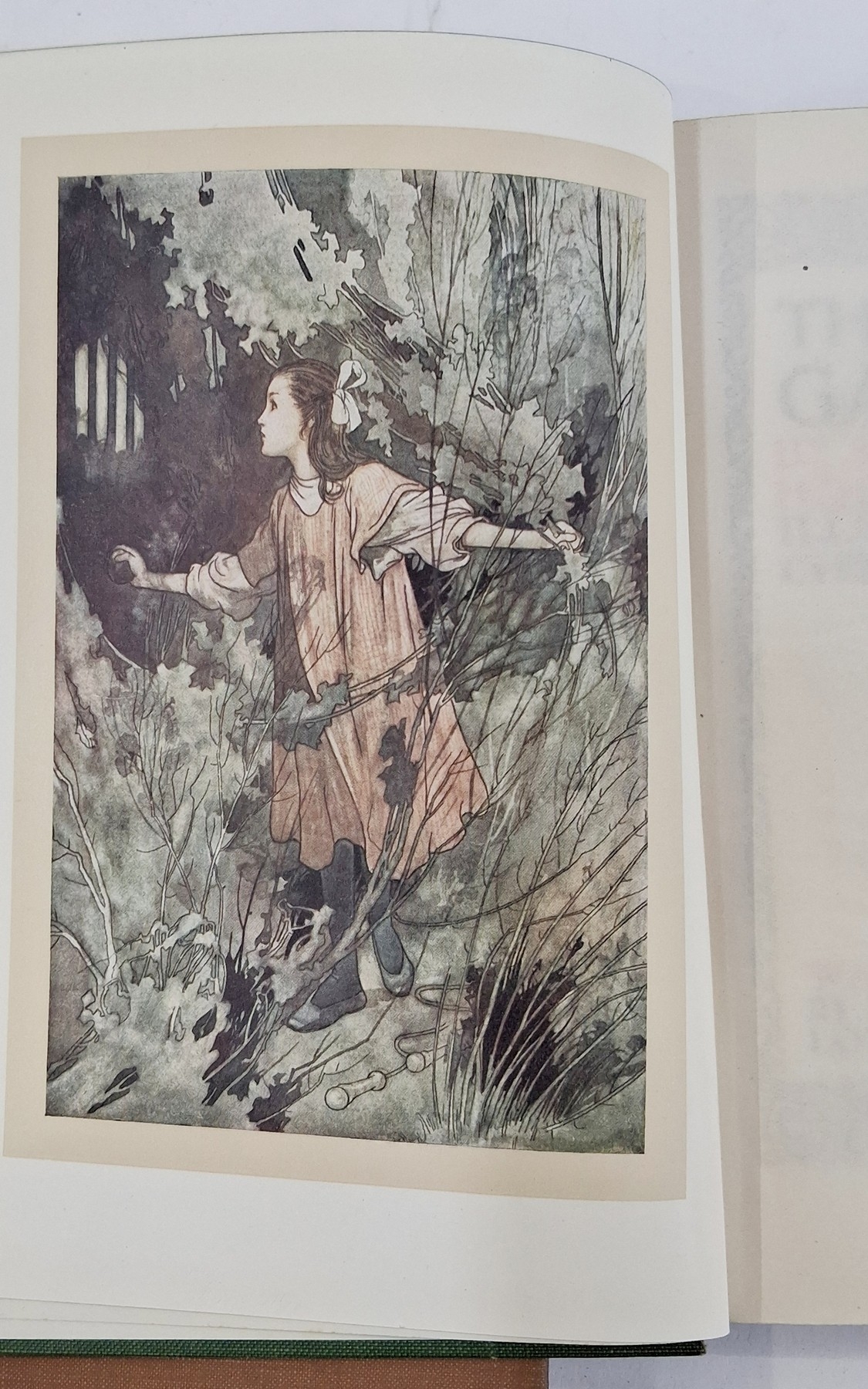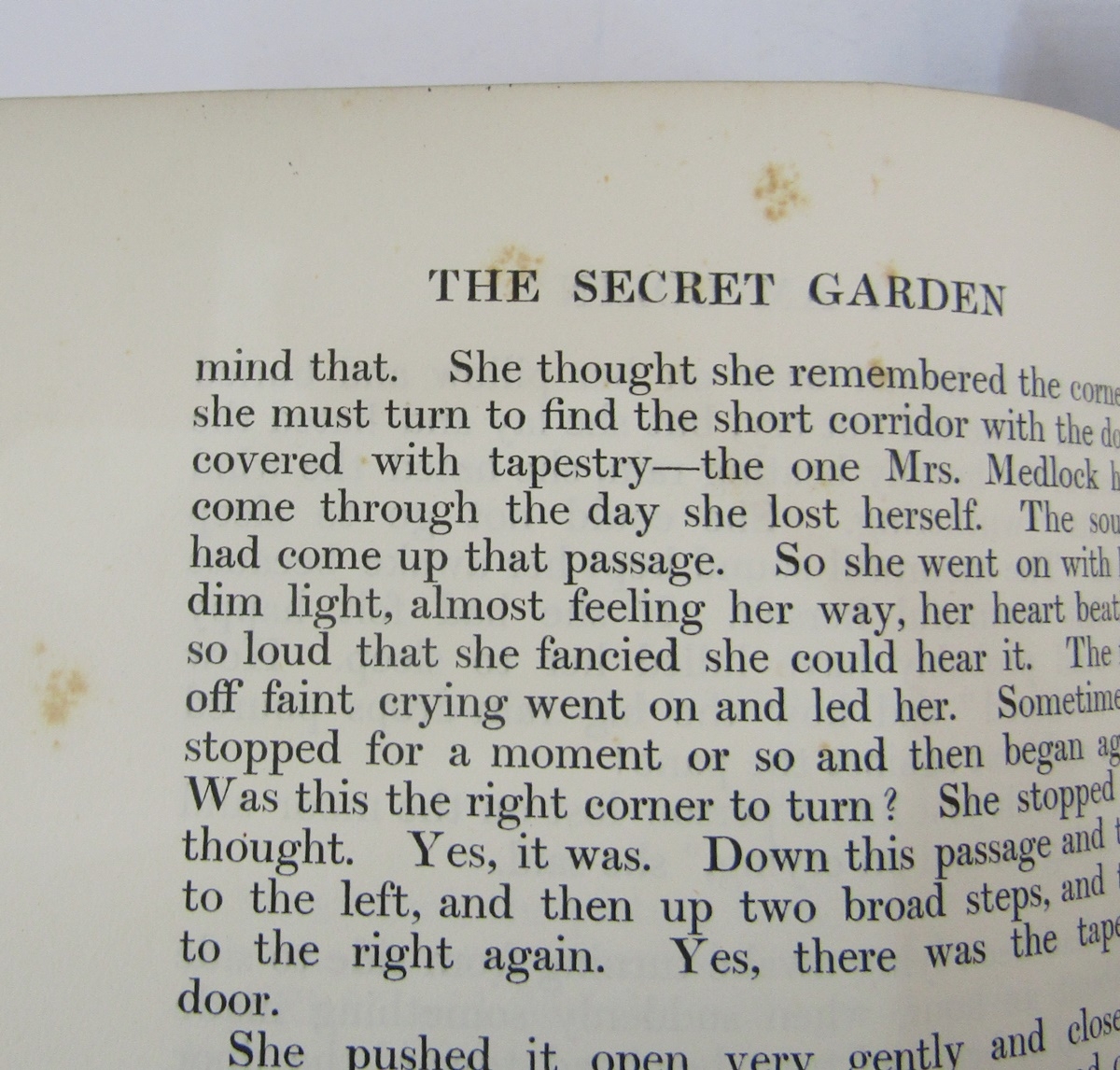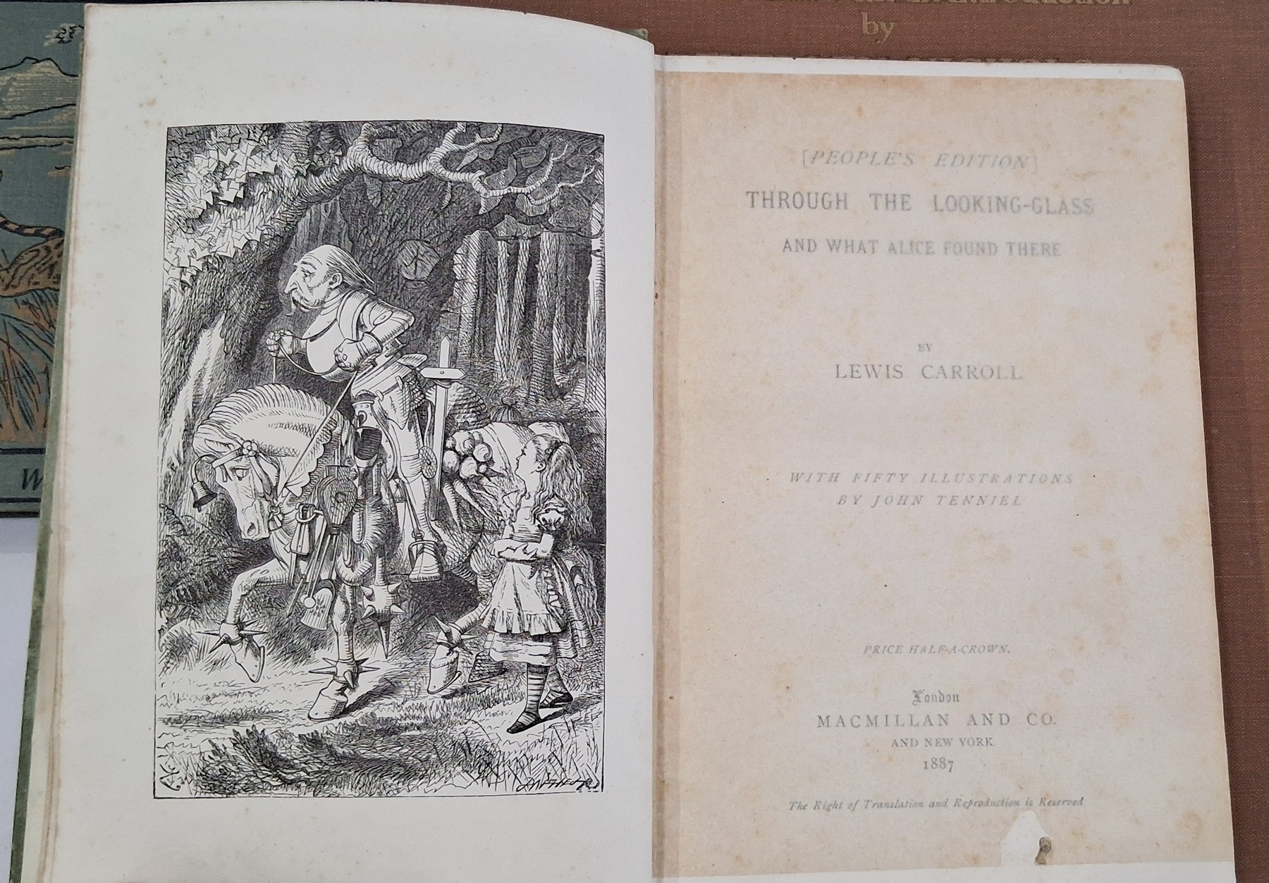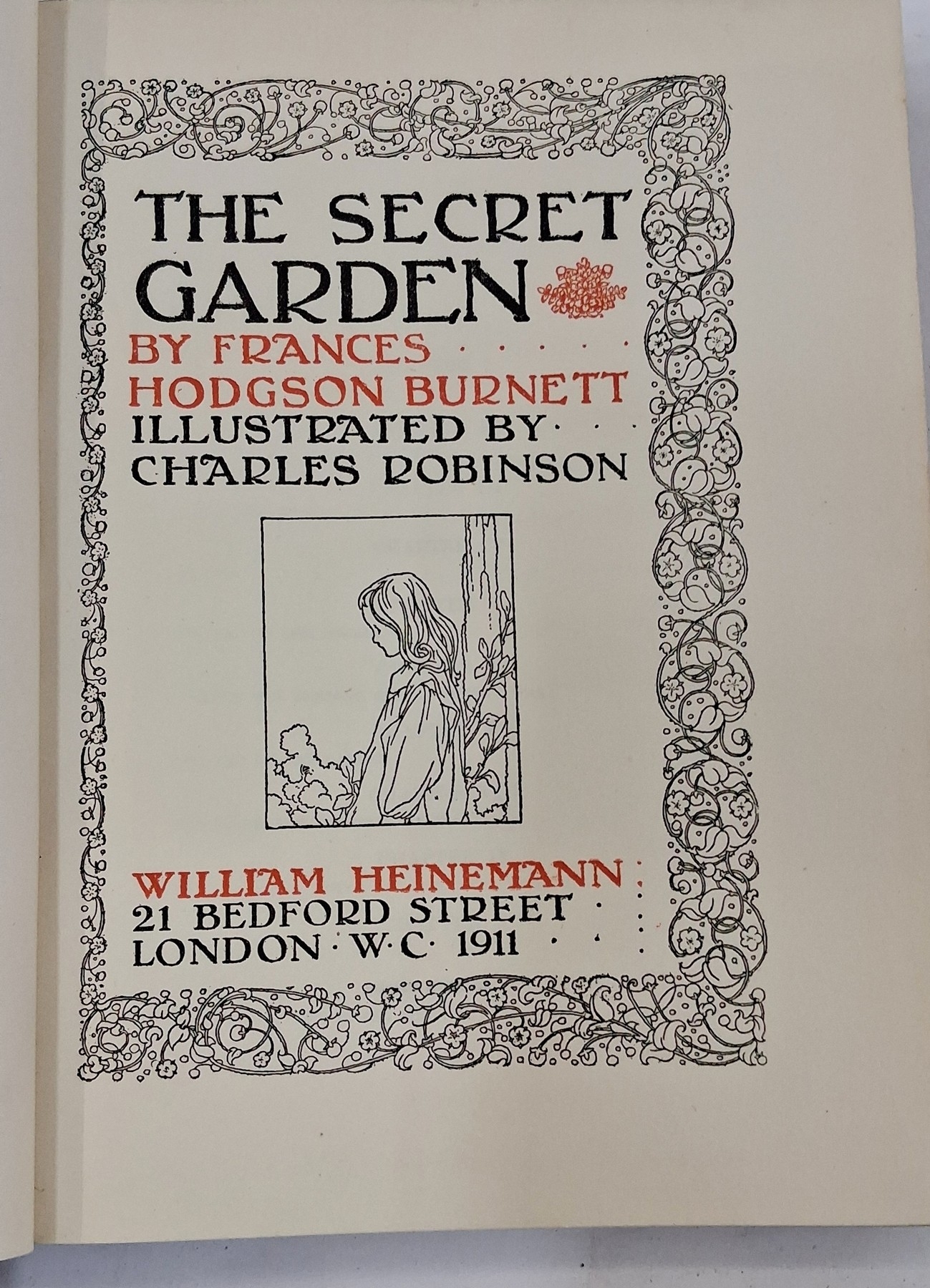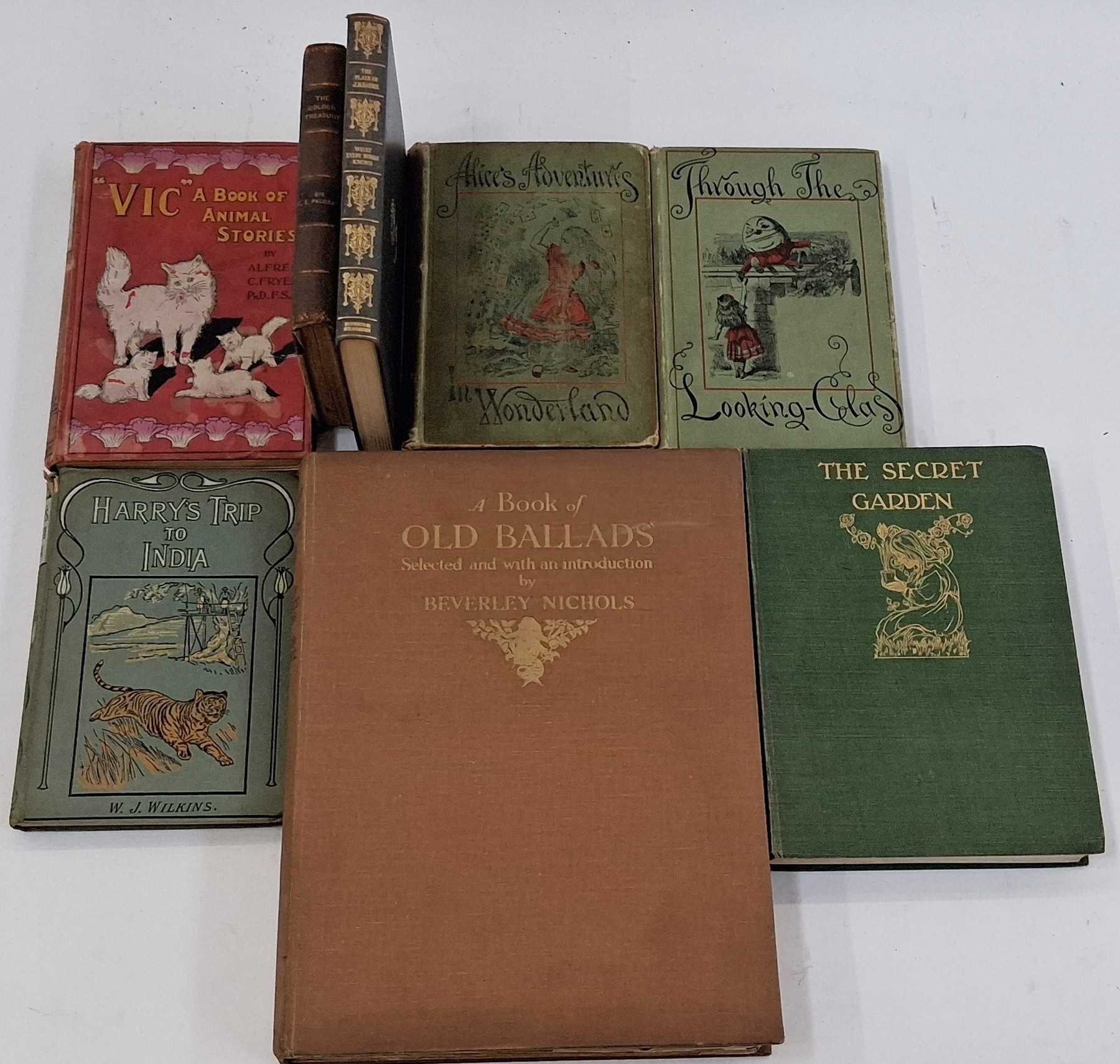 Childrens books - Carrol, Lewis "Alice's Adventures in Wonderland", illustrations by John Tenniel, 40th thousand, Macmillan & Co 1894, ffep missing, pictorial cloth very worn, "Through the Looking Glass and What Alice Found There", illustrations by John Tenniel, Macmillan & Co 1887, illustrations, inked name and date 1888 to ffep, original publishers pictorial cloth, Robinson, Charles (ills), Hodgson, Burnett, Francis "The Secret Garden", William Heinemann 1911, colour frontis with lettered tissue guard, coloured plates with lettered tissue guards, green pictorial cloth, gilt titles, Wilkins, W J "Harry's Trip to India", The Religious Tract Society, illustrations, pictorial cloth, Fryer, Alfred C "Vic - A Book of Animal Stories", inked name on ffep board and ep detaching, red pictorial cloth, Barrie, J M "What Every Woman Knows", Hodder & Stoughton 1930, full blue leather with gilt initials to front board on gilt titles, Palgrave, Francis Turner "The Golden Treasury", T Nelson & Sons and Brock, H M (ills), Nicholls, Beverley "A Book of Old Ballads", Hutchinson & Co 1934, small folio, colour frontis, colour plates, deckle edges, pictorial ep, brown cloth, some shelfwear (8)