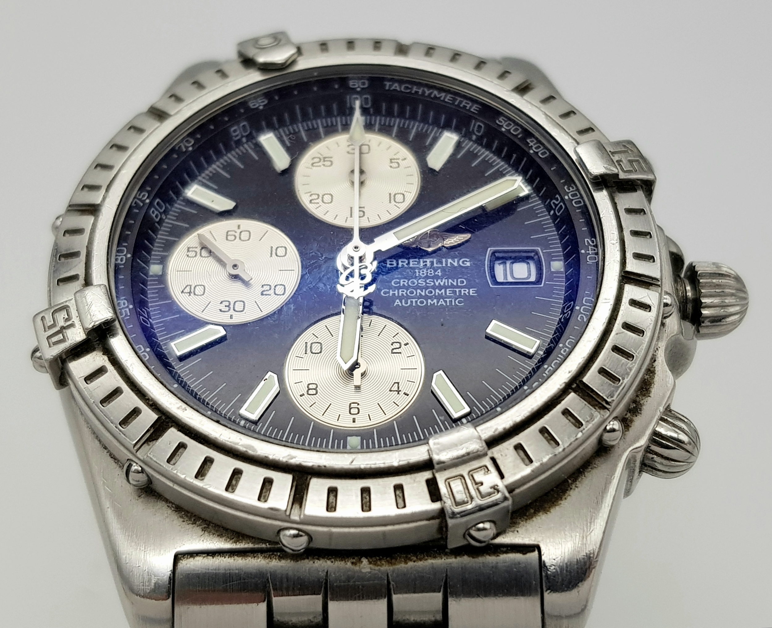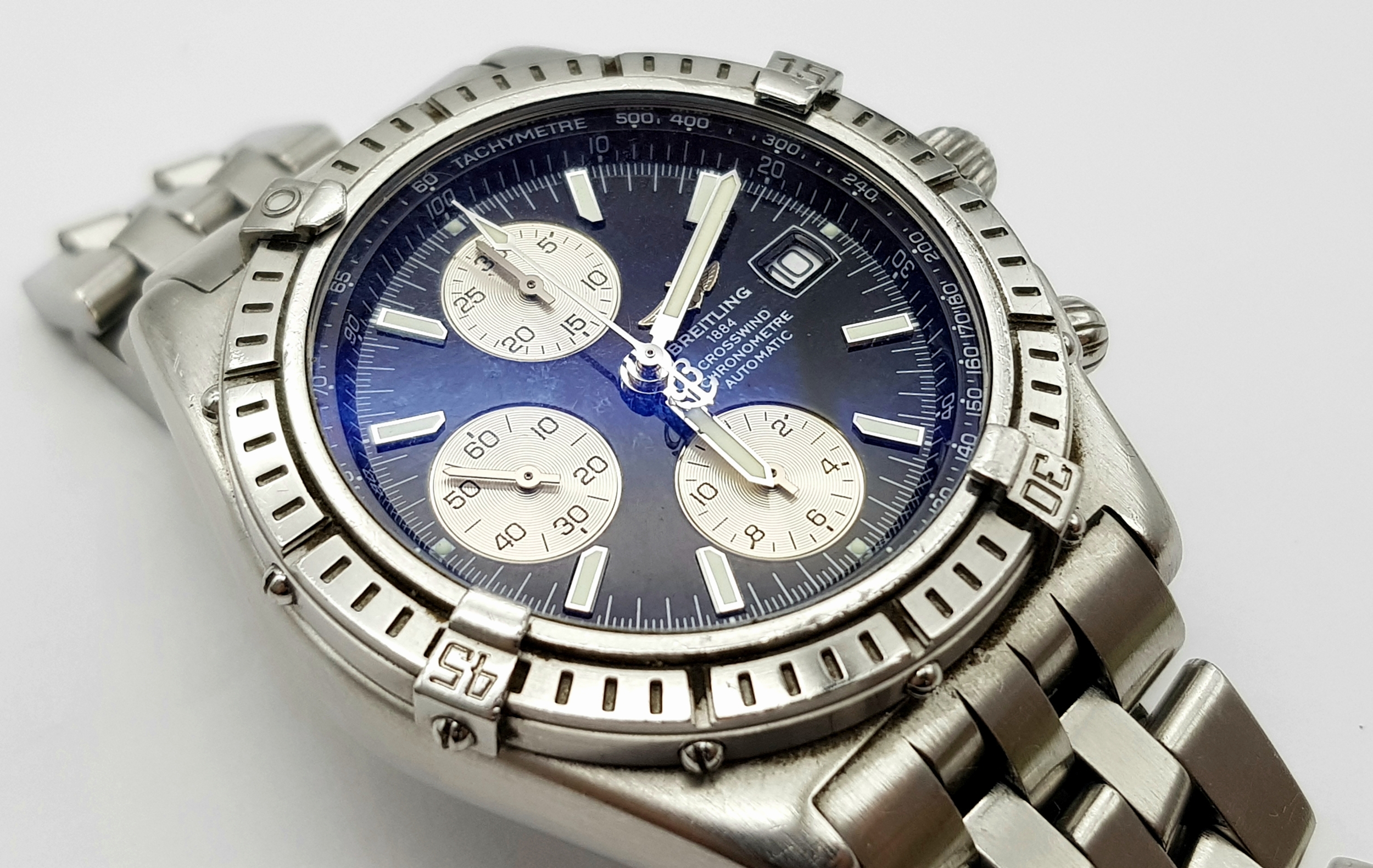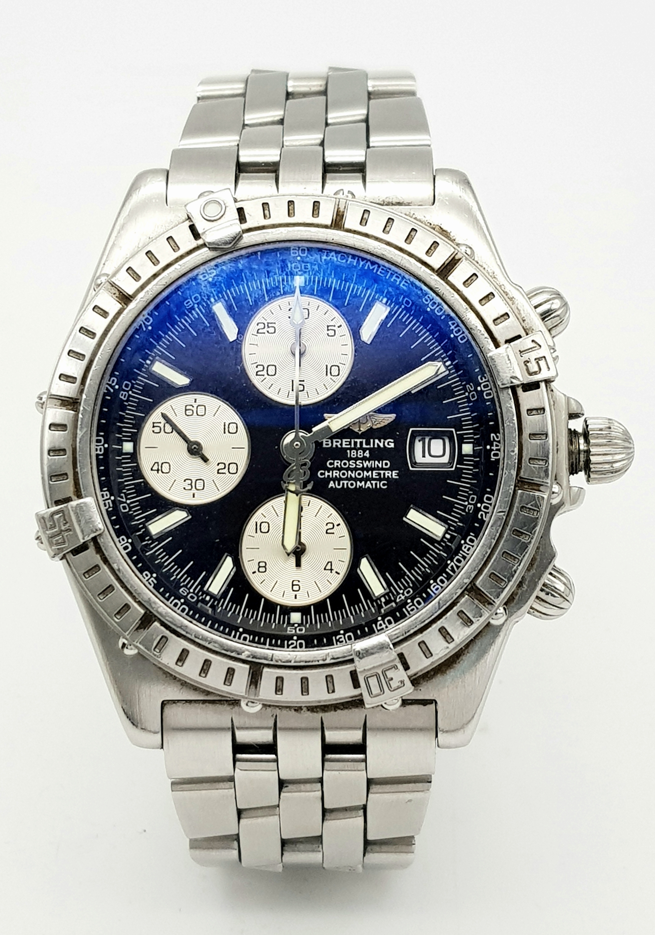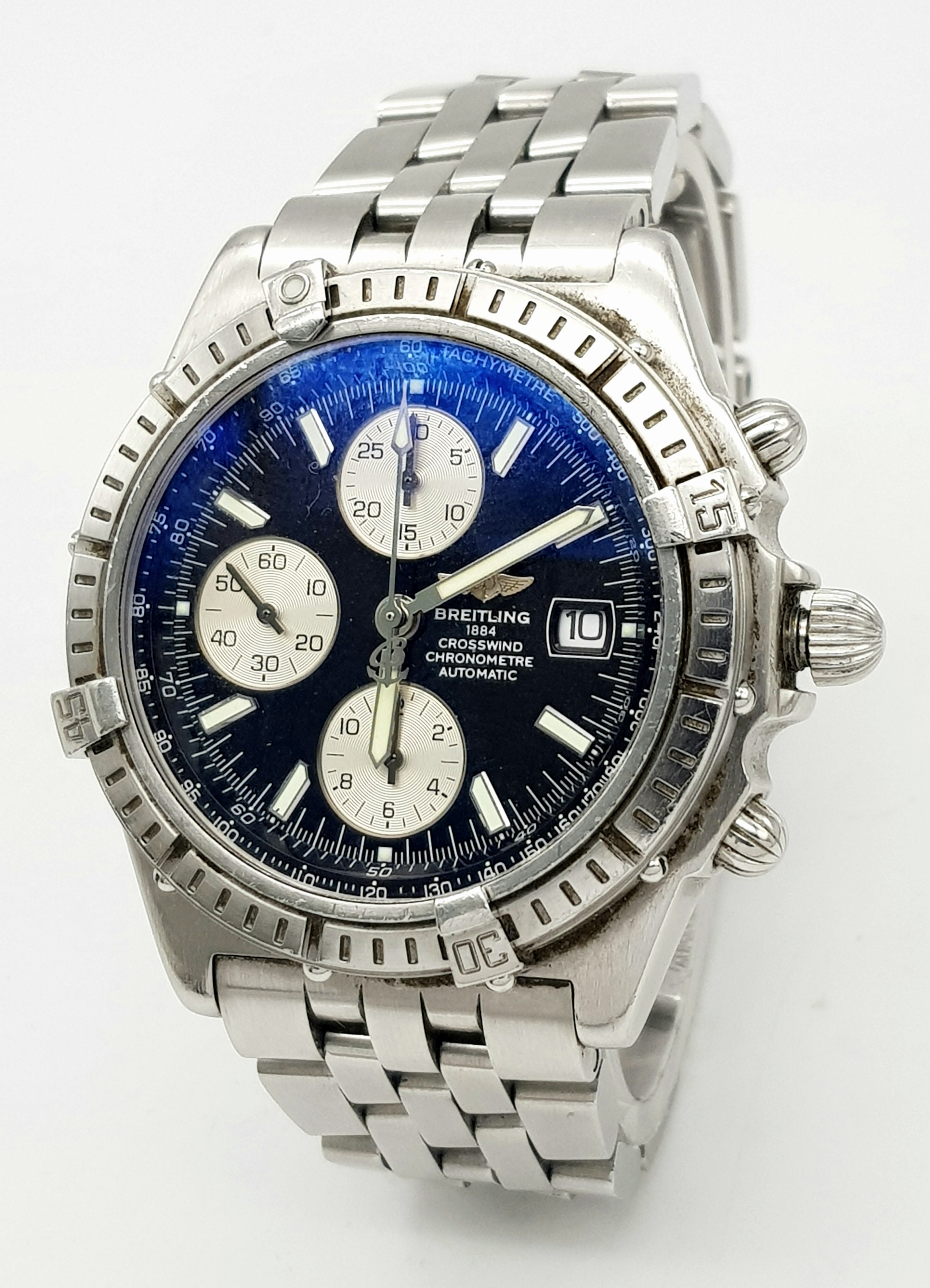A BREITLING 1884 CROSSWIND CHRONOMETRE AUTOMATIC GENTS WATCH. MODEL A13355. STAINLESS STEEL BRACELET AND CASE - 44MM. BLACK DIAL WITH THREE SUB DIALS. IN FULL WORKING ORDER. PN-8054