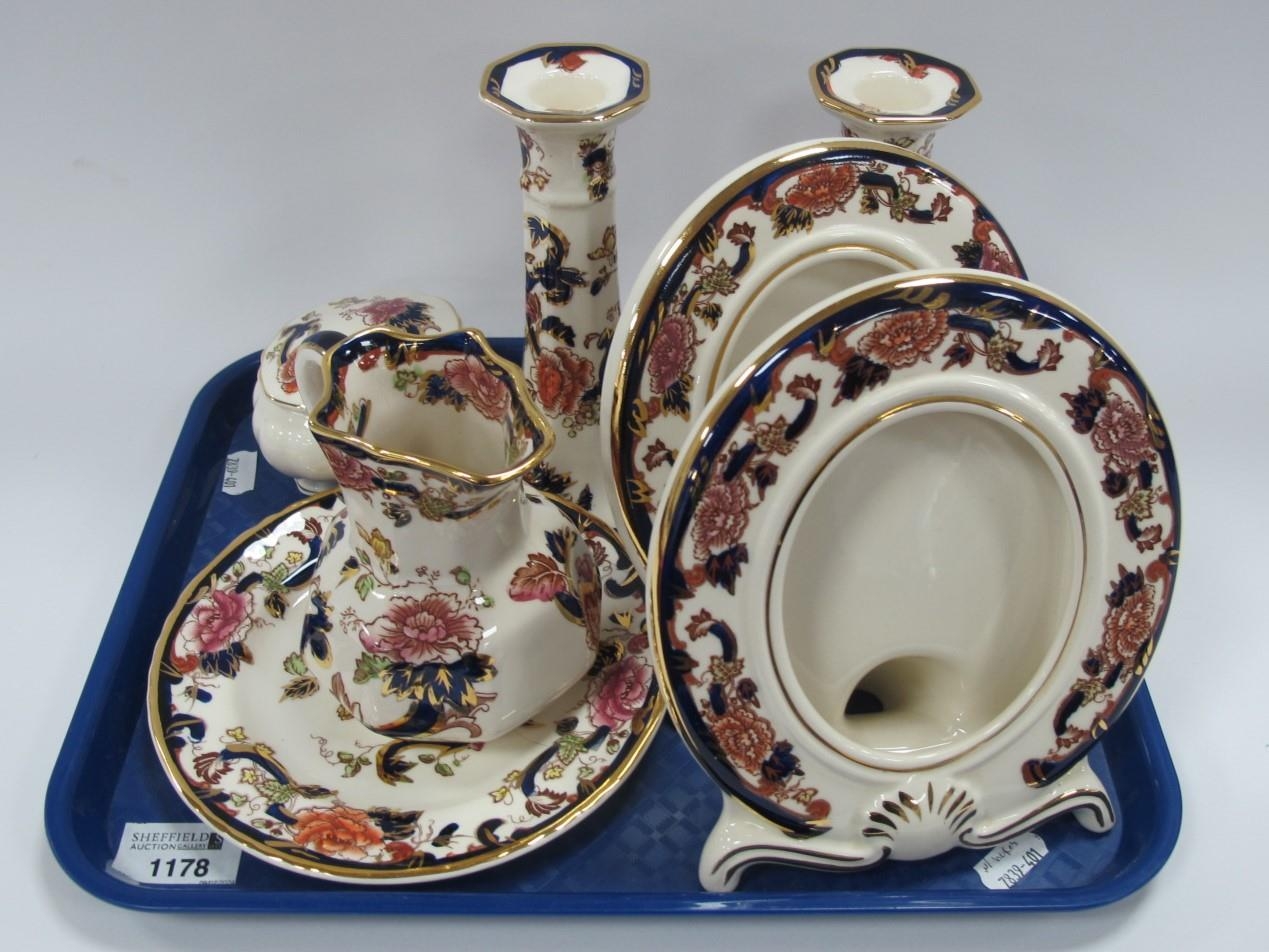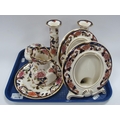 Masons Ironstone Mandalay pattern ceramics to include pair of candlesticks, photo frames, plate lidded pot and jug. 1 Tray