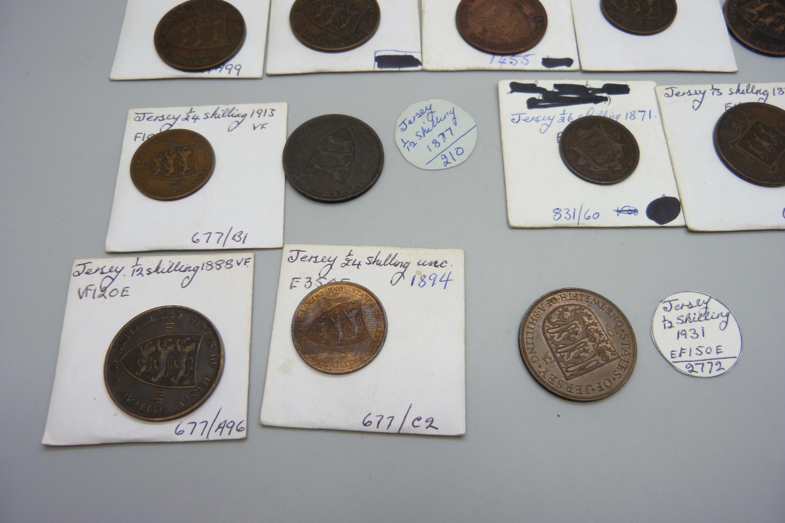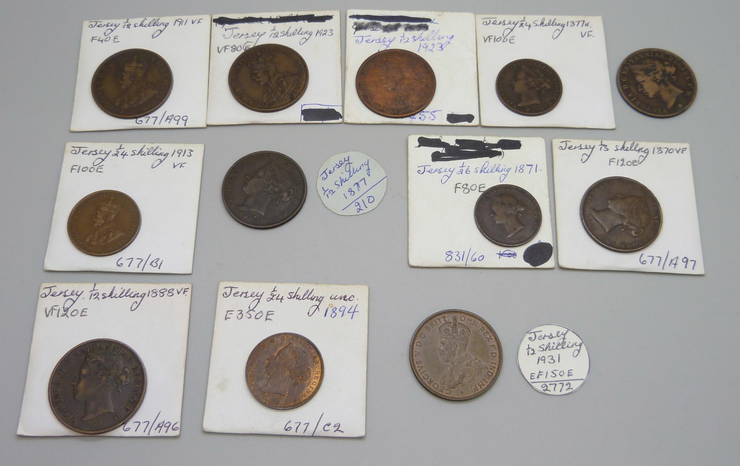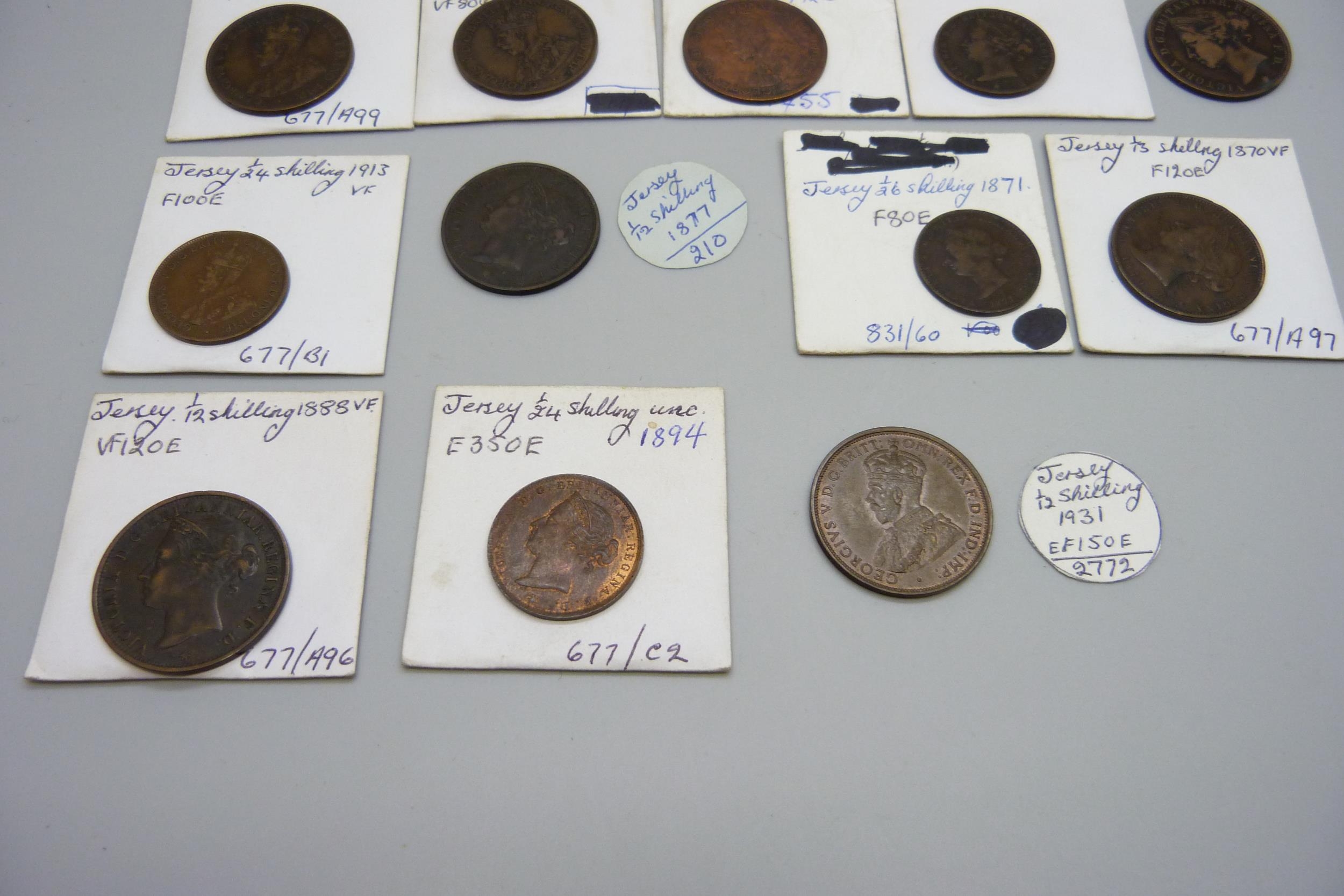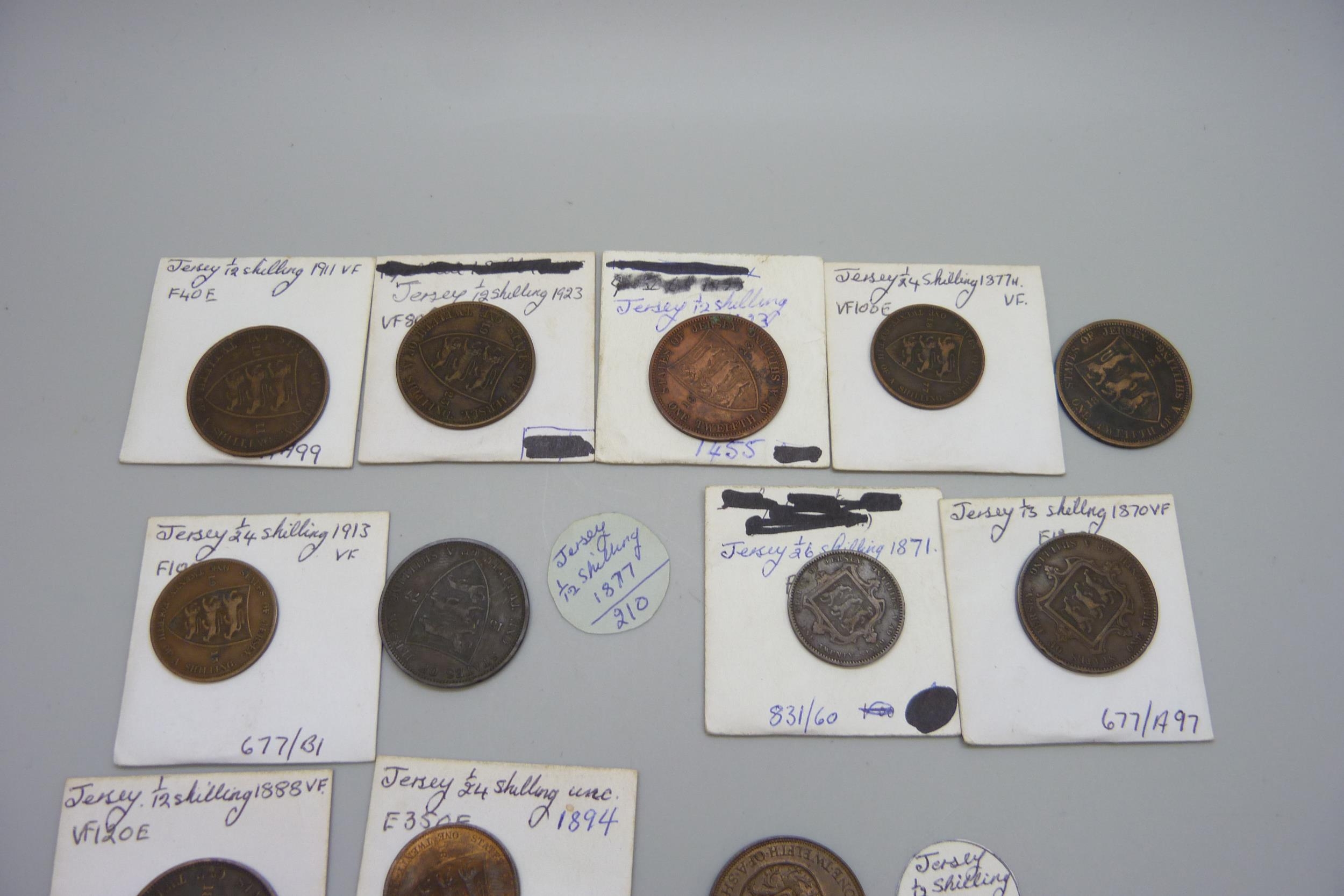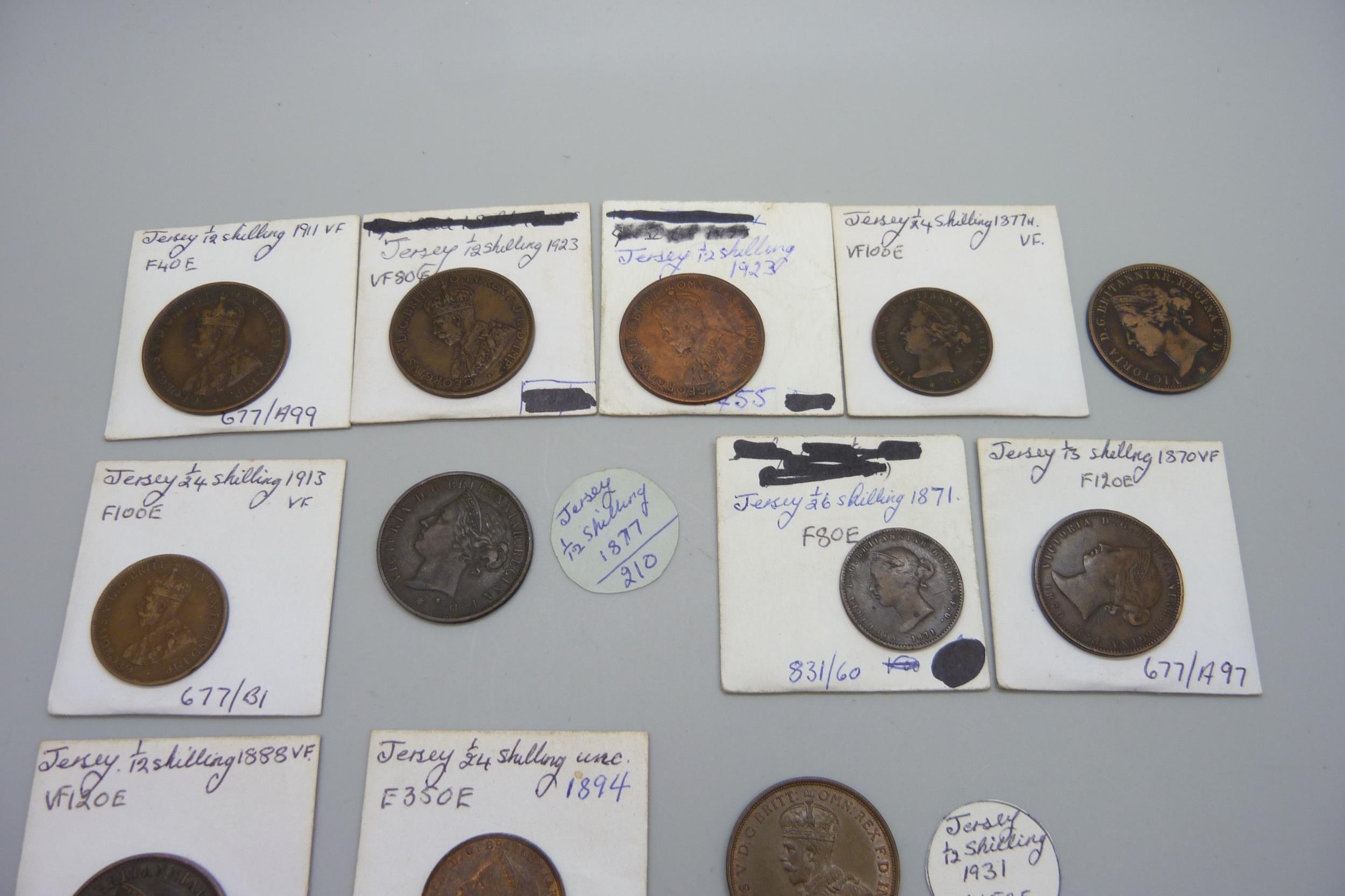 A collection of Jersey coins, 19th Century and early 20th century, 1/12th, 1/13th, 1/24th and 1/26th shillings