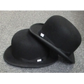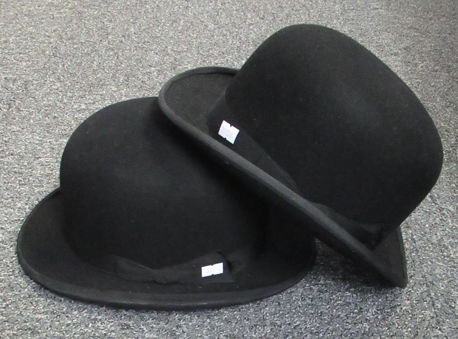 Two black bowler hats, one by Lincoln Bennett & Co. Hatters, Piccadilly, London, the other Unitas make, Liteware.