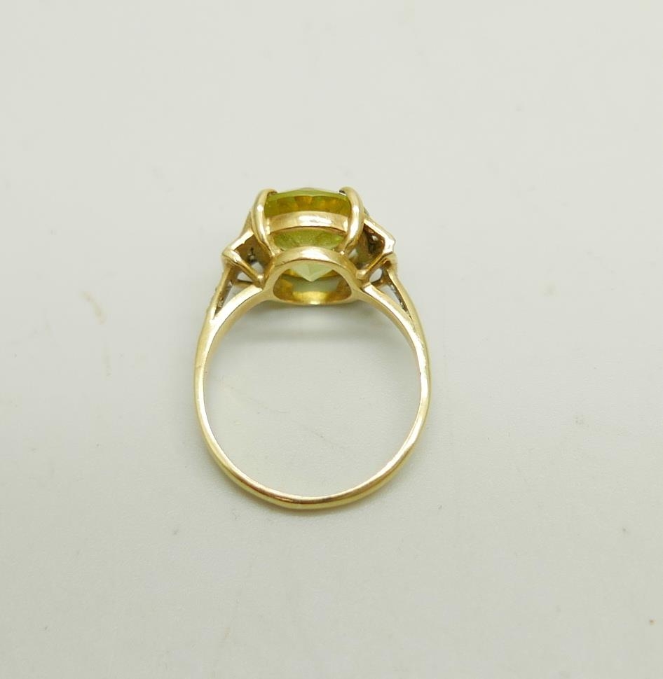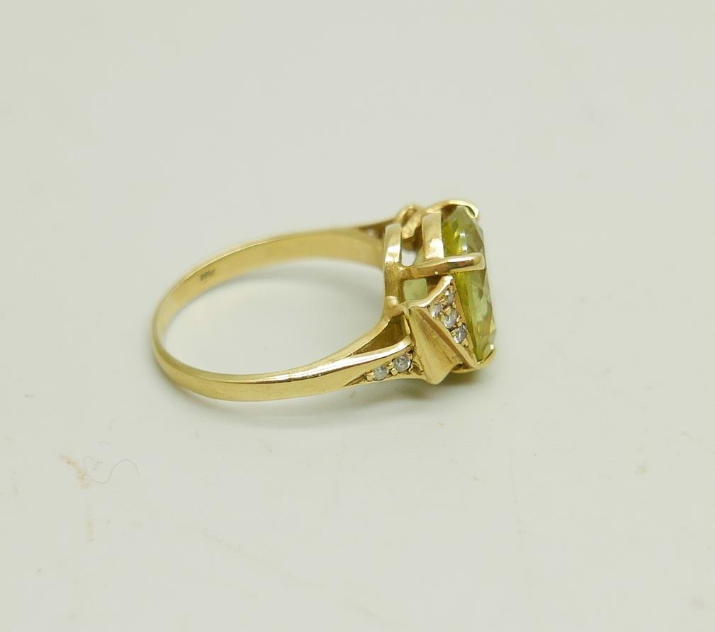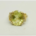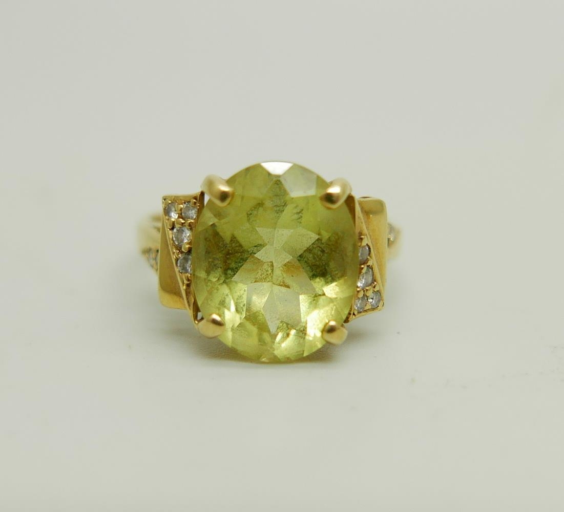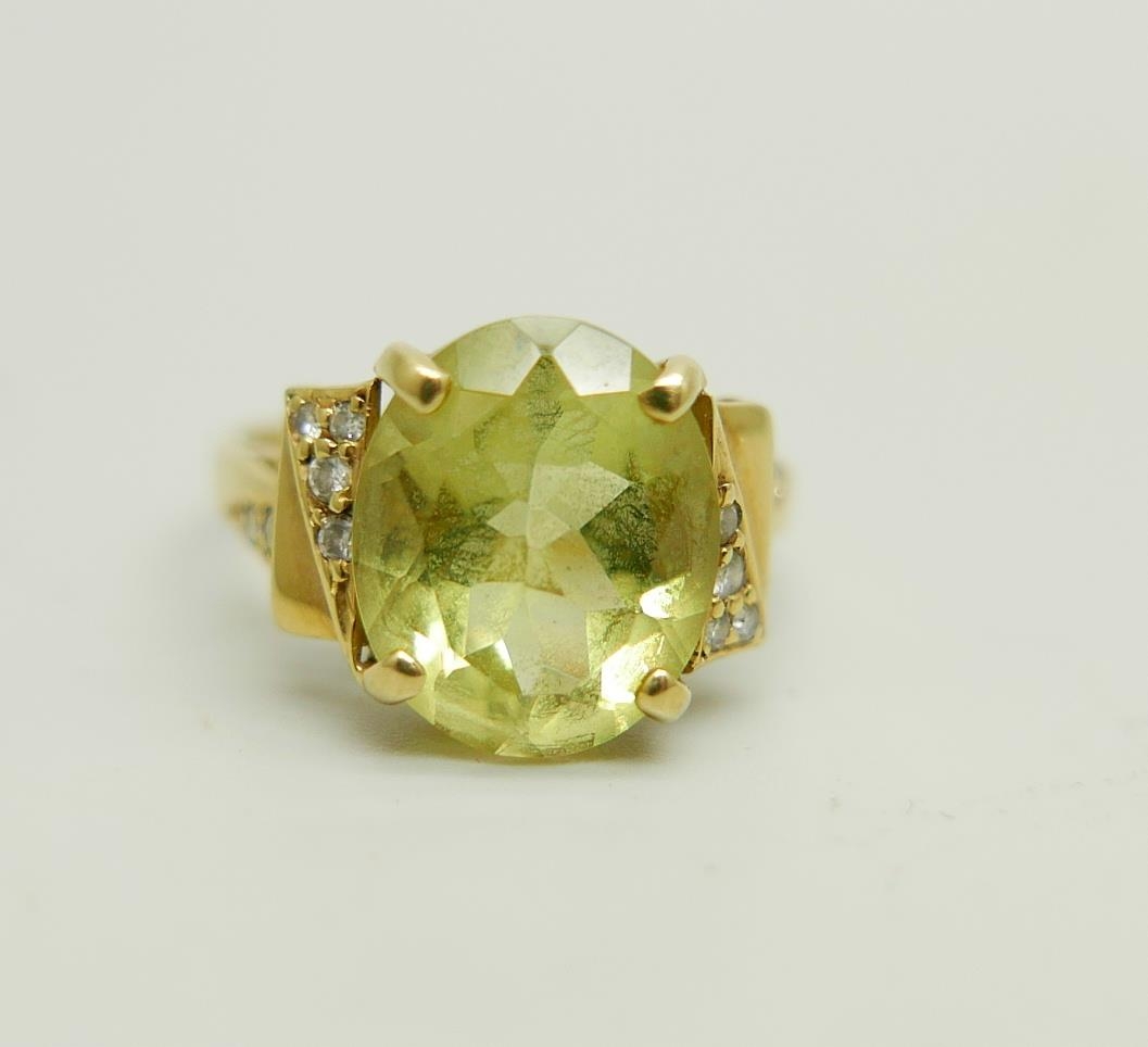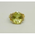An 18ct gold ring set with a green stone and diamonds, 4.4g, M