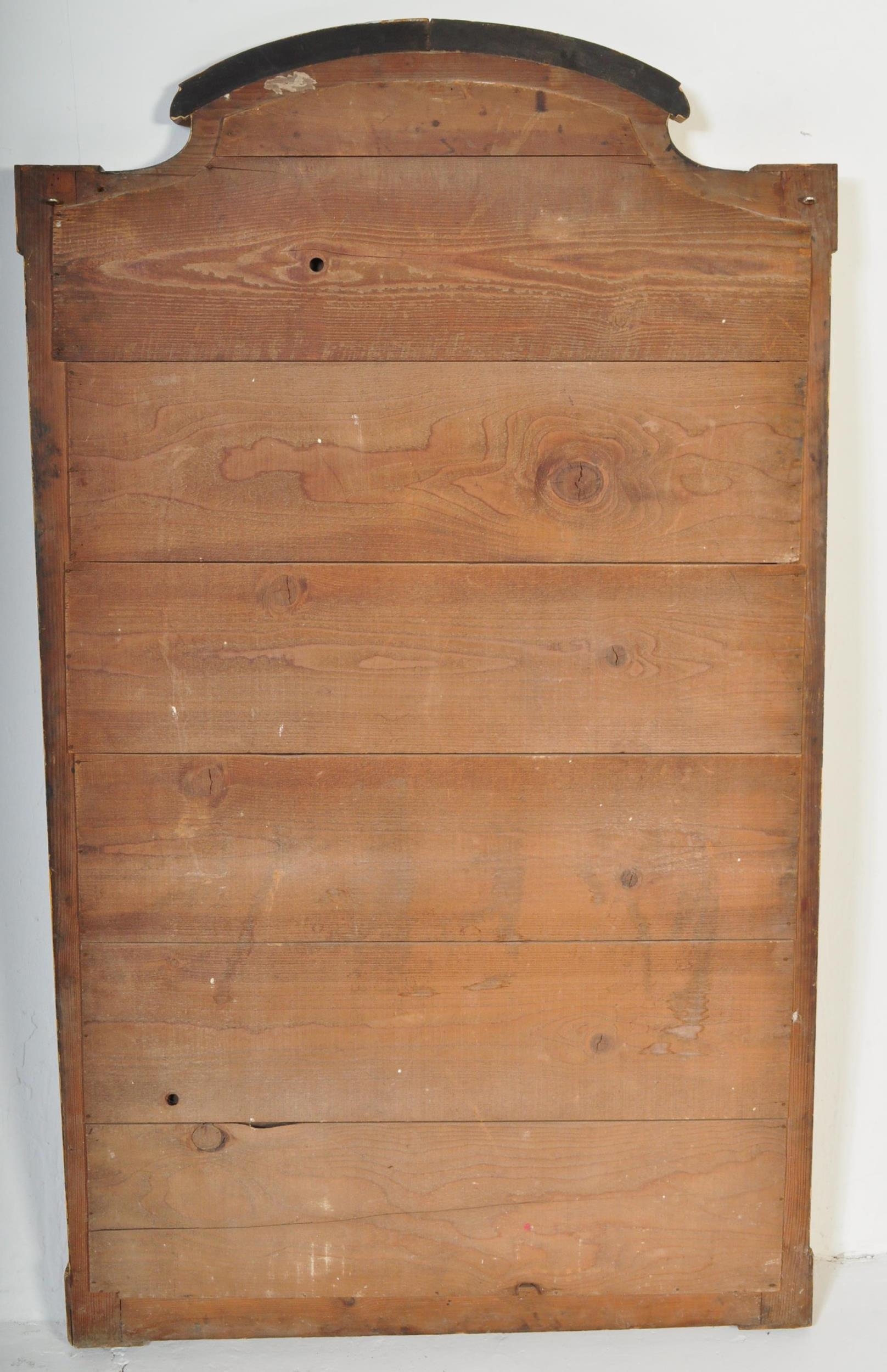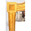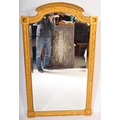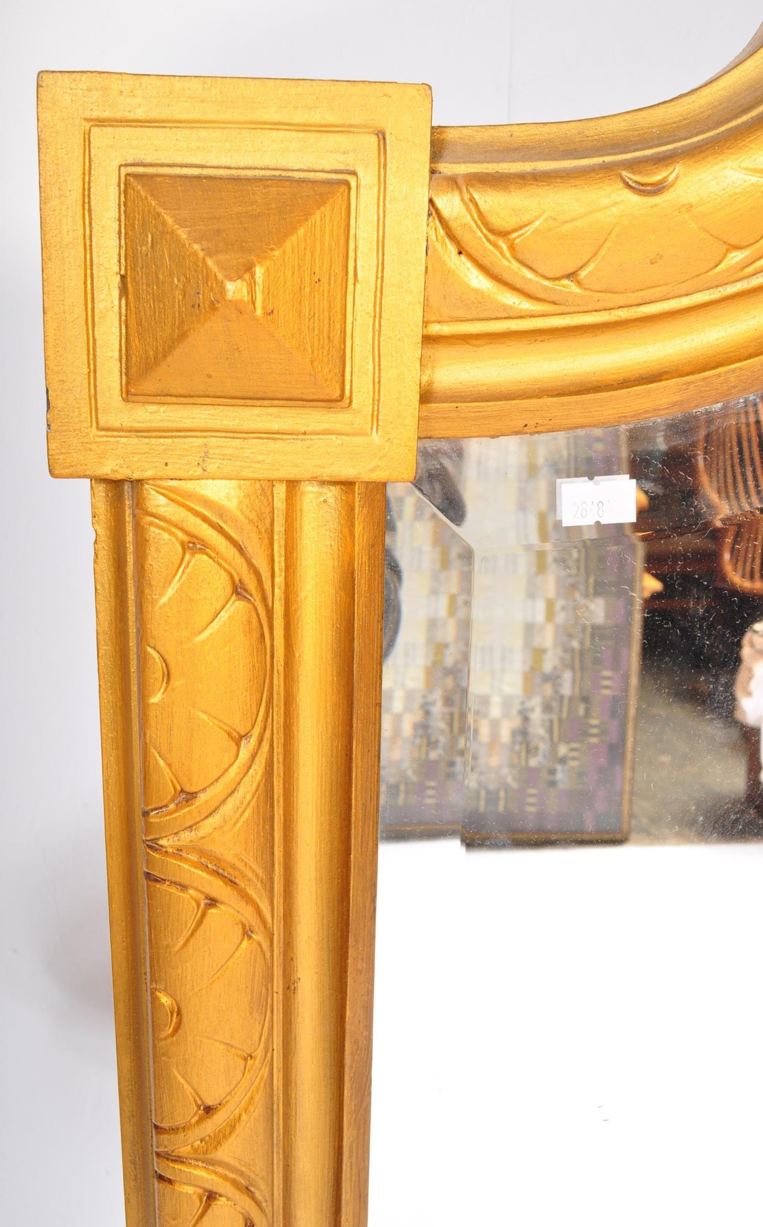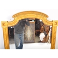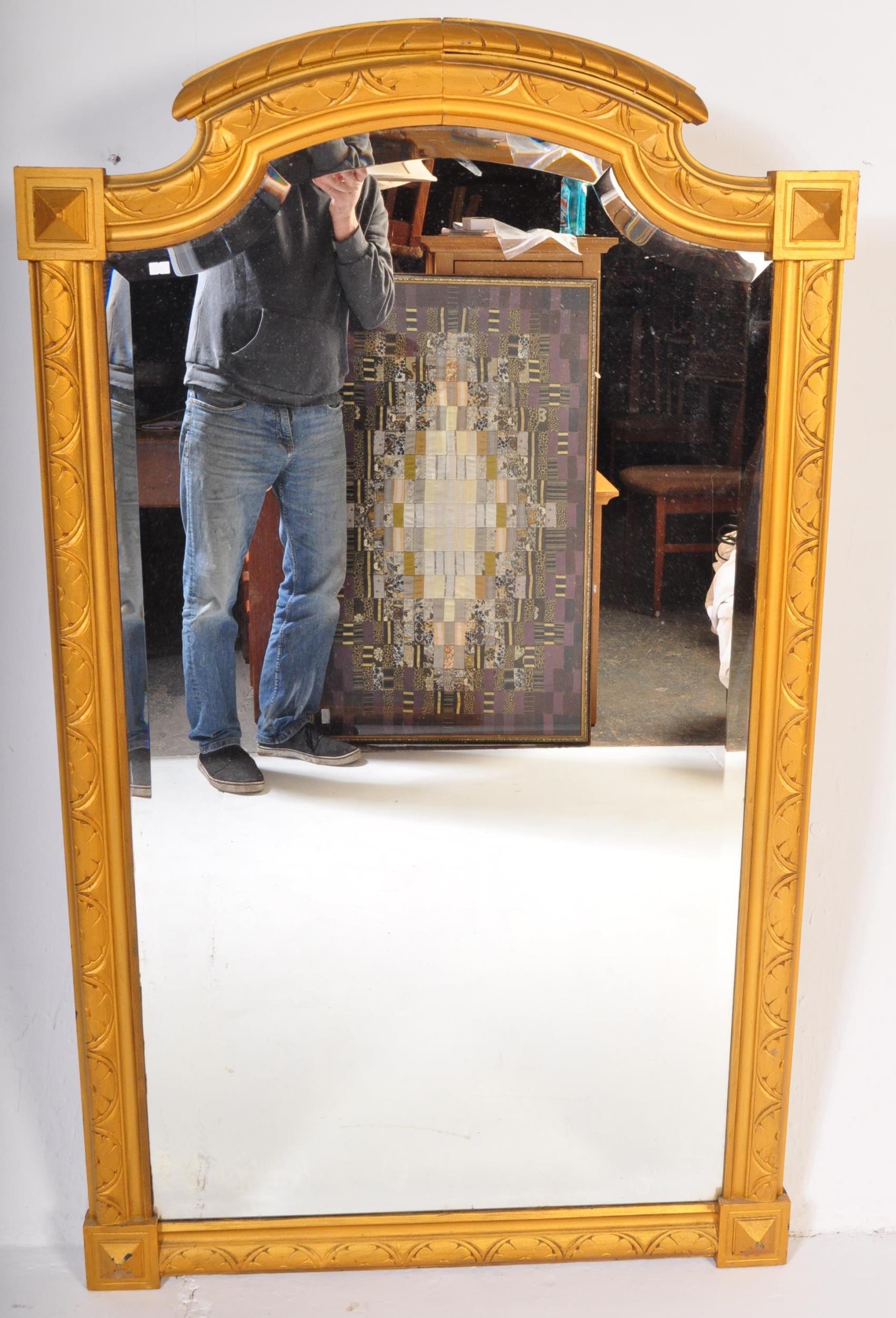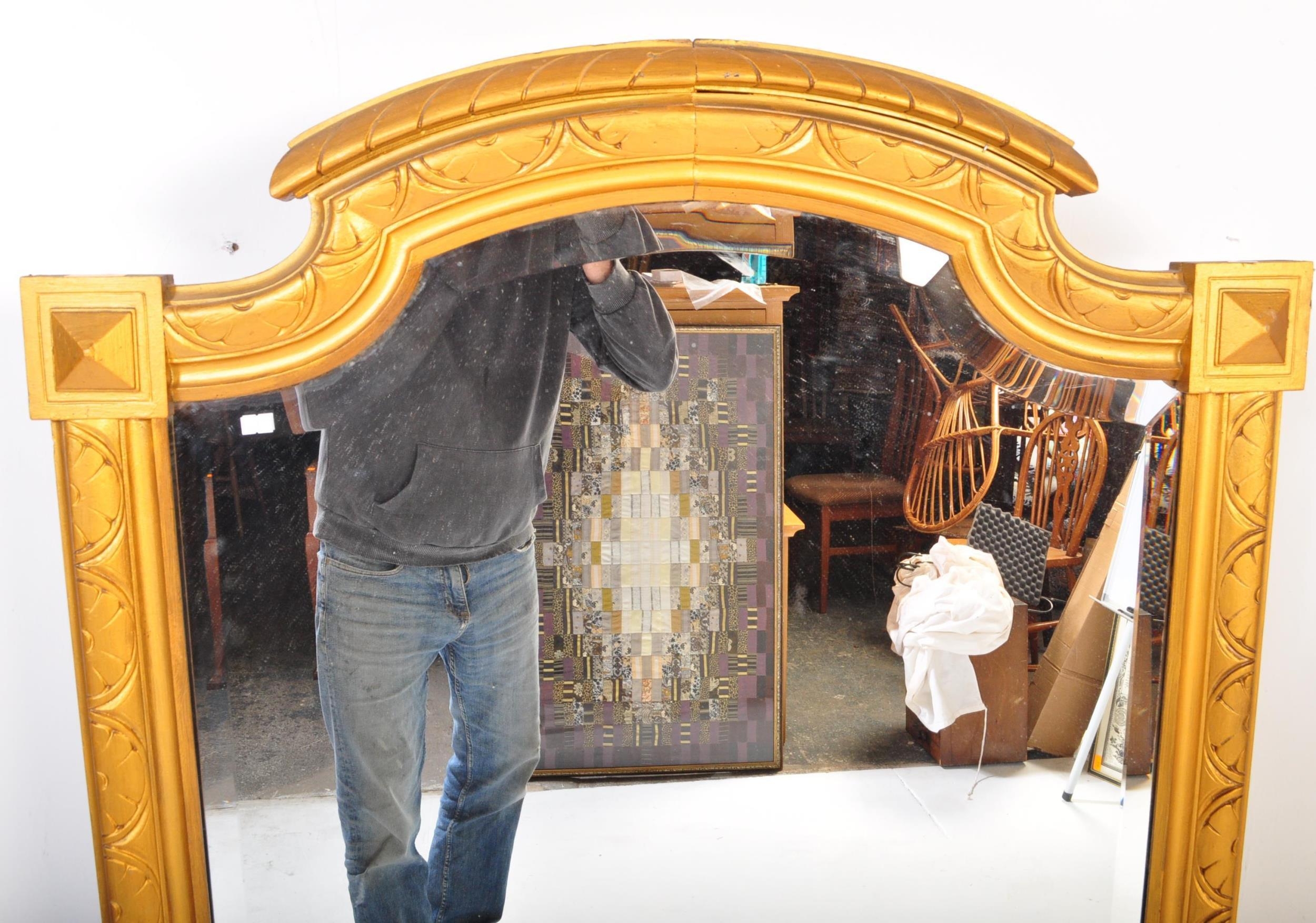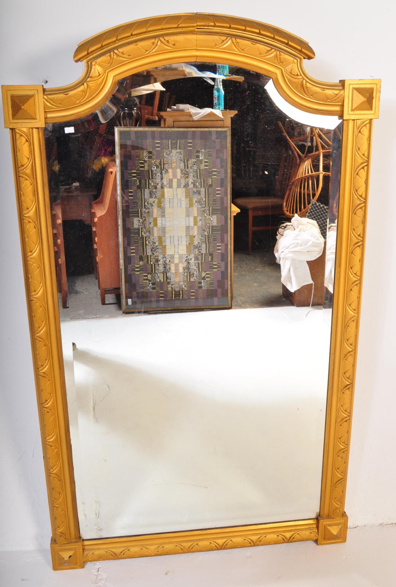 A large early 20th Century circa 1920s wooden gilt frame bevelled edge over mantel mirror. Having an arched top with carved decoration work to frame. Squared finial corners with geometric repeating pattern to sides. Bevelled edge mirror. Measures approx. 156cm x 92cm. Mirror slightly loose in frame.