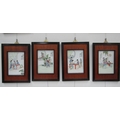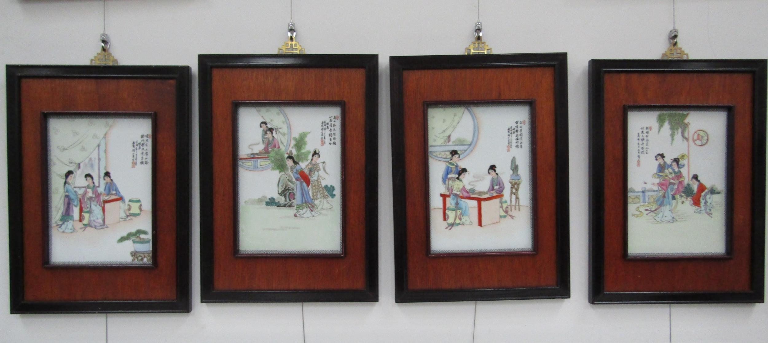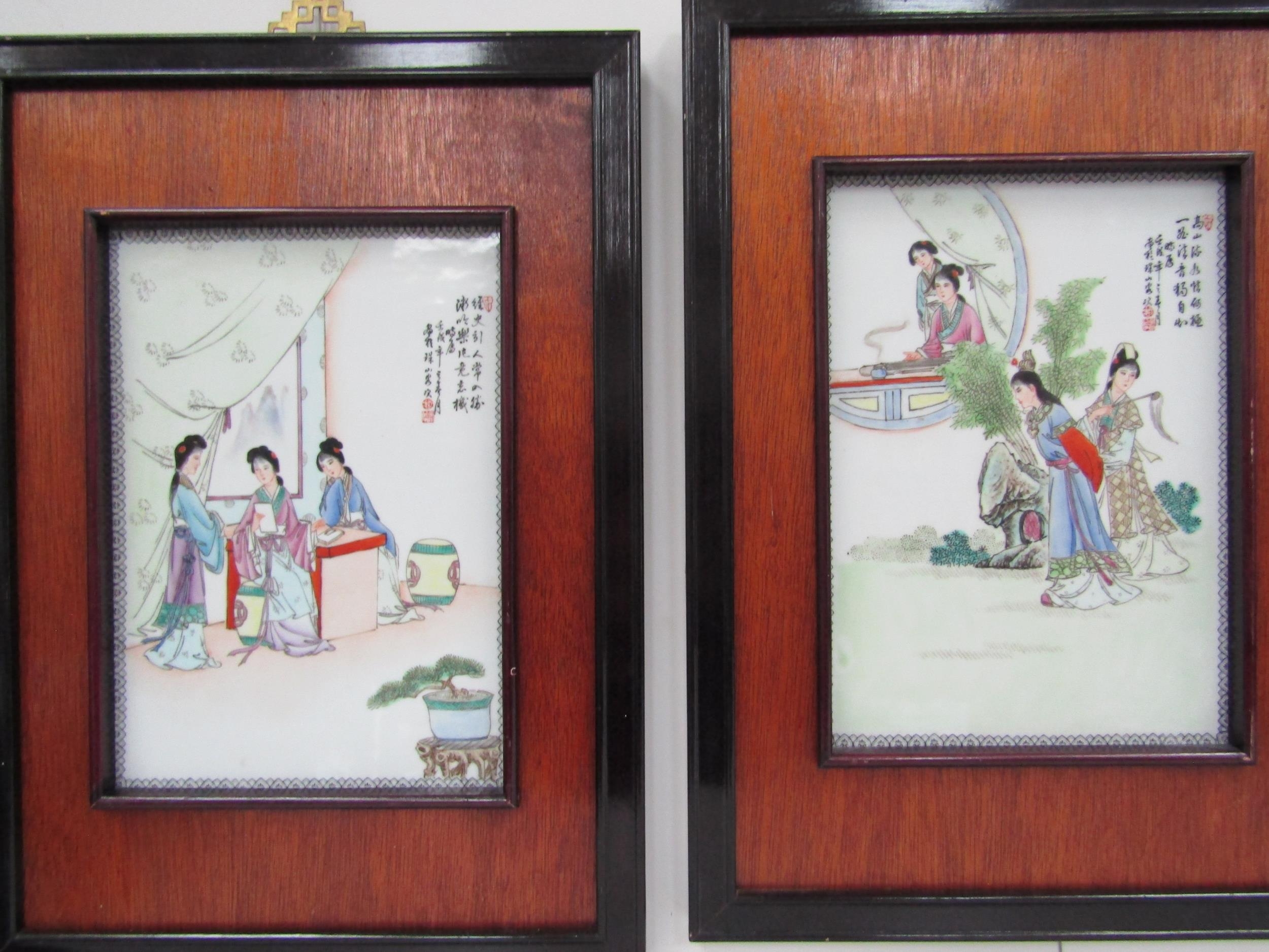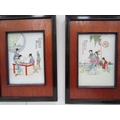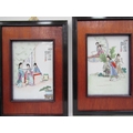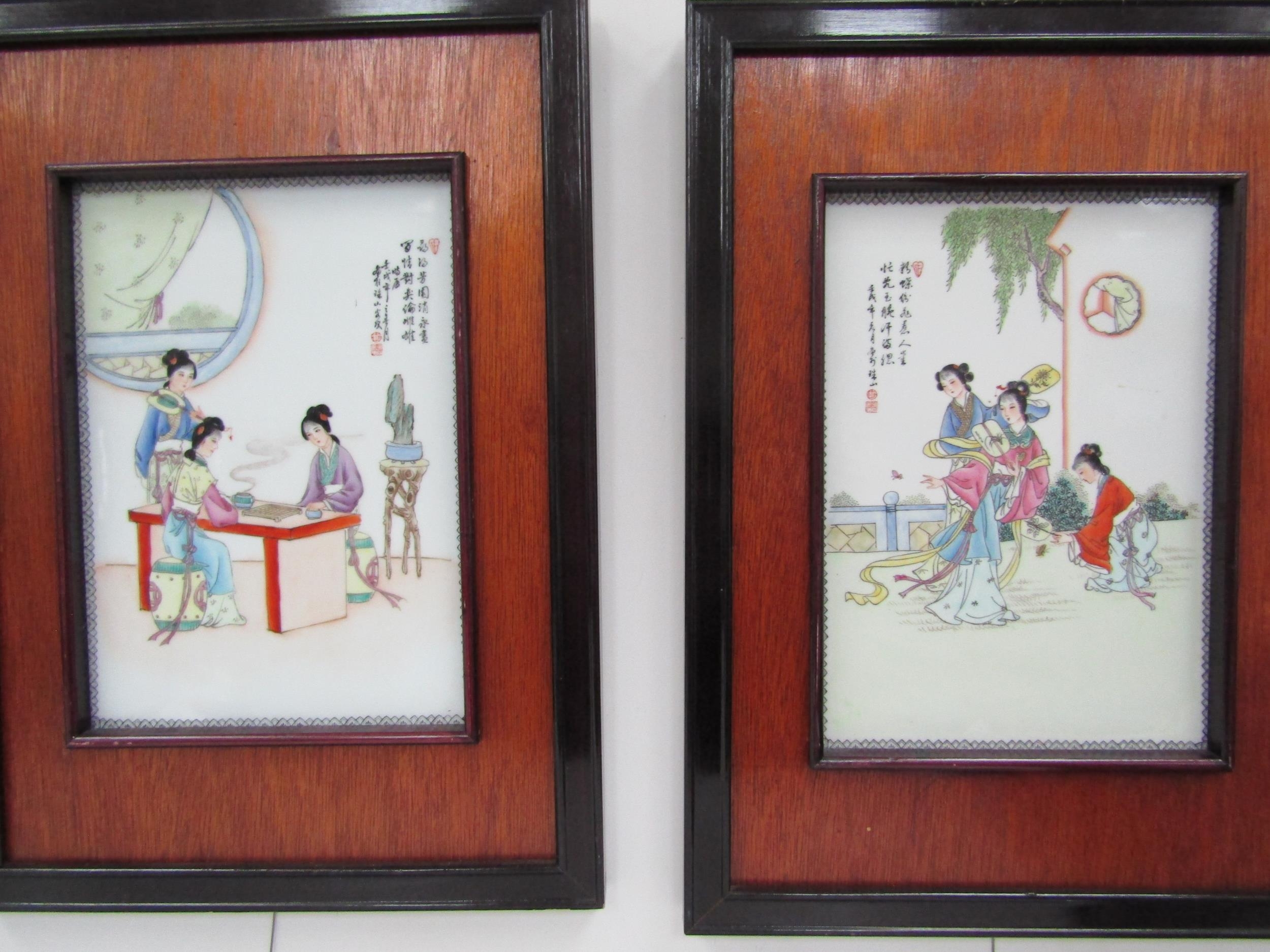 Four framed 20th Century Oriental decorative porcelain panels depicting tea ceremony and exterior scenes, 30cm x 21cm